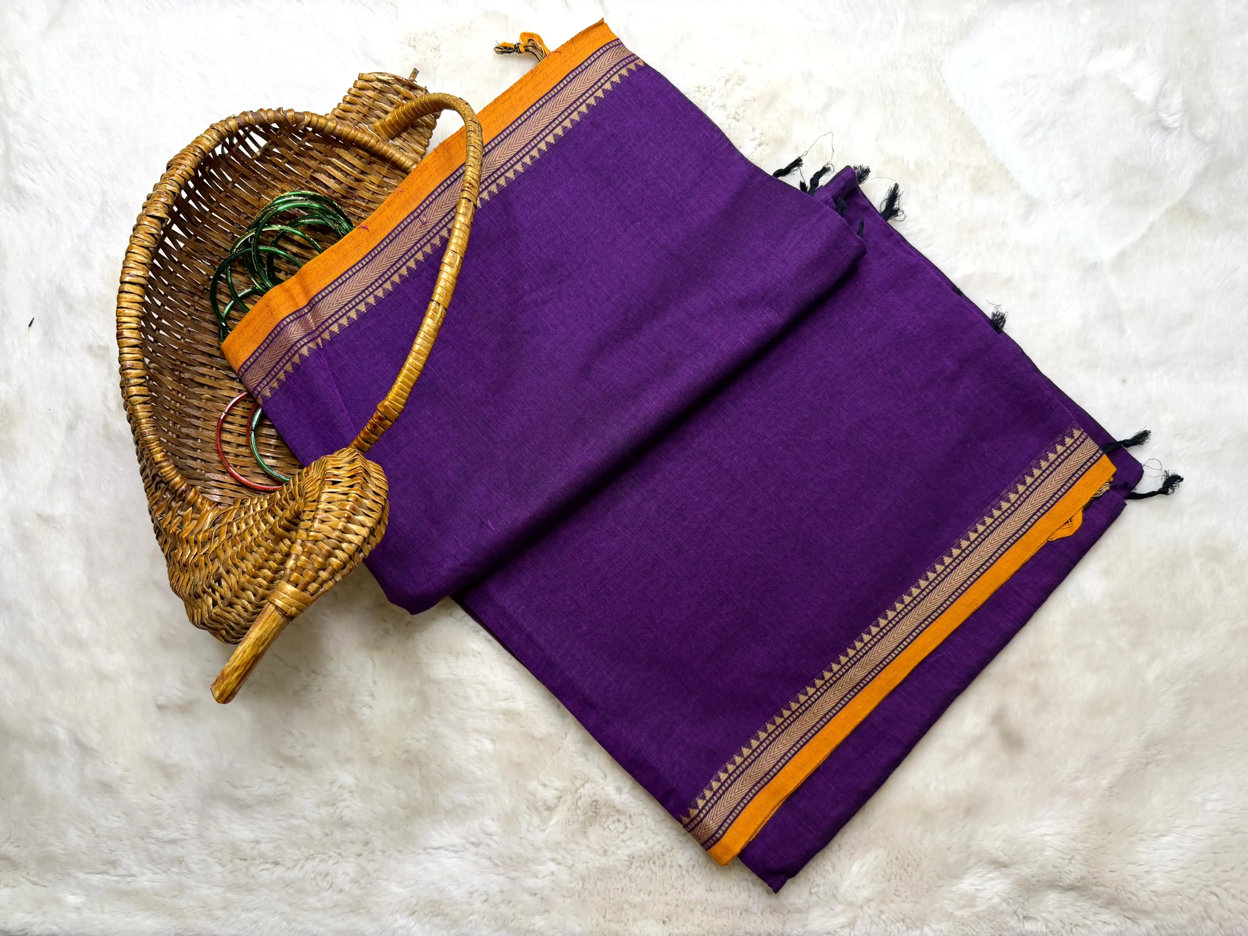 This purple with mustard yellow Dhaniakali cotton saree exudes a bold yet cultured charm. The deep purple drape sets a regal tone, while the mustard yellow border adds a warm, festive pop that enhances the sareeโs character.