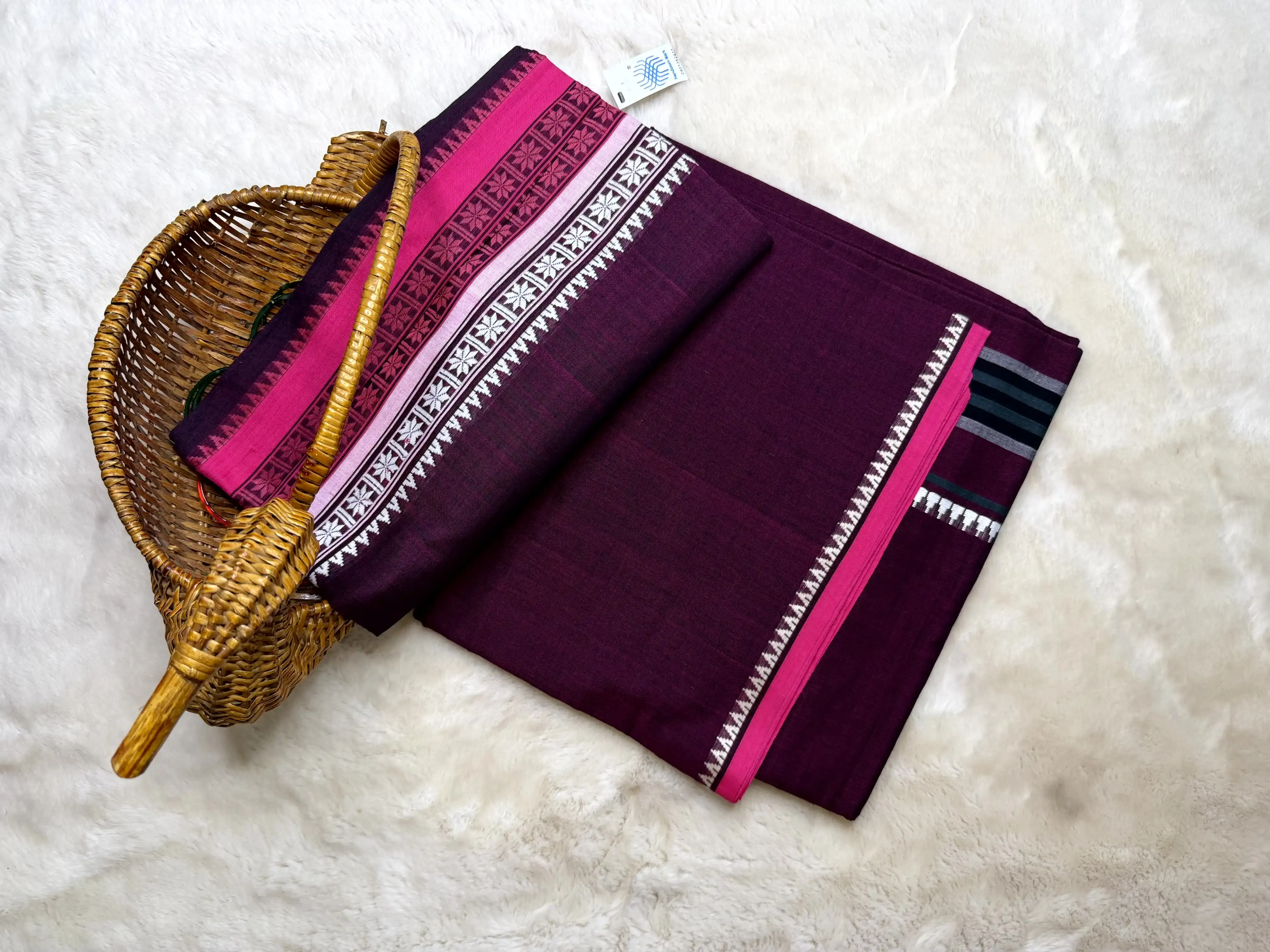 Purple with pink & white dhaniakali cotton saree