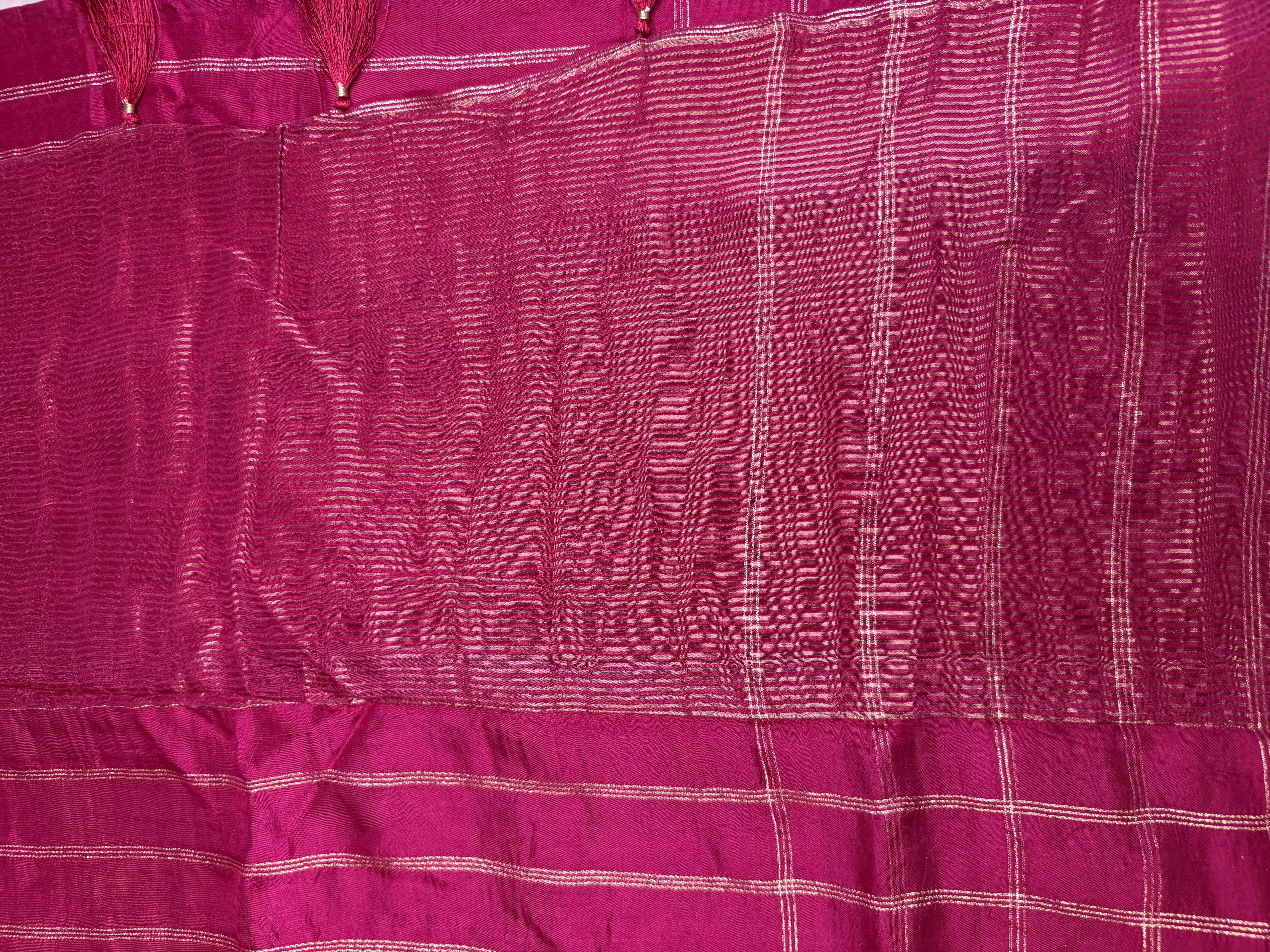 This Rani Pink Fancy Saree features bold big checks that add a striking yet graceful appeal. The rich, lively hue beautifully complements the textured Semi Tussar fabric, creating a look that’s festive, stylish, and effortlessly elegant.