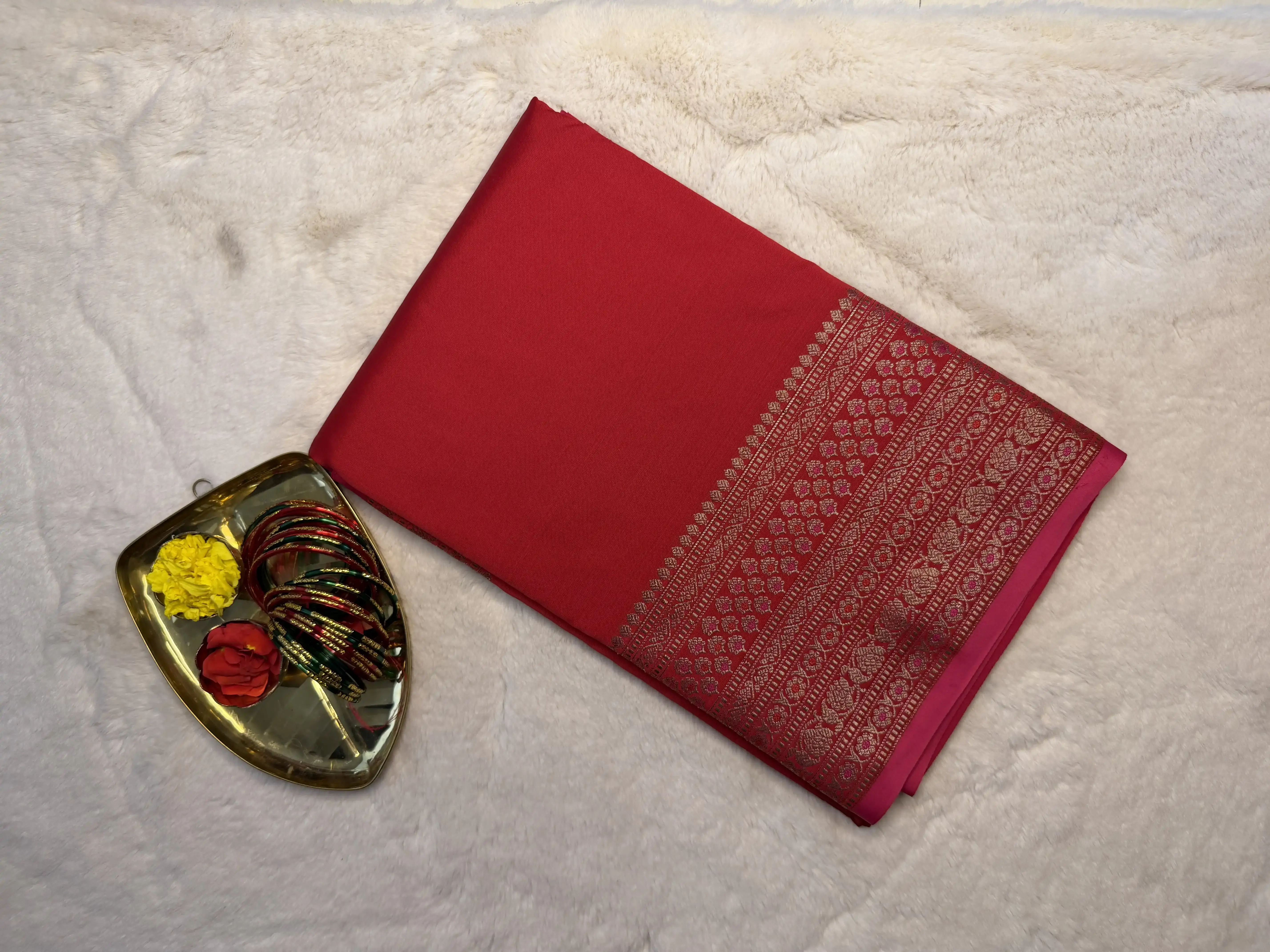 This rani pink Banaras saree features a long, richly woven border paired with a grand pallu, showcasing the exquisite heritage of Varanasi craftsmanship. The deep black base beautifully enhances the intricate zari work, creating a powerful contrast that exudes elegance and grandeur.