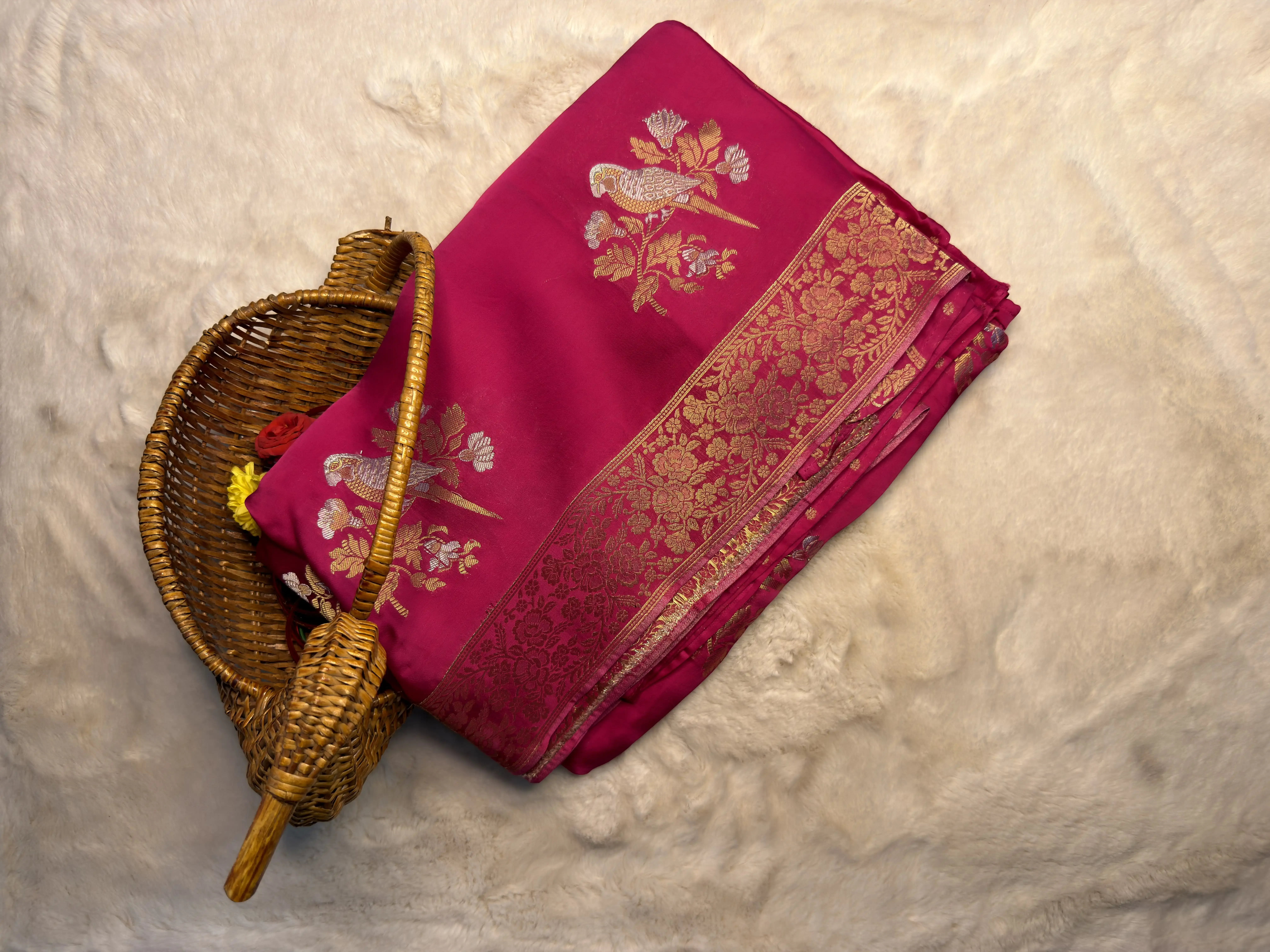 Rani Pink with Birds Motifs Mashru Silk Saree