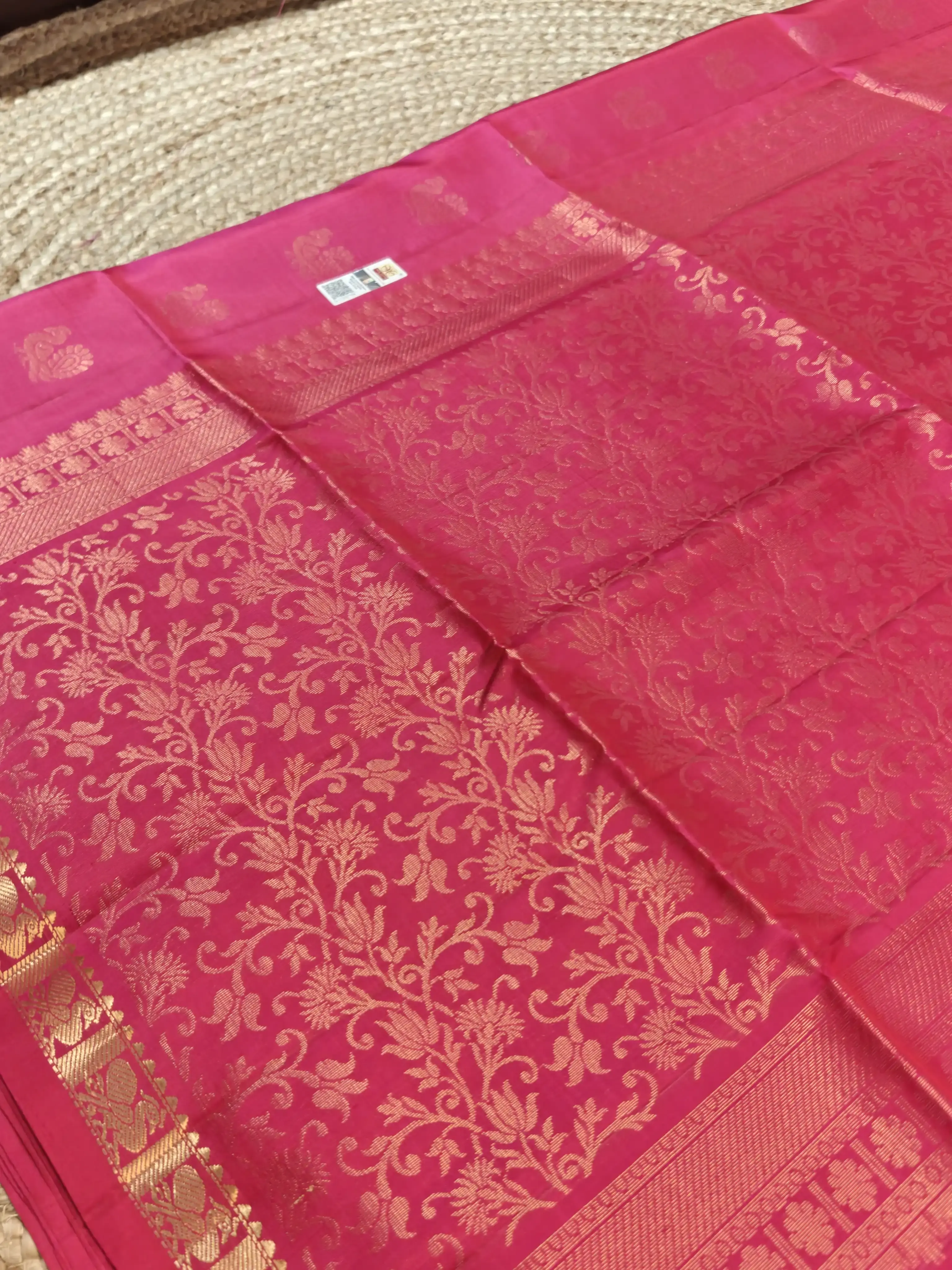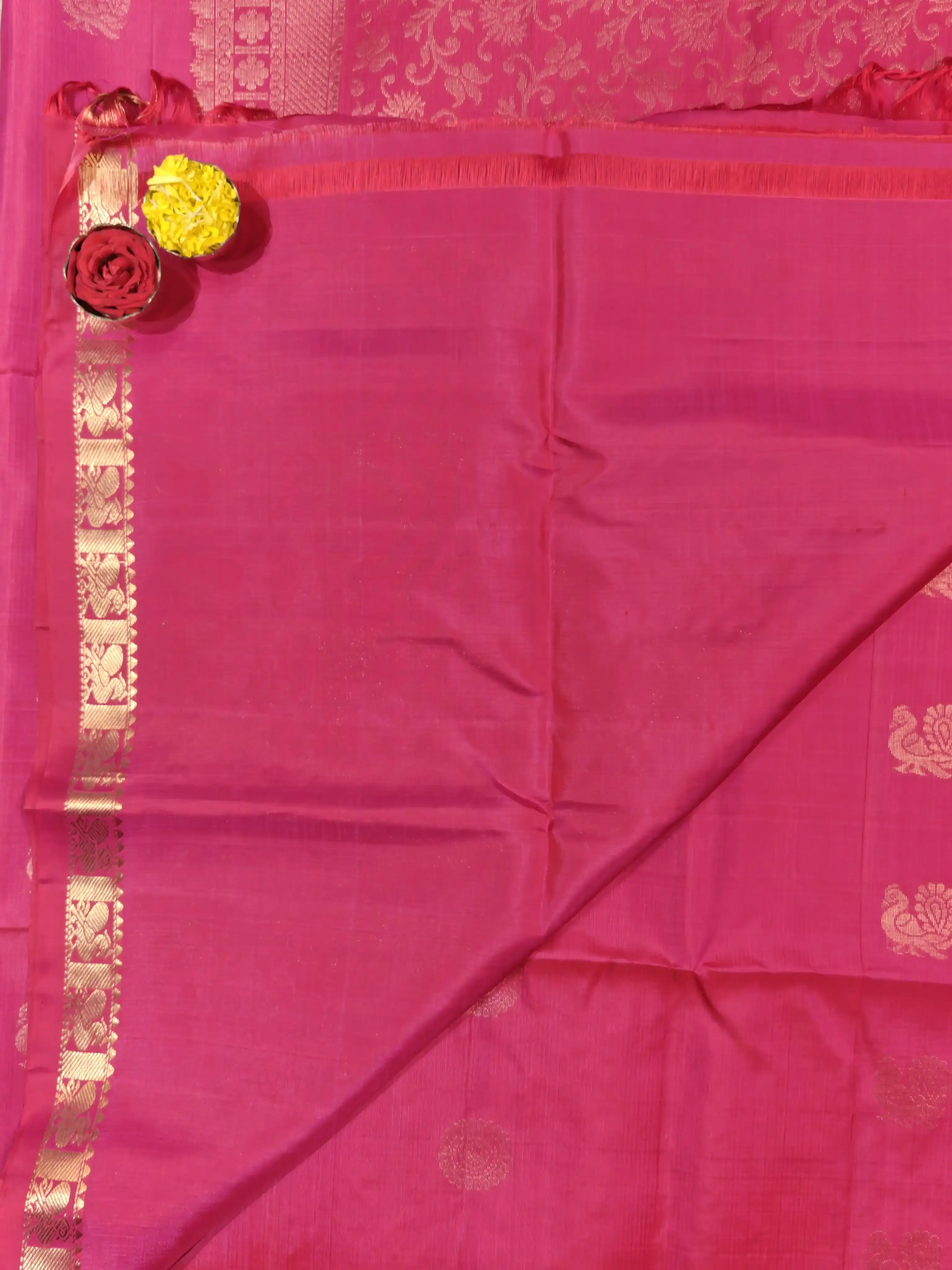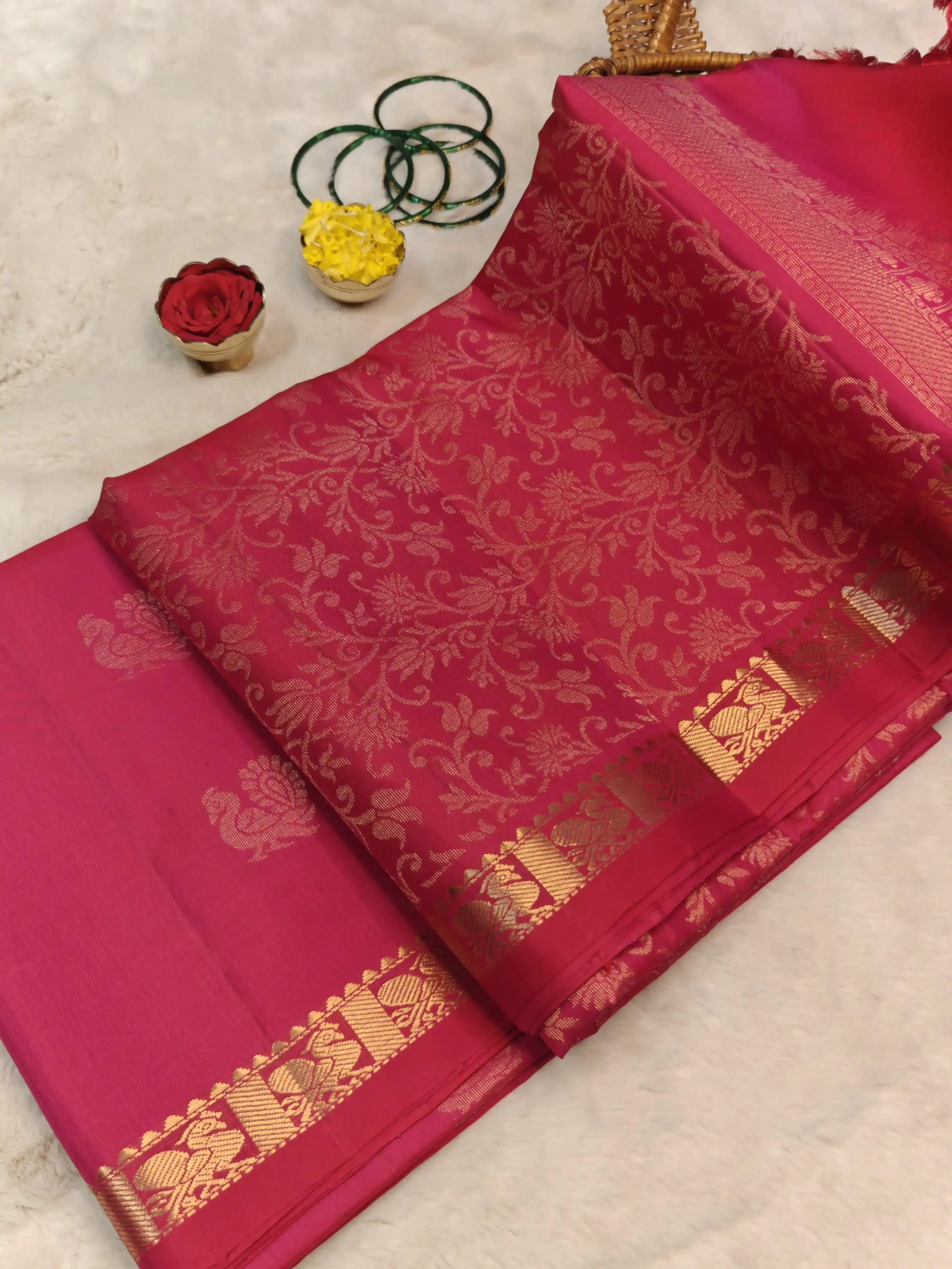 This Rani pink soft silk saree is beautifully adorned with elegant peacock motifs, symbolizing grace and prosperity. The rich, vibrant hue enhances its regal appeal, while the soft silk texture ensures a fluid drape and lasting comfort. Perfect for weddings, festive occasions, and traditional celebrations, this saree combines classic artistry with refined elegance, making it a timeless addition to any ethnic wardrobe.