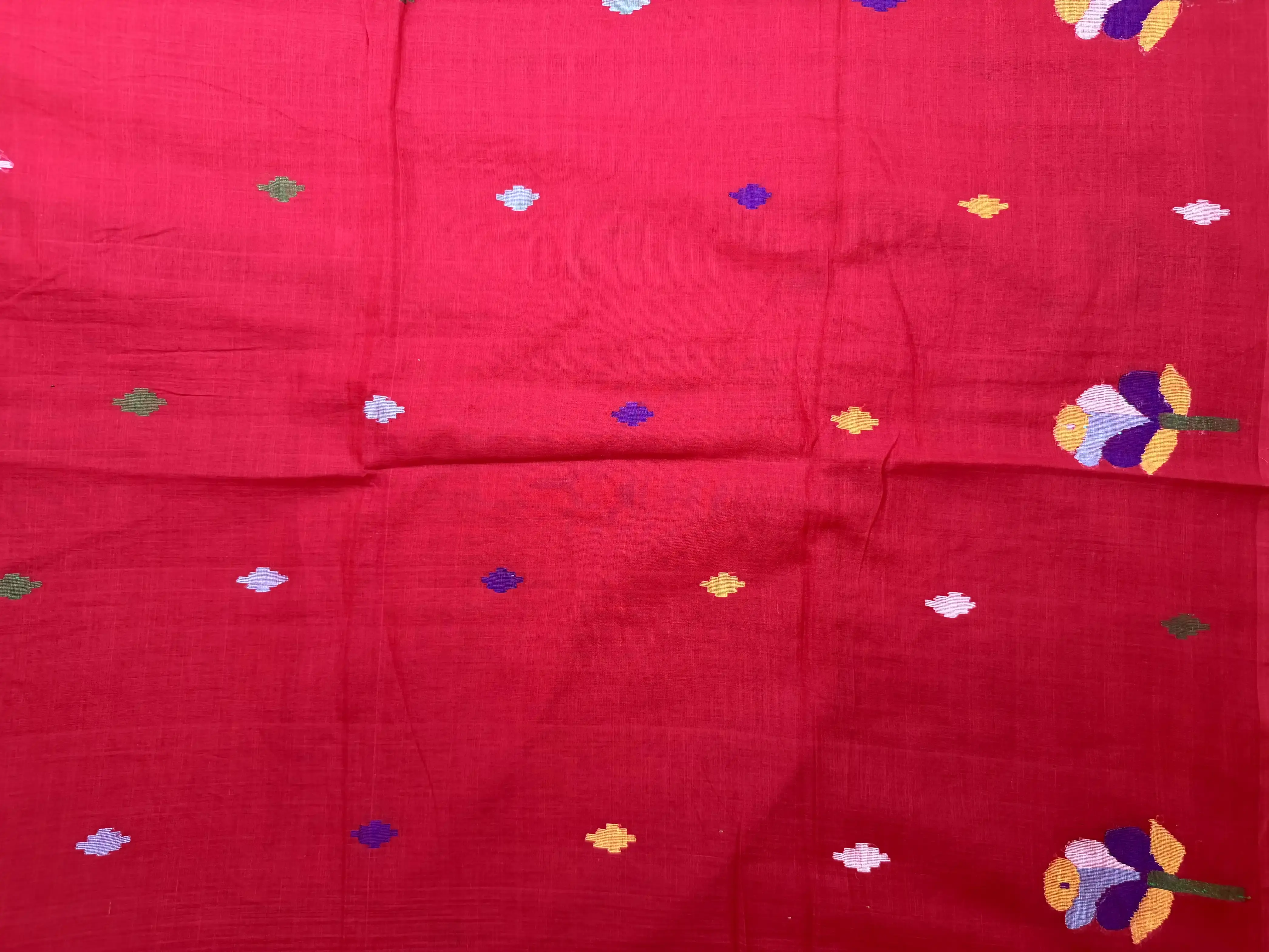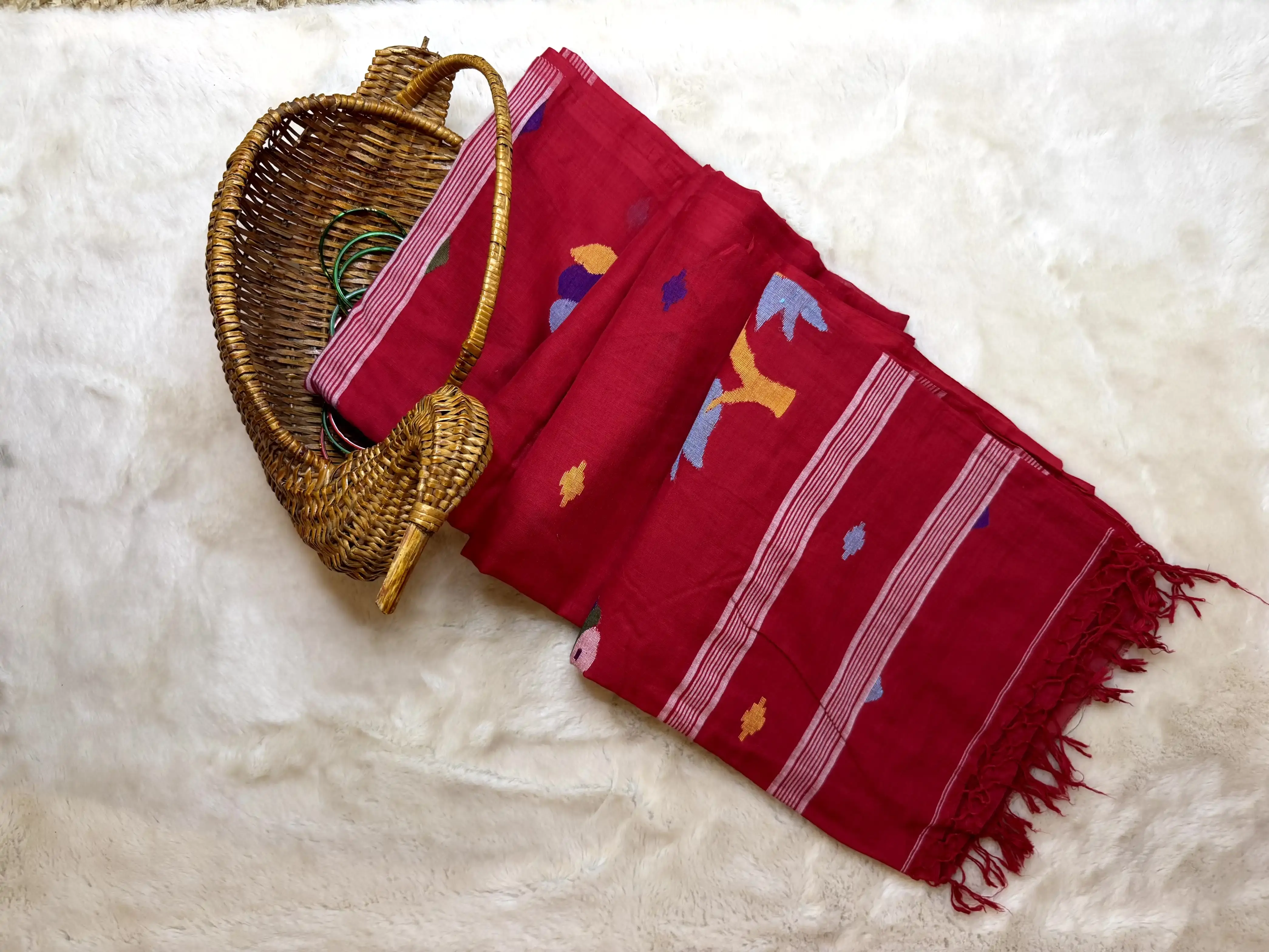 This red cotton saree showcases intricate Jamdhani work, blending traditional artistry with bold colour. Lightweight and breathable, it’s perfect for festive occasions, cultural gatherings, and everyday ethnic elegance — a timeless choice that celebrates heritage with vibrant charm ❤️🧵