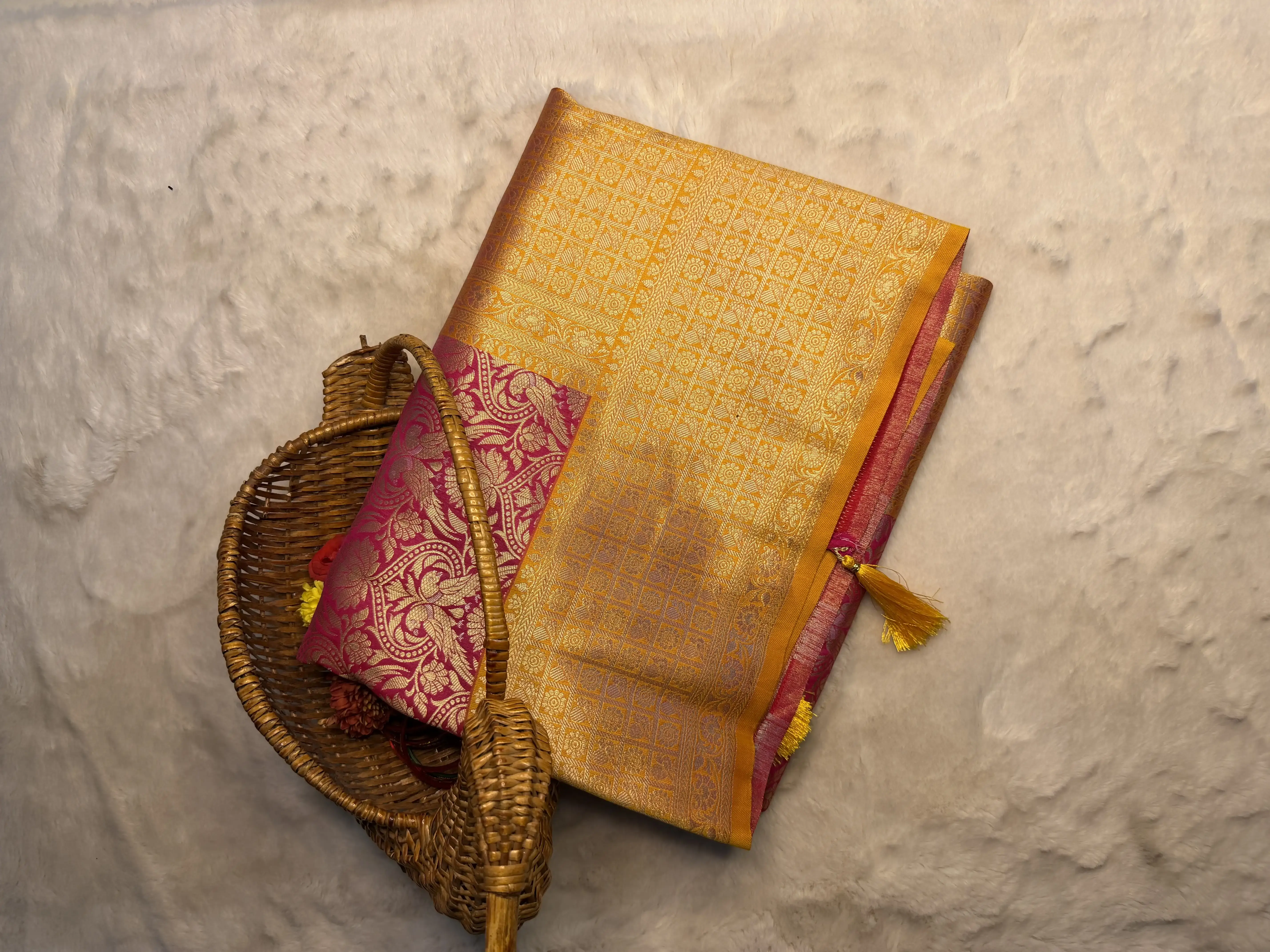 This red Benaras semi silk saree, accented with a bright yellow border, exudes festive elegance and timeless beauty—perfect for making a graceful statement at any celebration. ❤️💛