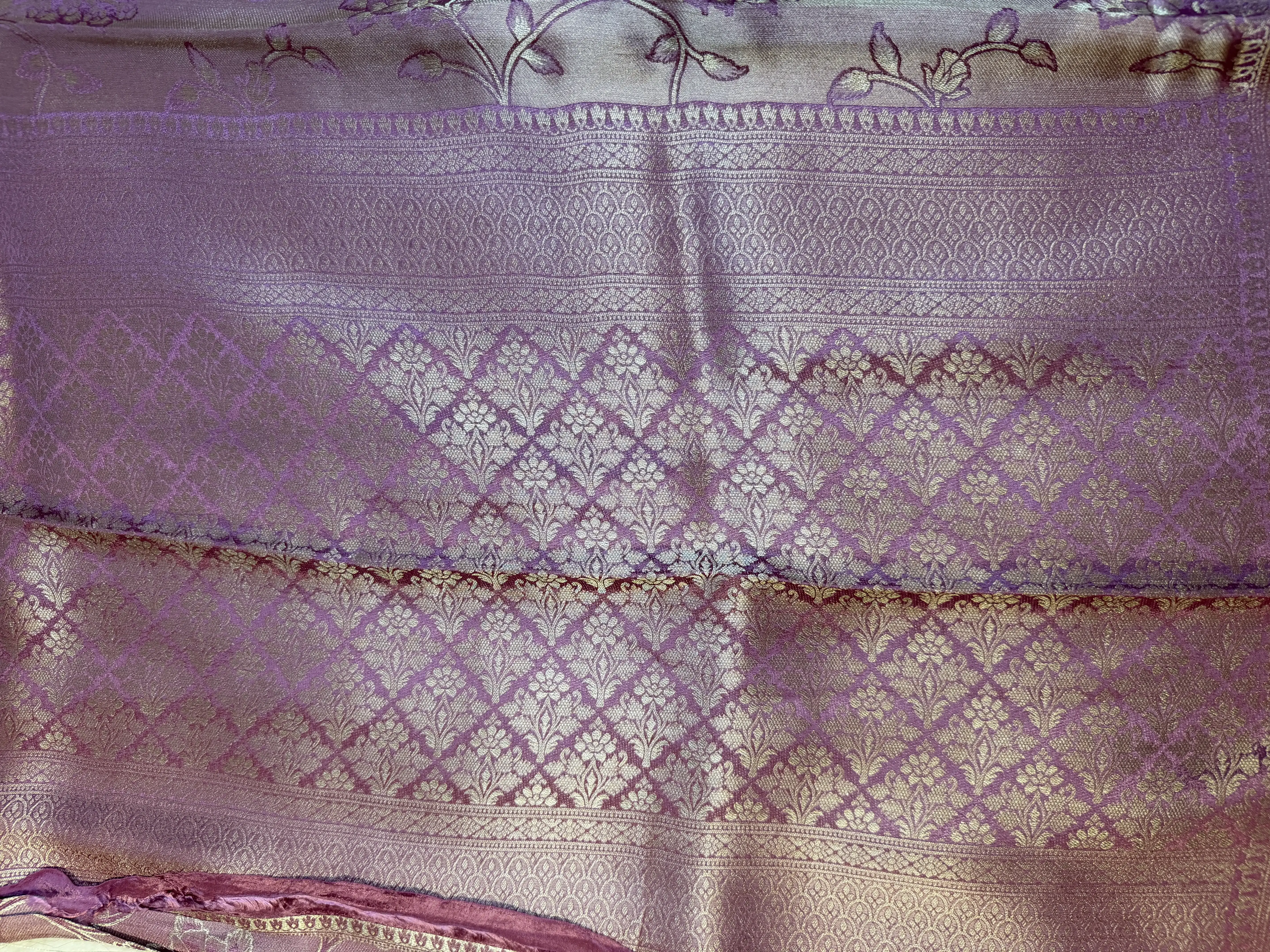 This Rose Pink Tissue satin semi Silk saree is adorned with an intricate jaal pattern that adds richness and regal charm to every drape. The subtle sheen of tissue paired with the graceful weave creates a look that’s festive, feminine, and timeless.