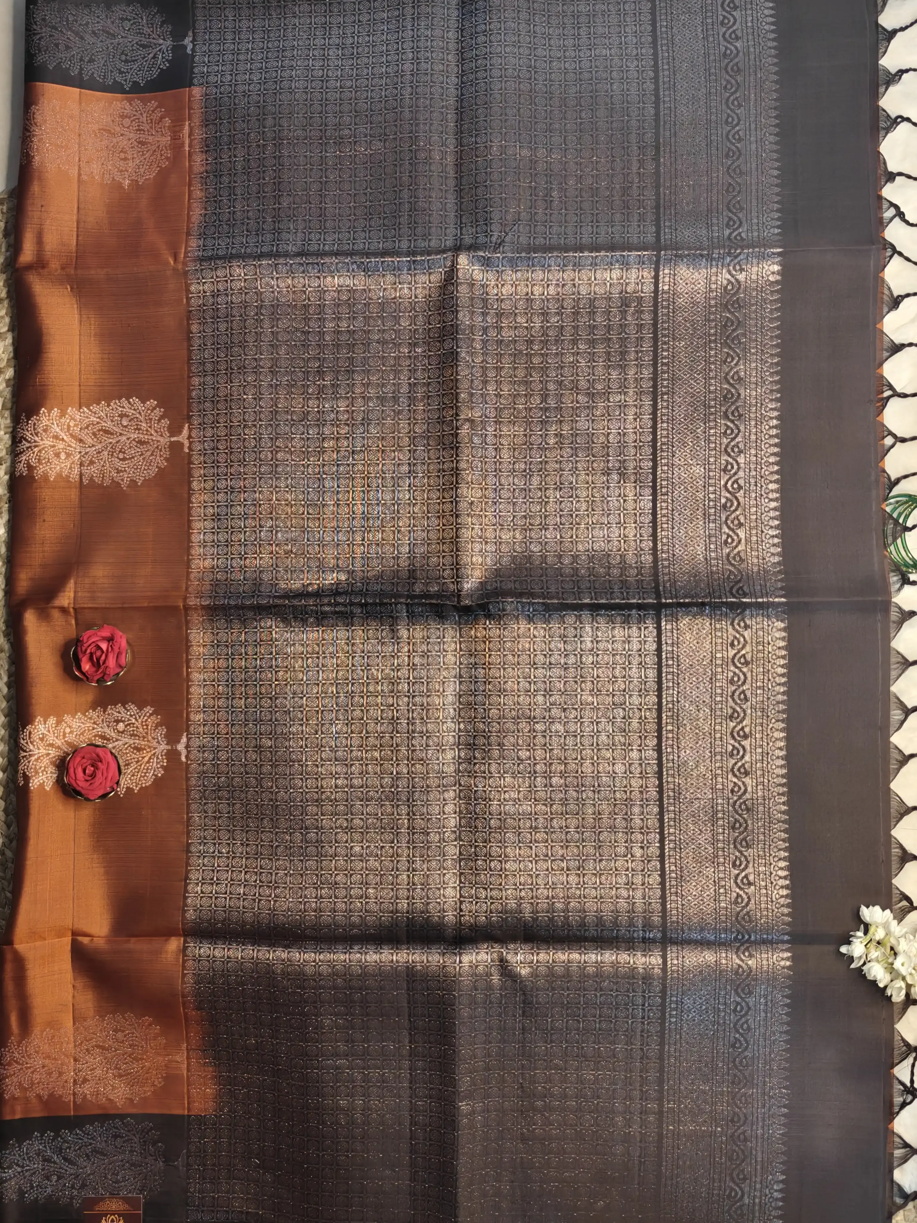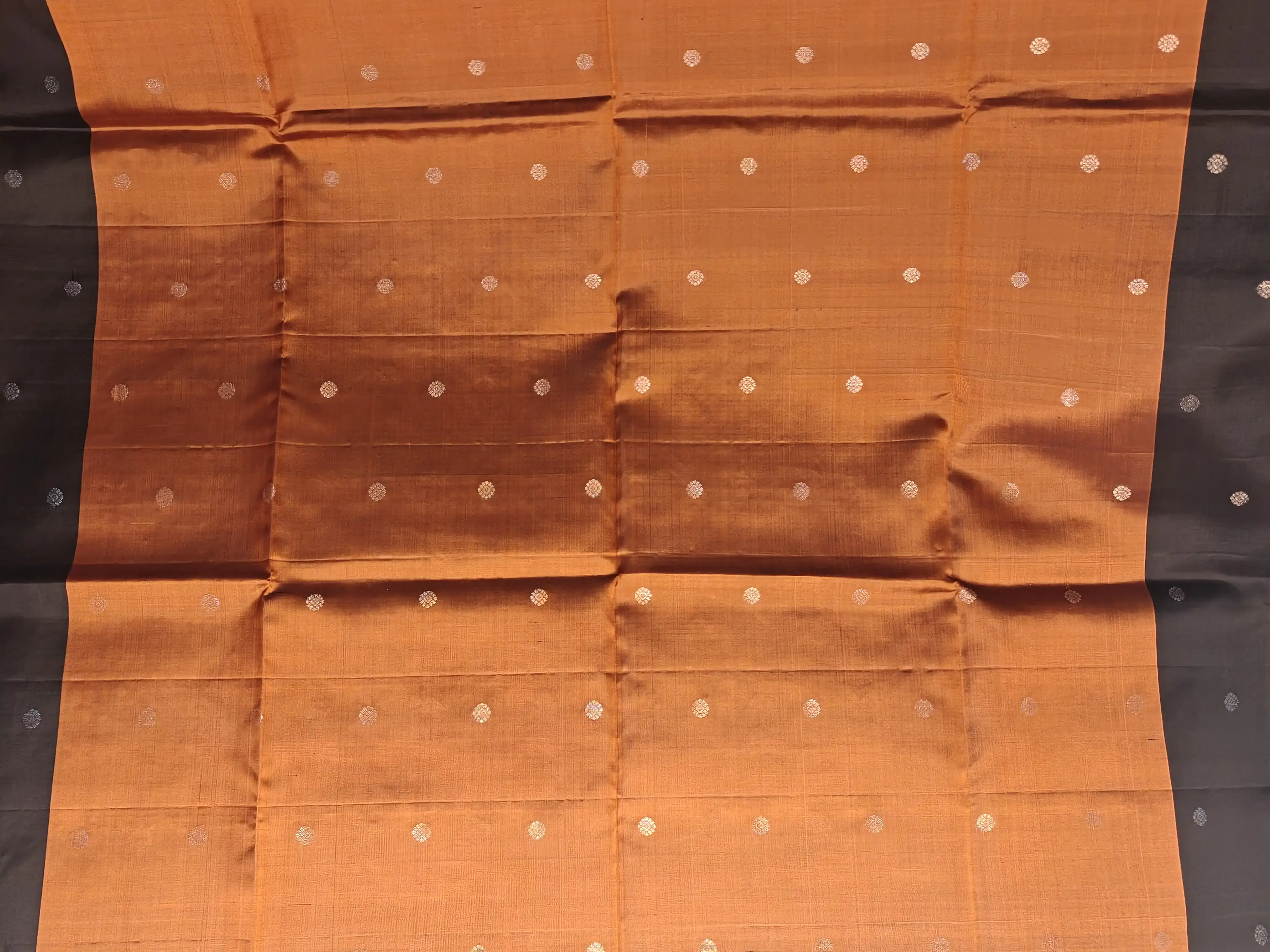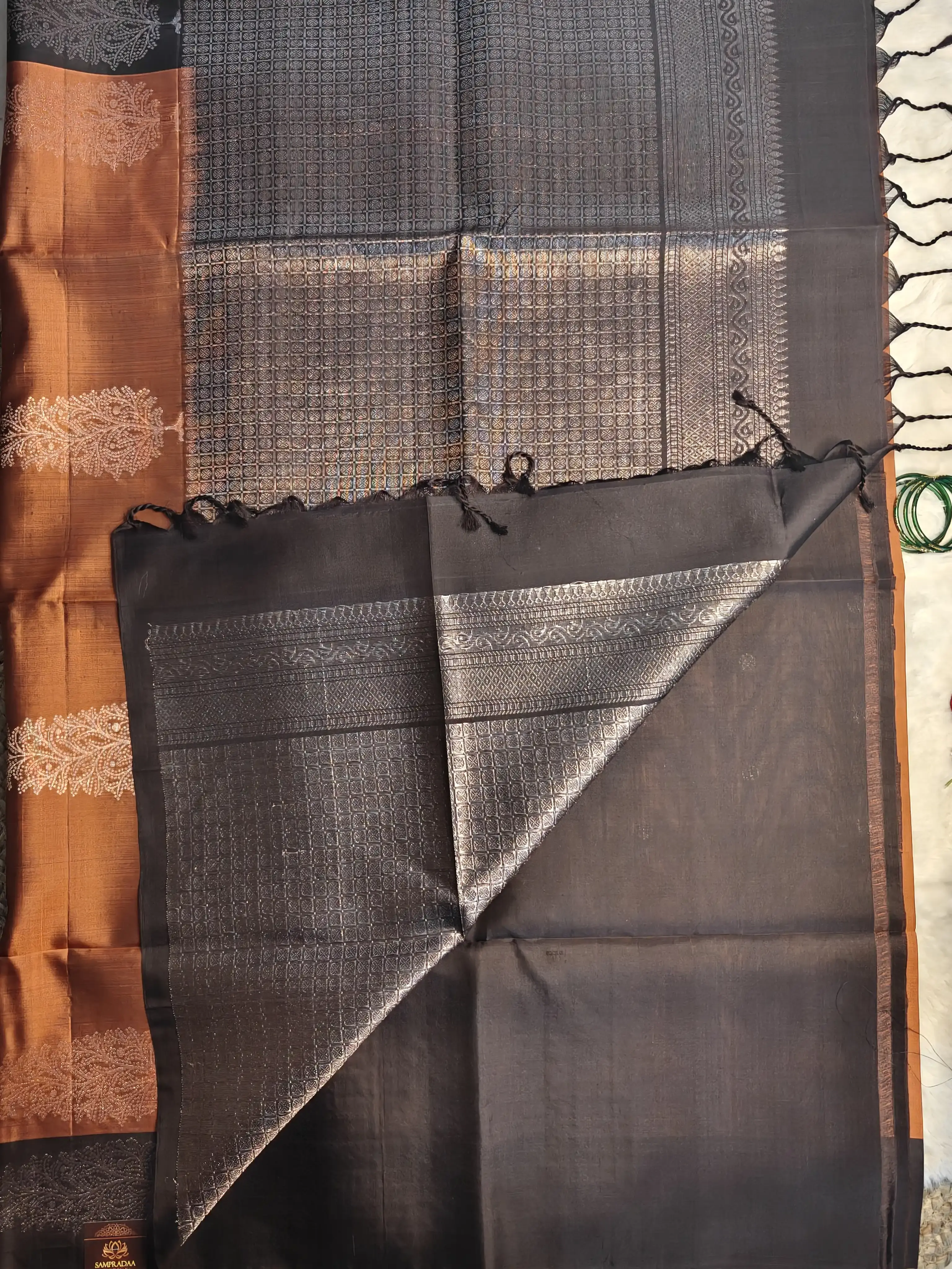 Make a striking impression with our Rust Orange Soft Silk Saree featuring a bold black border and elegant silver motifs — a perfect fusion of earthy richness and contemporary sophistication. The warm rust orange body radiates depth and vibrance, while the contrasting black border frames the saree with timeless elegance and strength.