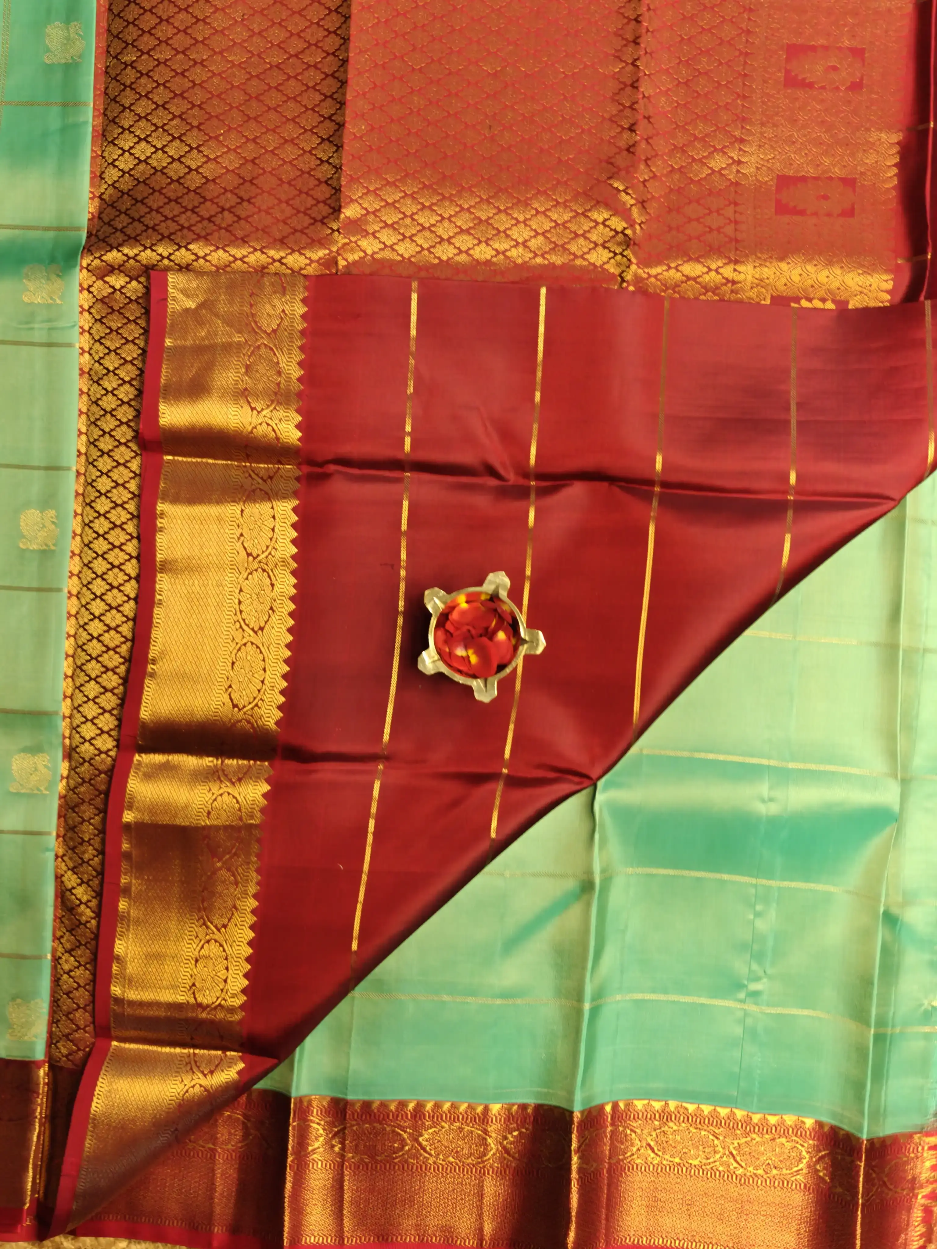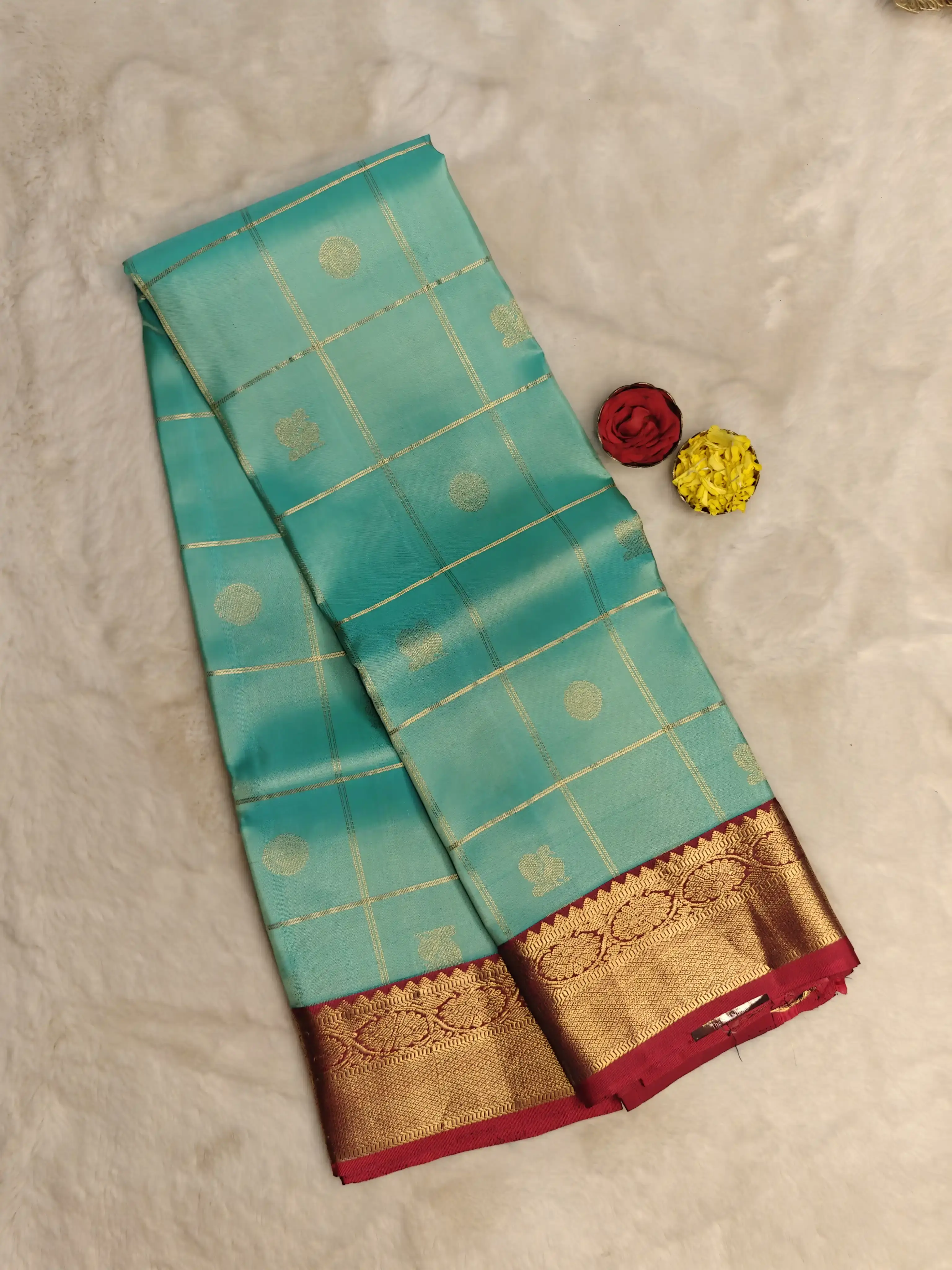 This graceful sea green silk saree features classic checks across the body, beautifully contrasted with a deep maroon border that adds richness and depth. The look is elevated by a luxurious maroon pallu, lending festive grandeur and timeless appeal. Perfect for weddings, celebrations, and traditional gatherings, this saree is a stunning expression of heritage woven in refreshing hues 💚❤️