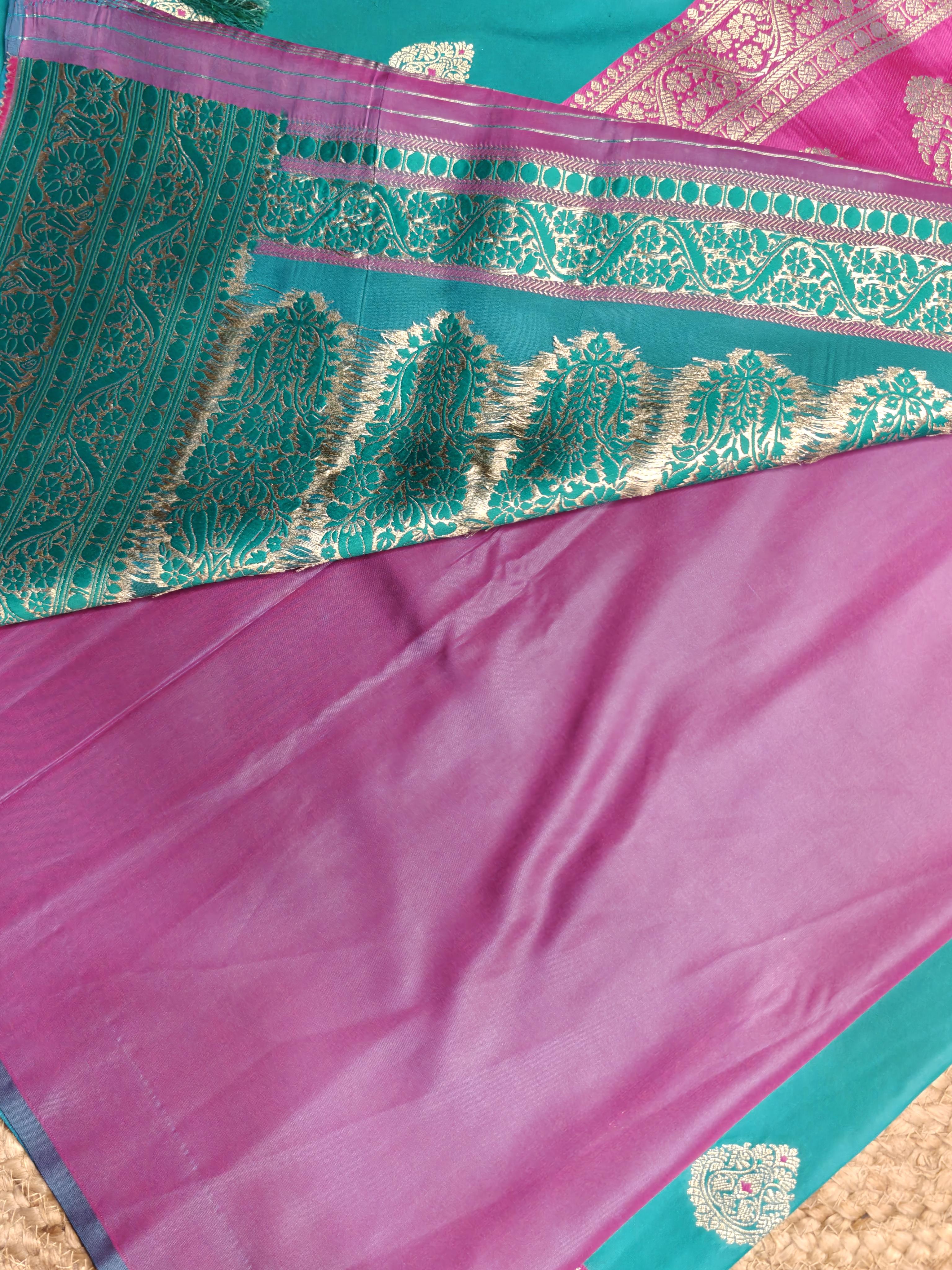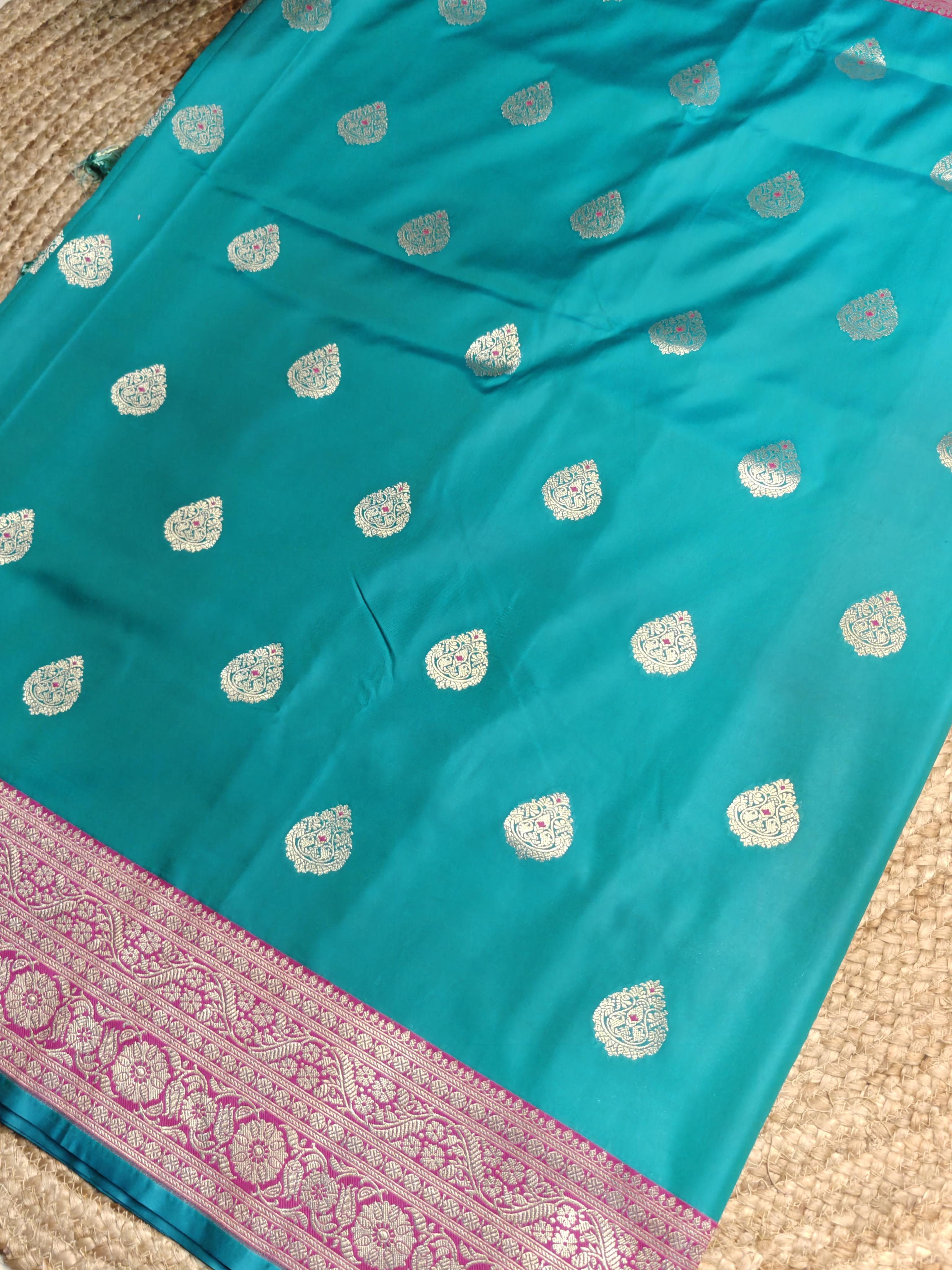 This stunning sea green Banarasi silk saree is beautifully enhanced with a rich Rani pink border, creating a striking yet elegant contrast. The look is elevated by a grand, richly woven pallu that reflects the timeless artistry of Banaras. Perfect for weddings, festive occasions, and heirloom celebrations, this saree is a true expression of regal charm and classic sophistication 💚💖