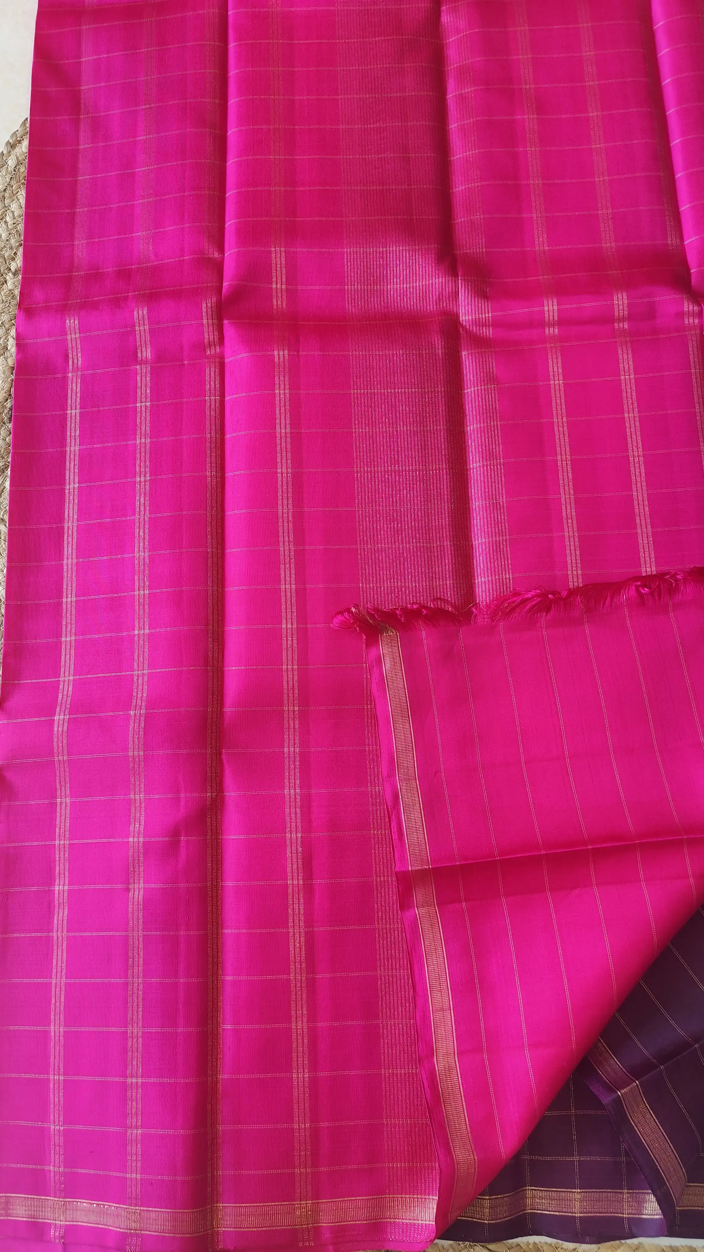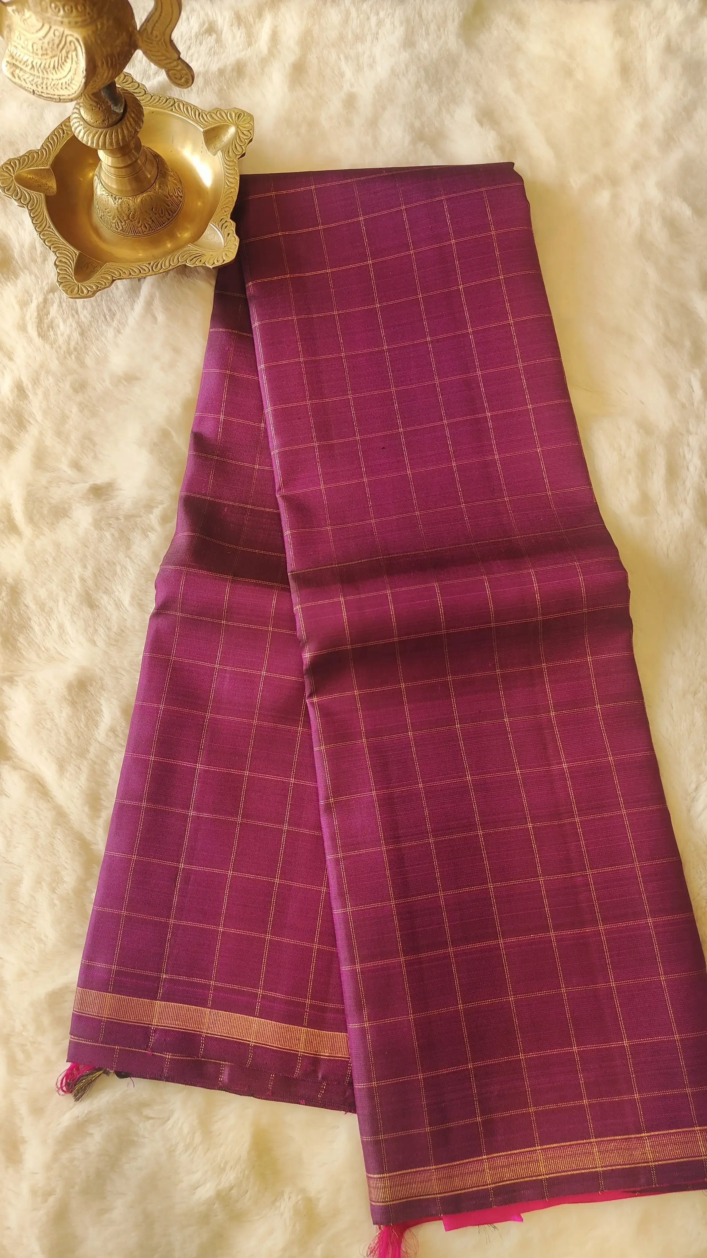 Wine checks saree with pink pallu Pure kanchipuram silk saree