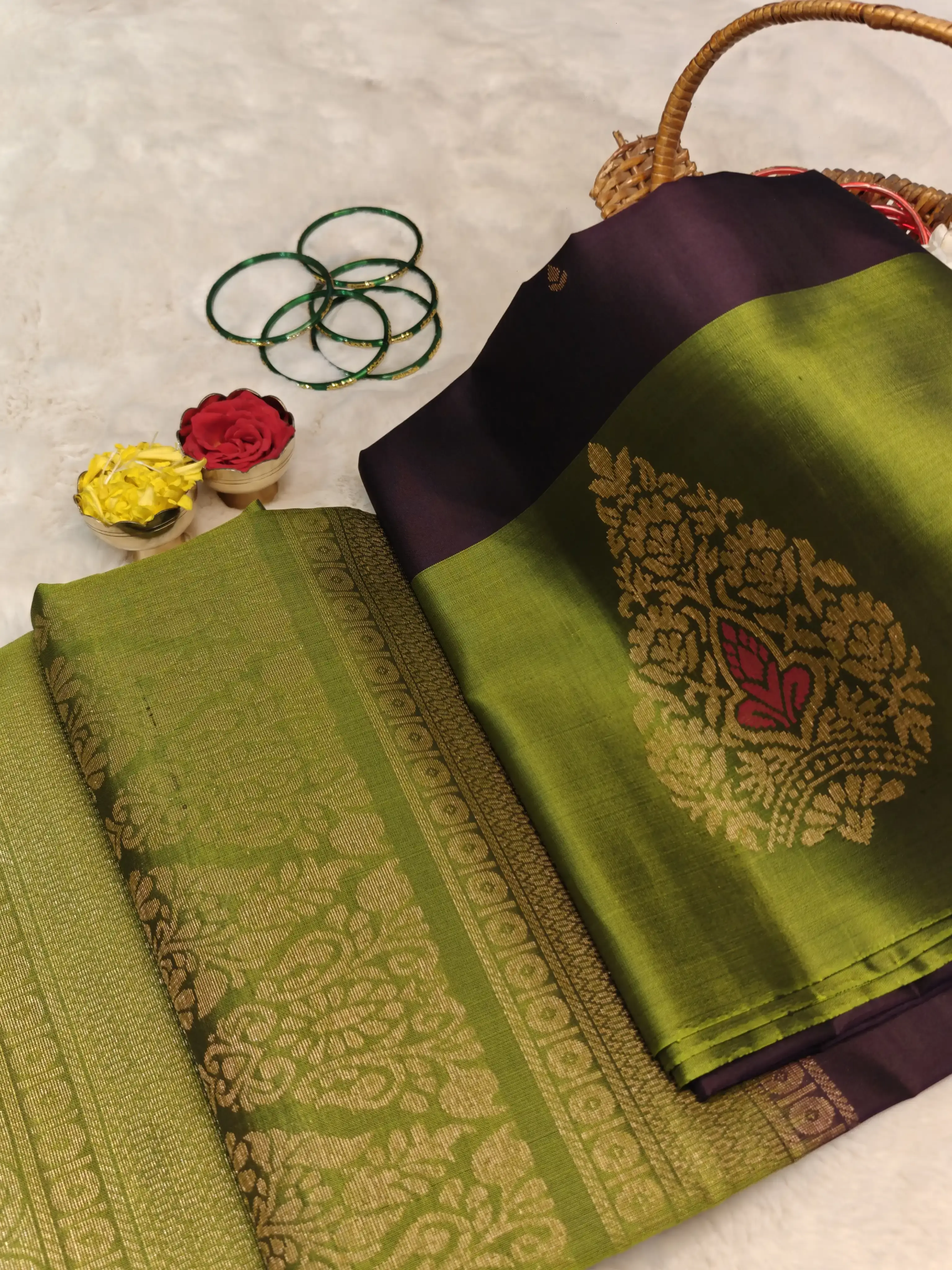 This wine-coloured soft silk saree is beautifully highlighted by a contrasting green border, adorned with bold, intricate motifs that add grandeur and traditional charm. Elegant and refined, this saree is perfect for weddings, festive occasions, and celebrations that call for enduring sophistication ๐ท๐