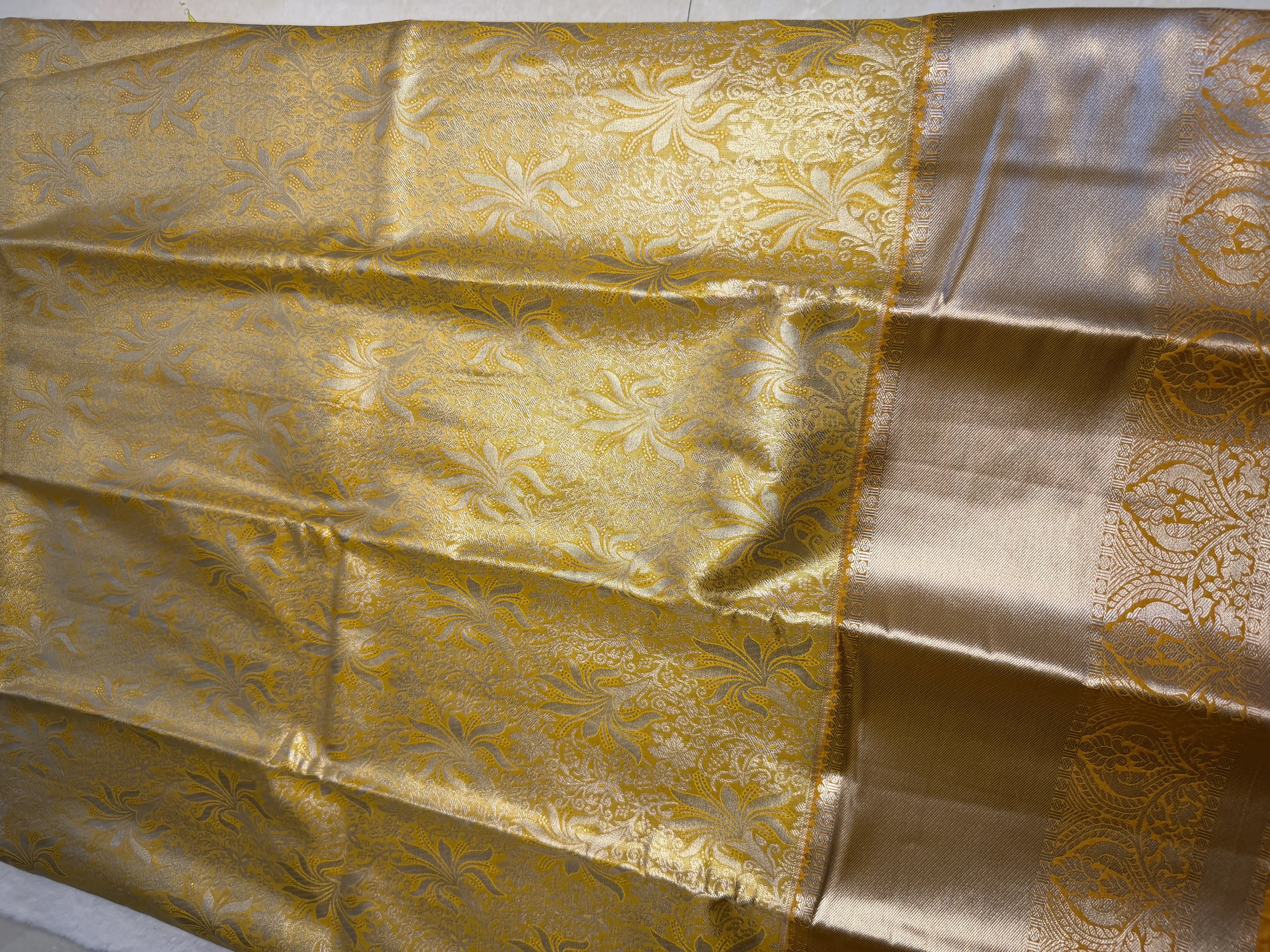This yellow & gold tissue semi-silk saree is highlighted by a bold, richly woven border, adding grandeur and celebratory charm. The luminous tissue texture paired with the soft drape of semi-silk creates an elegant sheen, while the vibrant yellow base beautifully complements the golden accents.