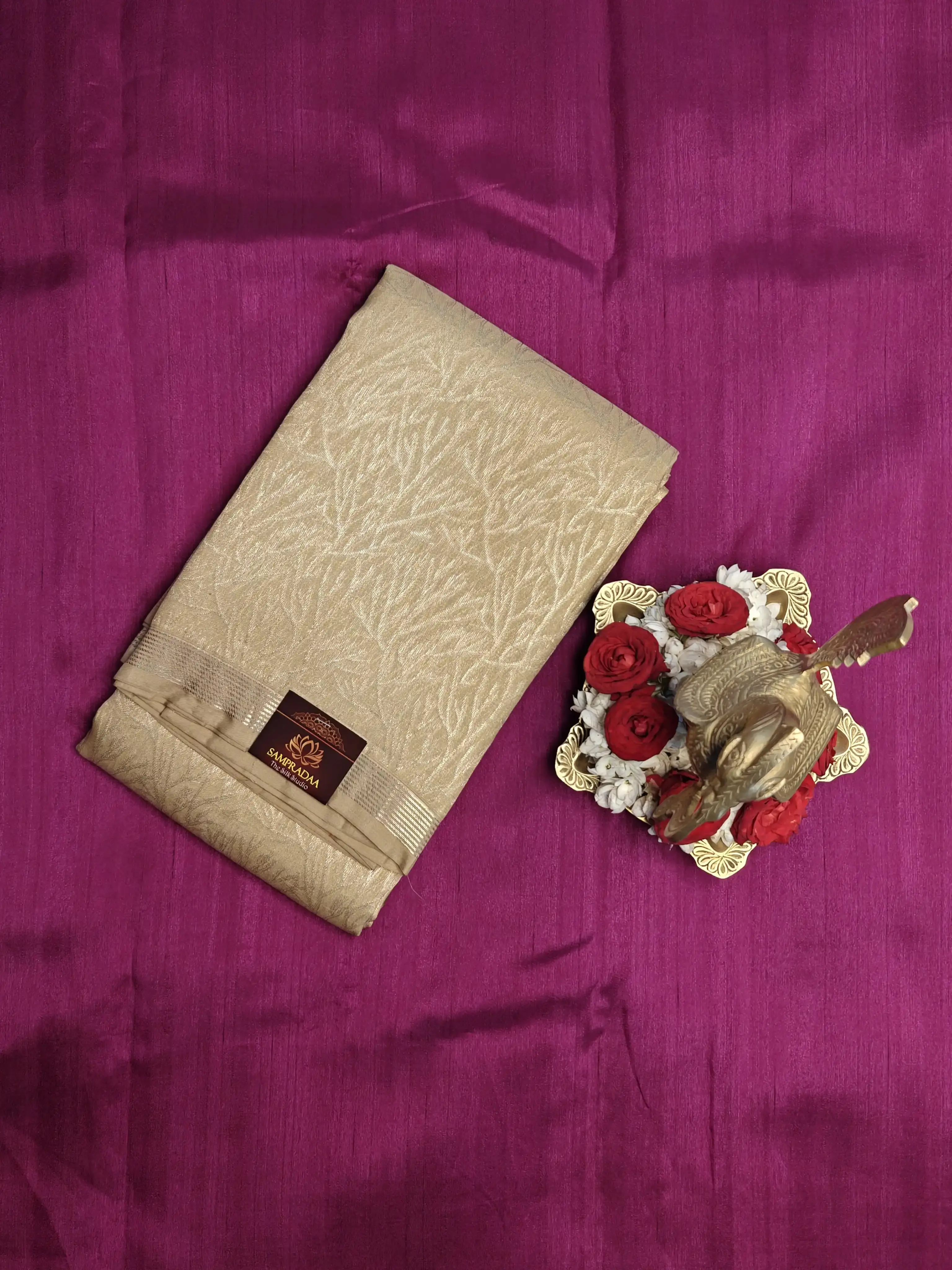 An elegant beige silk saree featuring a subtle self design that enhances its understated beauty. The soft sheen of the silk and the tone-on-tone patterns create a refined, graceful look, making it an ideal choice for weddings, festive gatherings, and sophisticated day occasions.