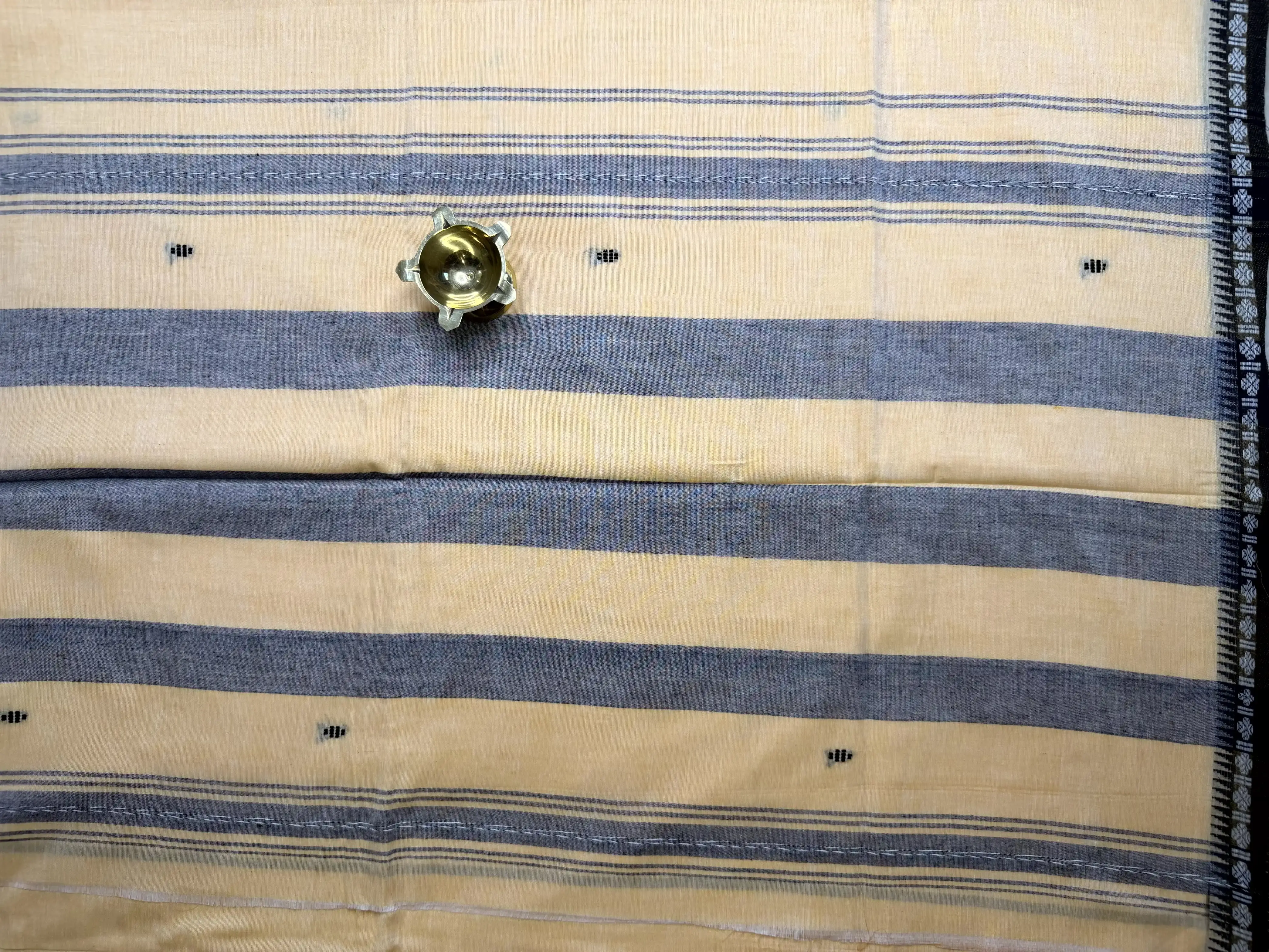This beige Dhaniakhali cotton saree is adorned with black buttas all over the body, offering a refined minimal aesthetic. The calm beige base brings a soft elegance, while the black motifs add a bold traditional touch that makes the weave stand out beautifully.