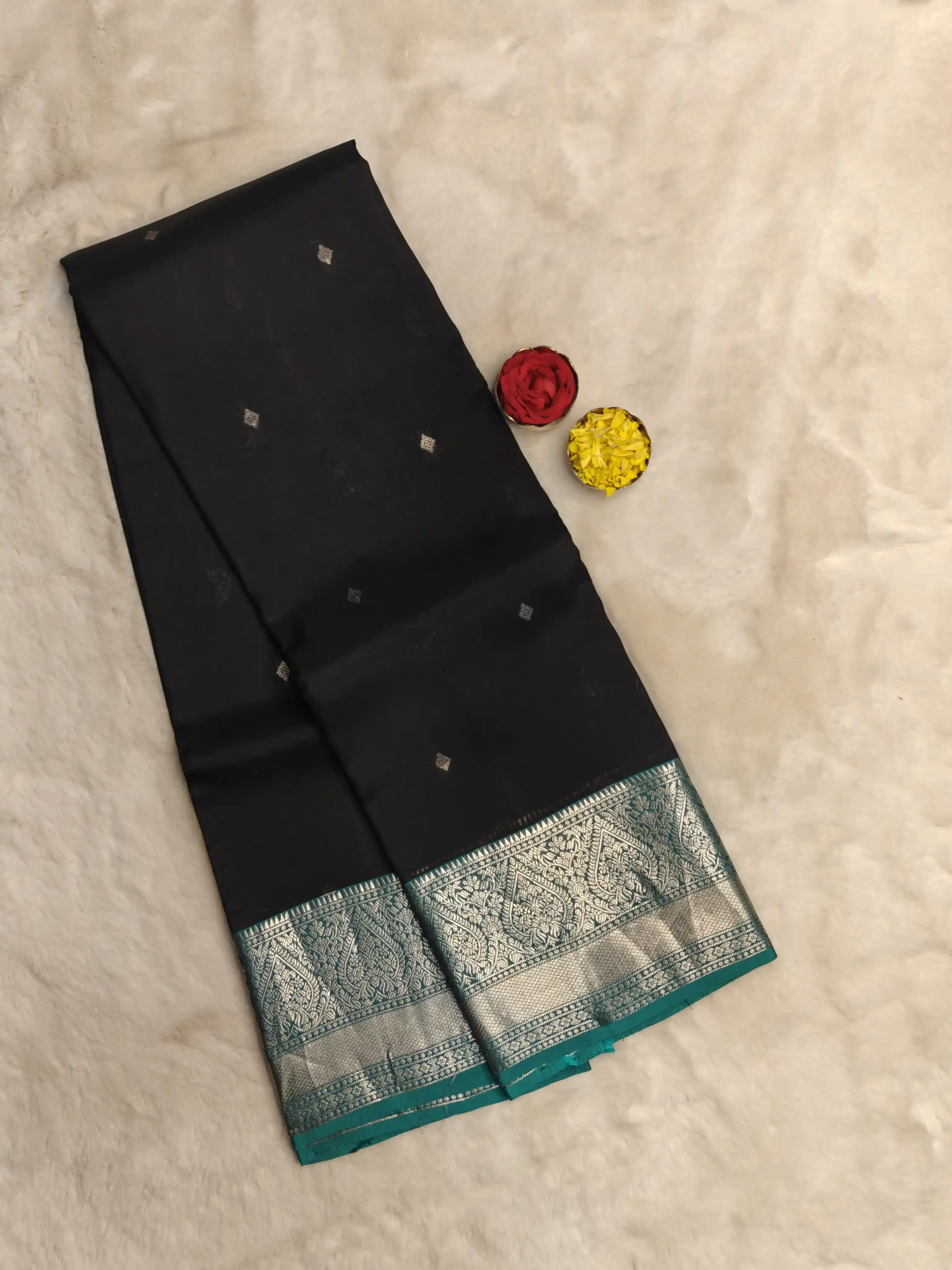 This classic black silk saree is adorned with delicate small silver motifs scattered gracefully across the body, adding a subtle shimmer. The look is beautifully framed by a teal blue border, creating a rich contrast that elevates the saree’s sophistication. Perfect for evening celebrations, festive occasions, and timeless ethnic style, this saree blends boldness with understated elegance 🖤💙✨
