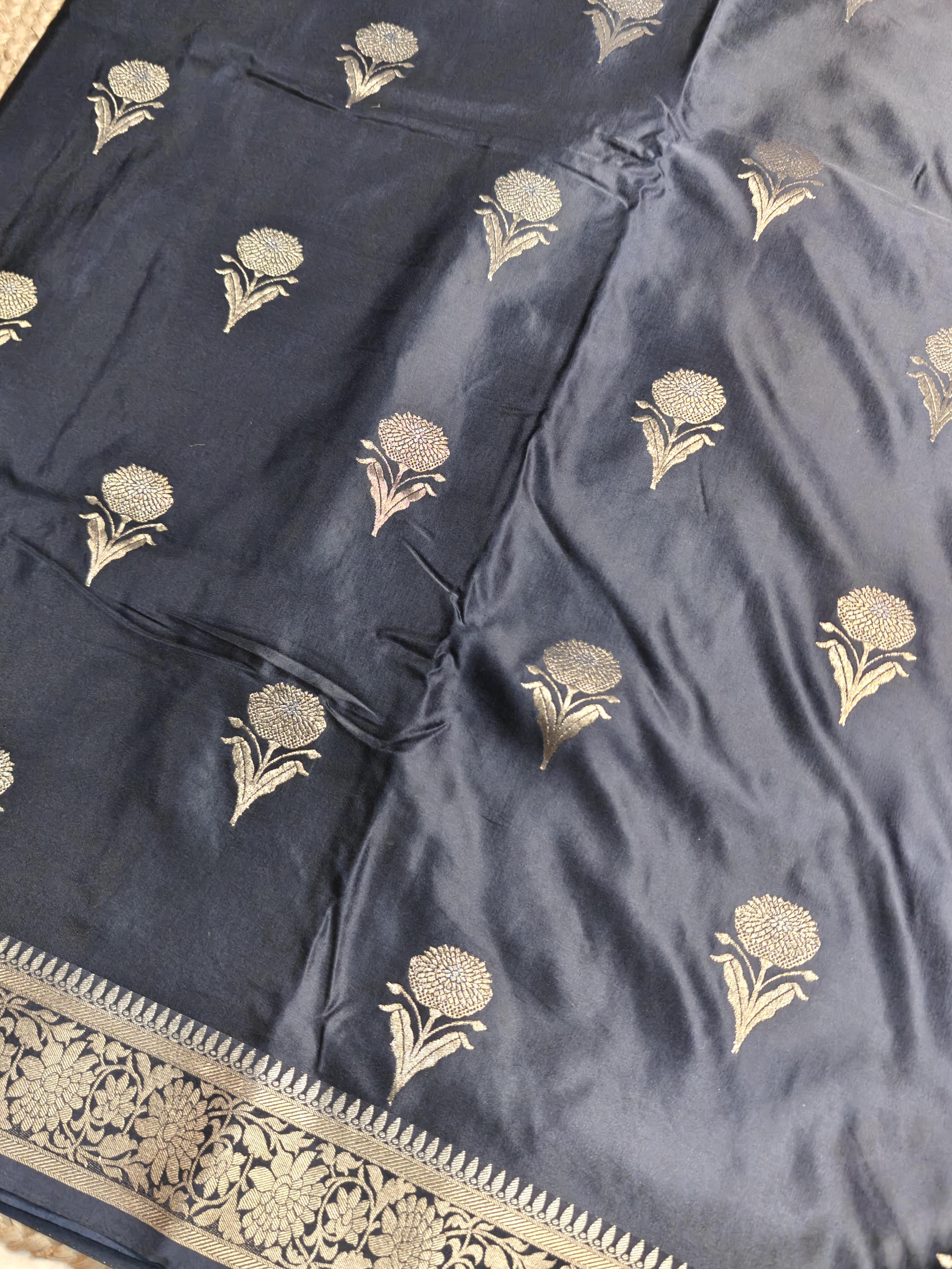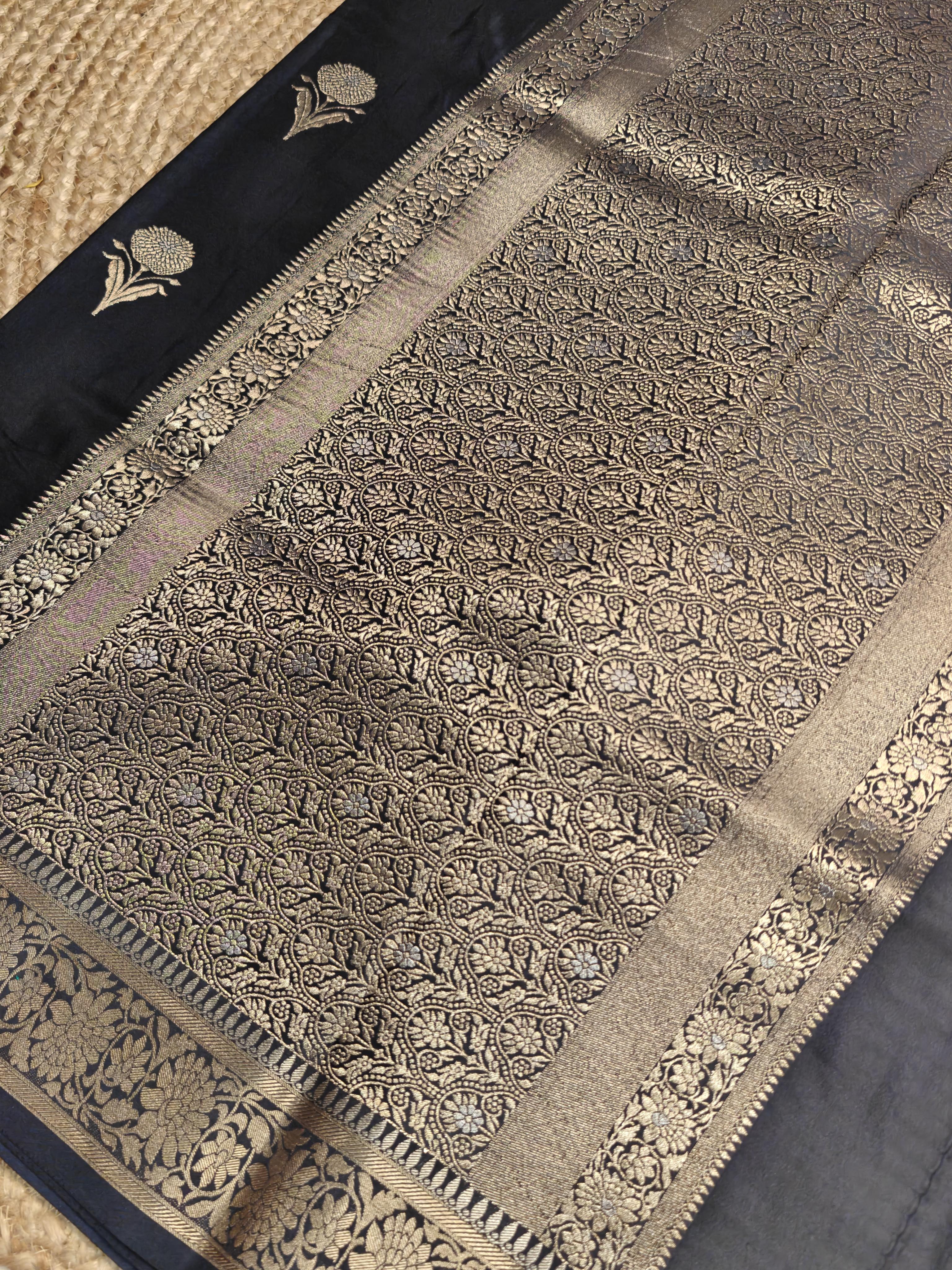 This exquisite black Banarasi silk saree features intricate flower motifs woven all over the body, creating a rich texture and timeless appeal. Enhanced with a richly detailed border and grand pallu, it radiates opulence and festive grandeur. Perfect for weddings, evening celebrations, and heirloom occasions, this saree is a captivating expression of Banaras artistry and sophisticated beauty 🖤✨🌸