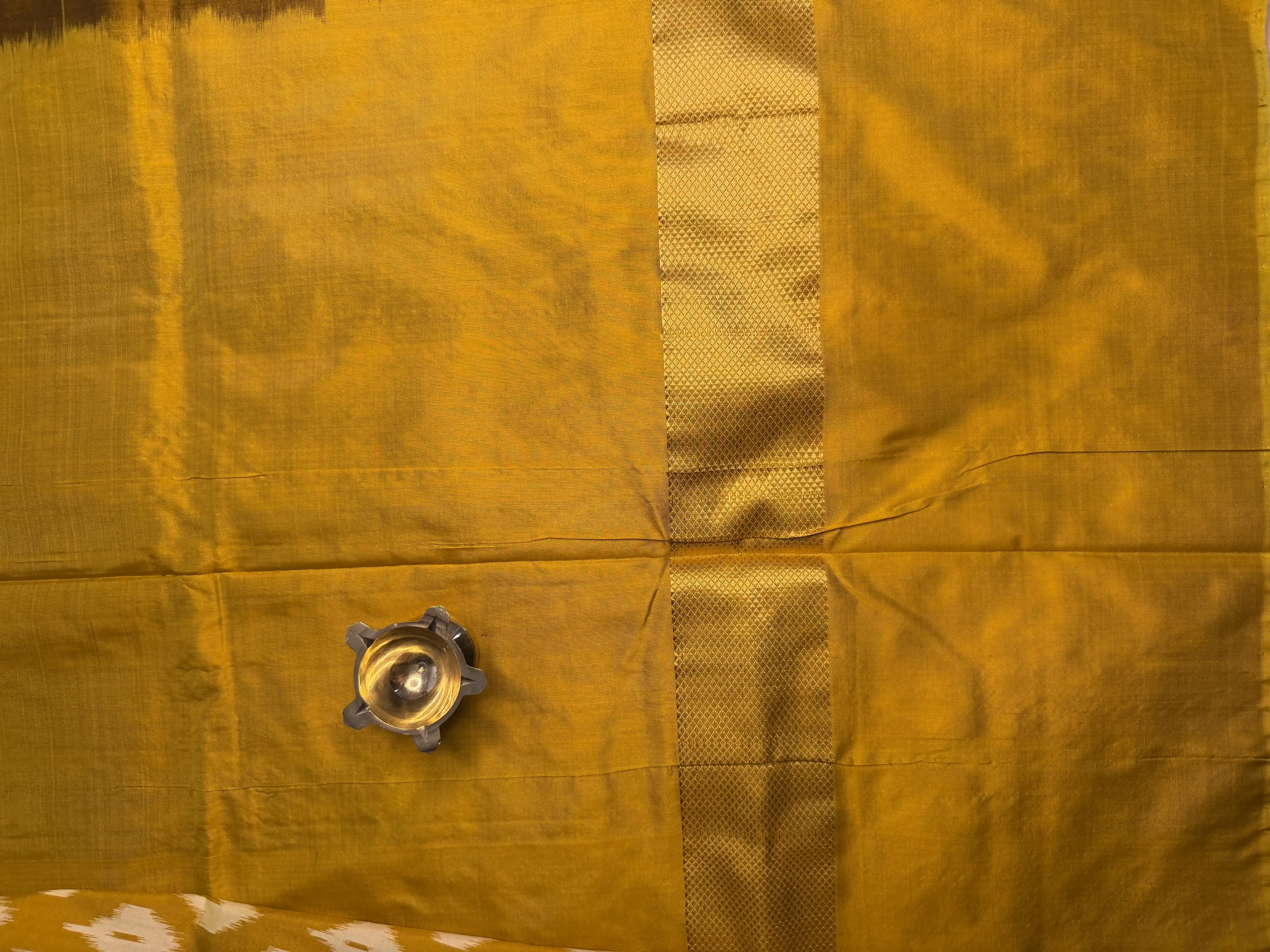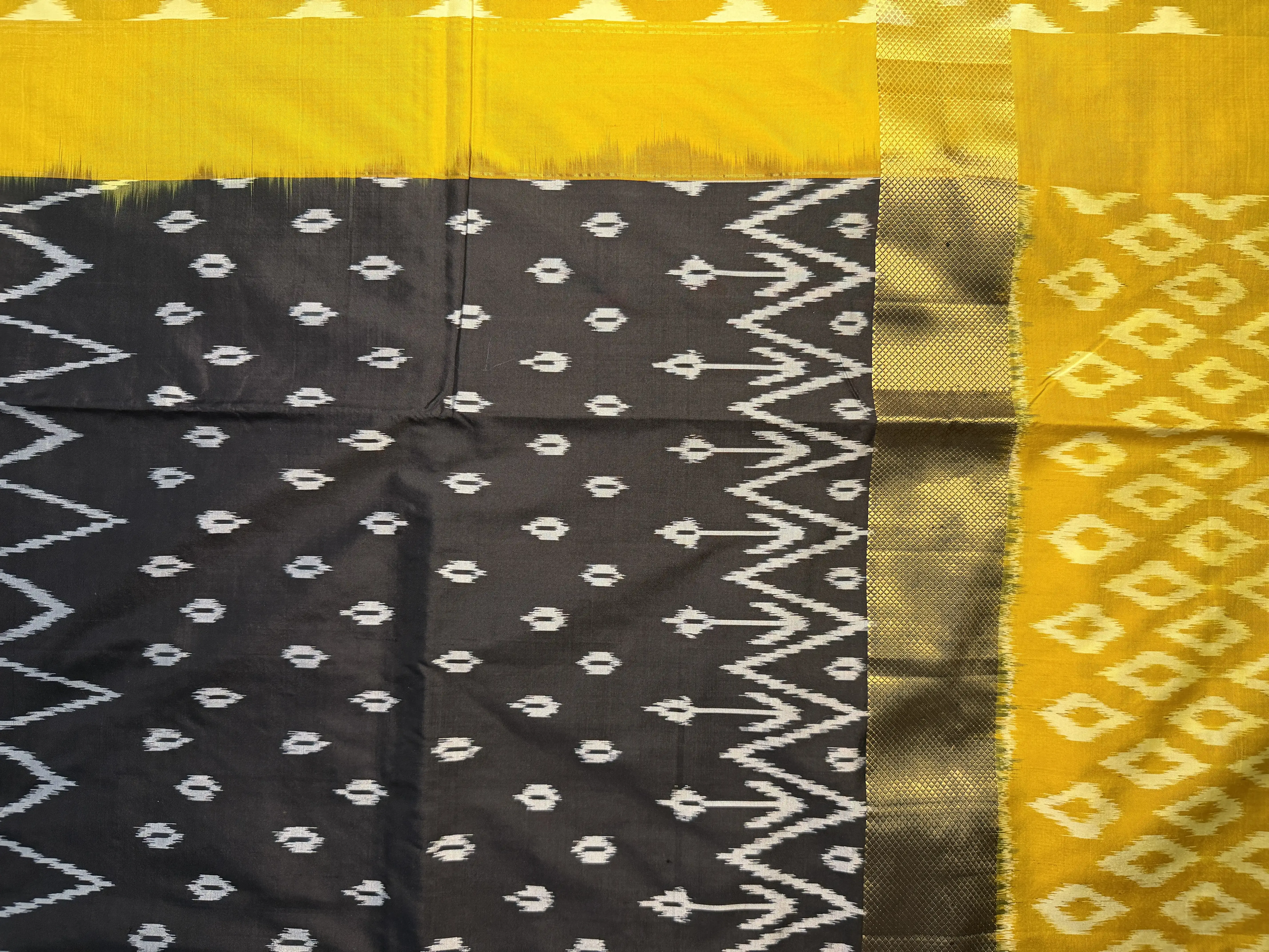 This Poochampalli silk saree in a striking black and mustard yellow combination showcases classic weaving with a rich, regal appeal. The natural sheen and structured drape of Poochampalli silk enhance its elegant silhouette, making it a standout choice.