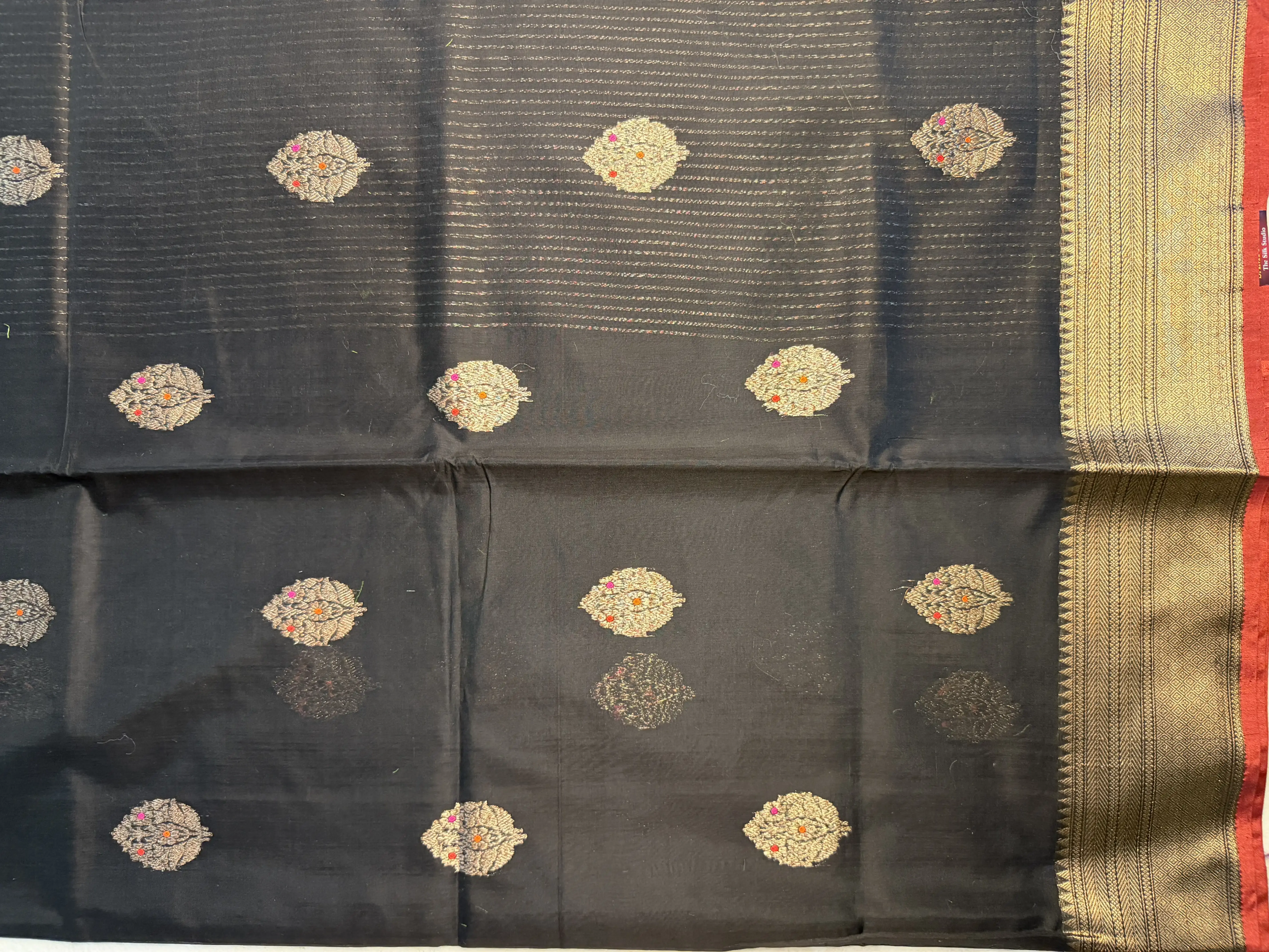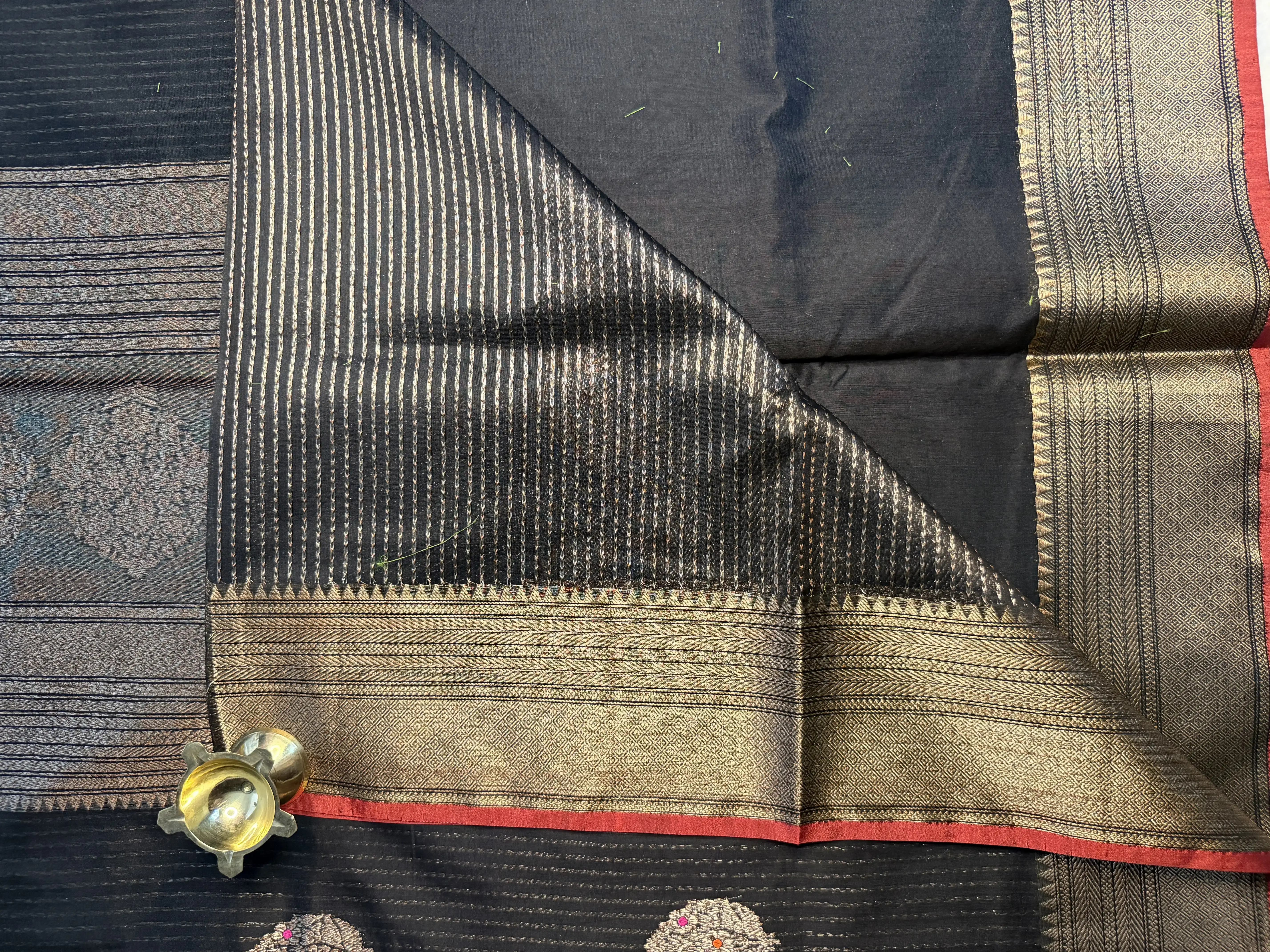 This black cotton silk saree, adorned with delicate buttas, drapes gracefully with rich heritage and understated charm—perfect for sophisticated festive and formal occasions. 🖤✨