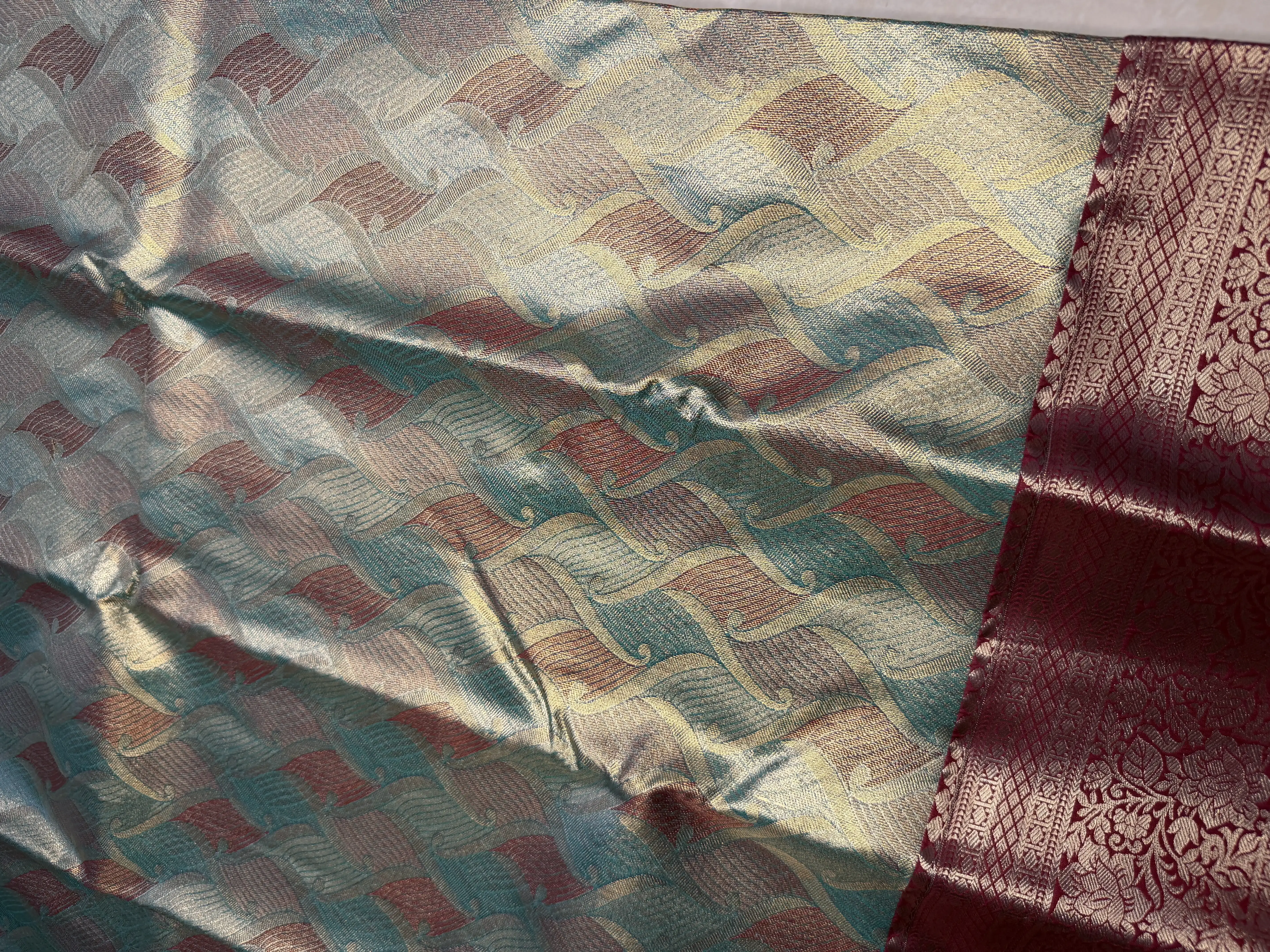 This blue & maroon tissue semi-silk saree is beautifully defined by a richly woven pallu, adding depth and festive grandeur to its graceful drape. The subtle sheen of tissue semi-silk enhances the contrast between the blue body and maroon accents, creating a refined and eye-catching look.