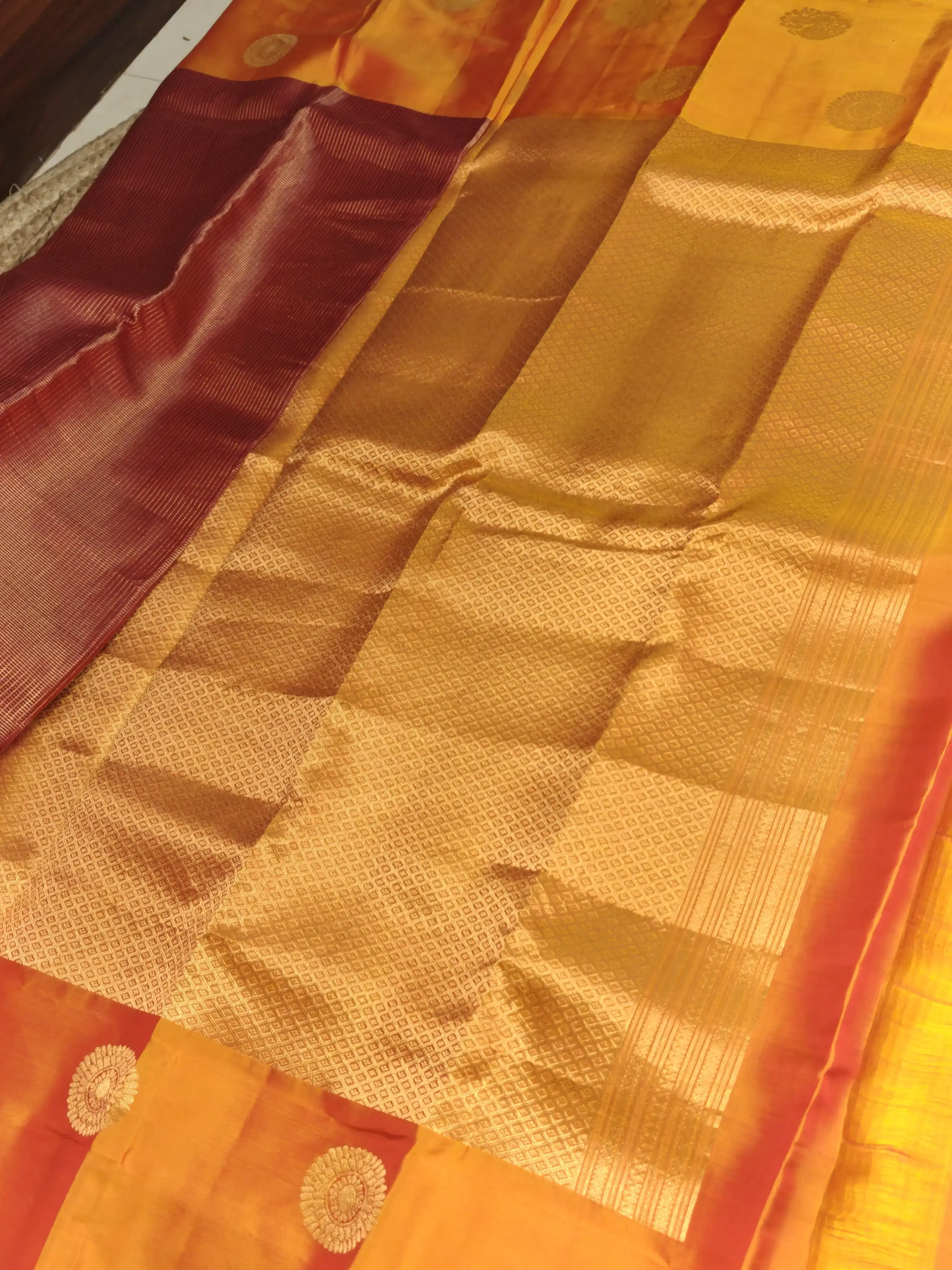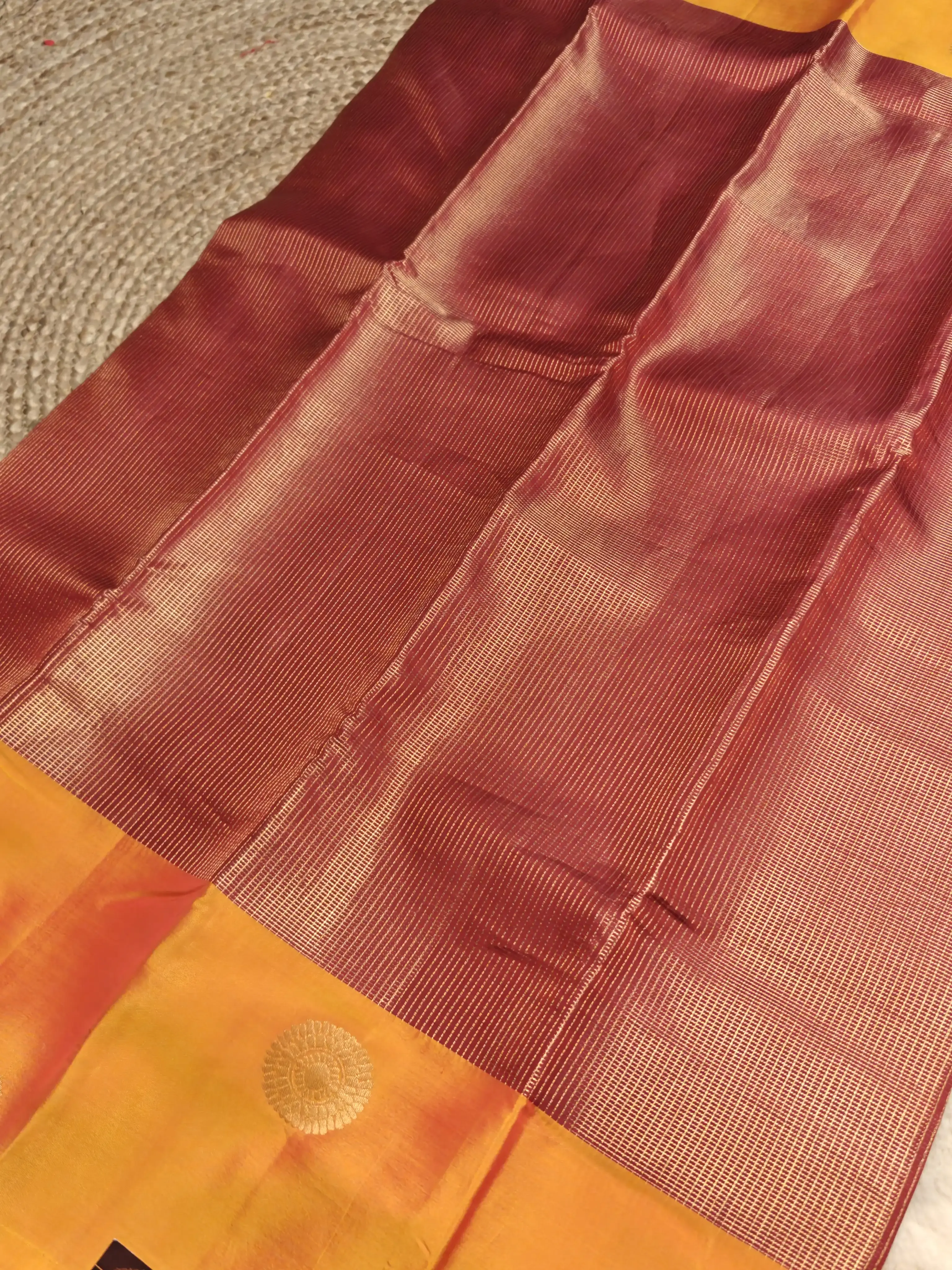 This brick red silk saree features a striking yellow border with bold motifs, creating a beautiful contrast rooted in tradition. Simple yet eye-catching, it’s perfect for festive days, family functions, and timeless ethnic styling ❤️💛