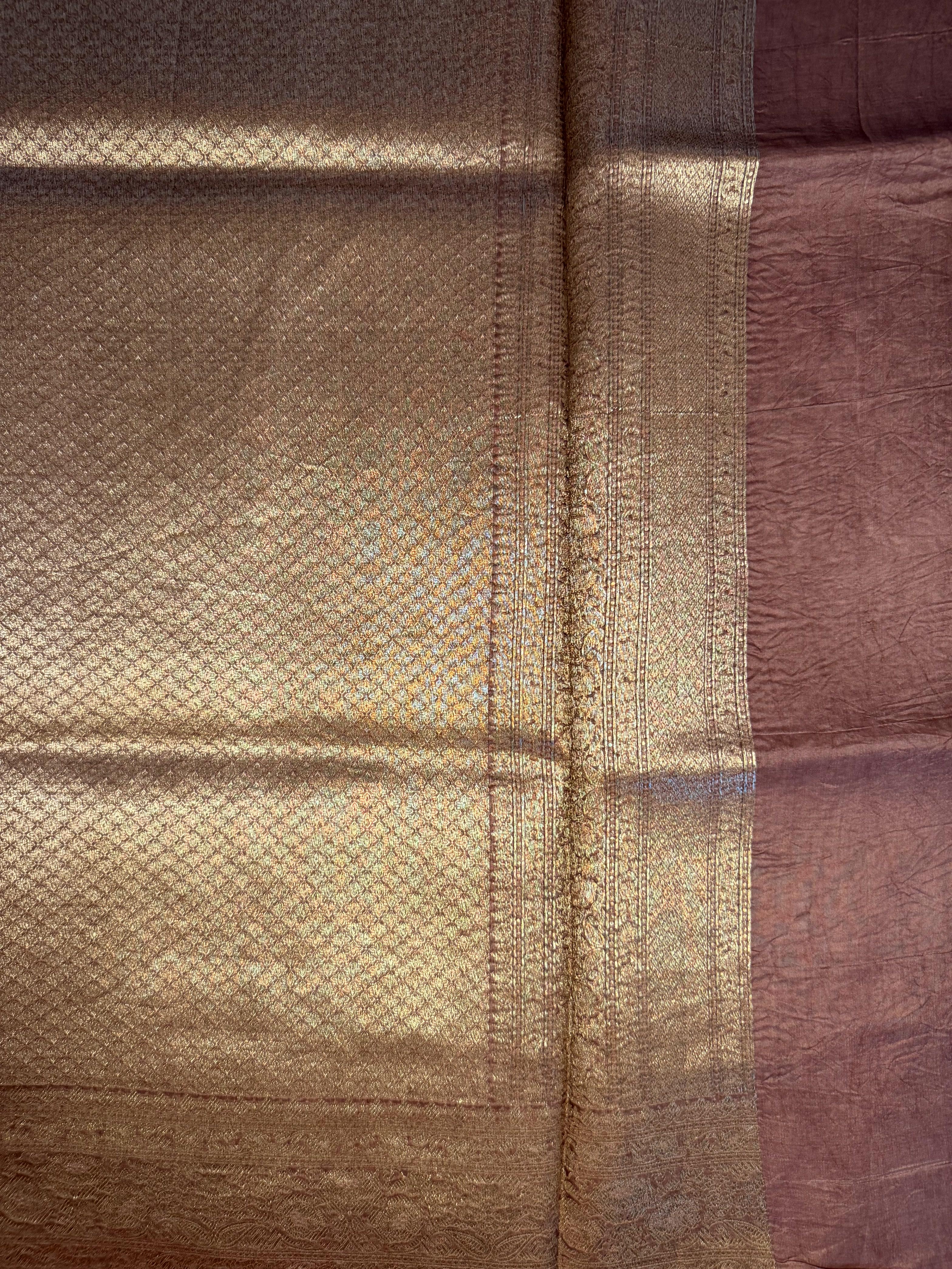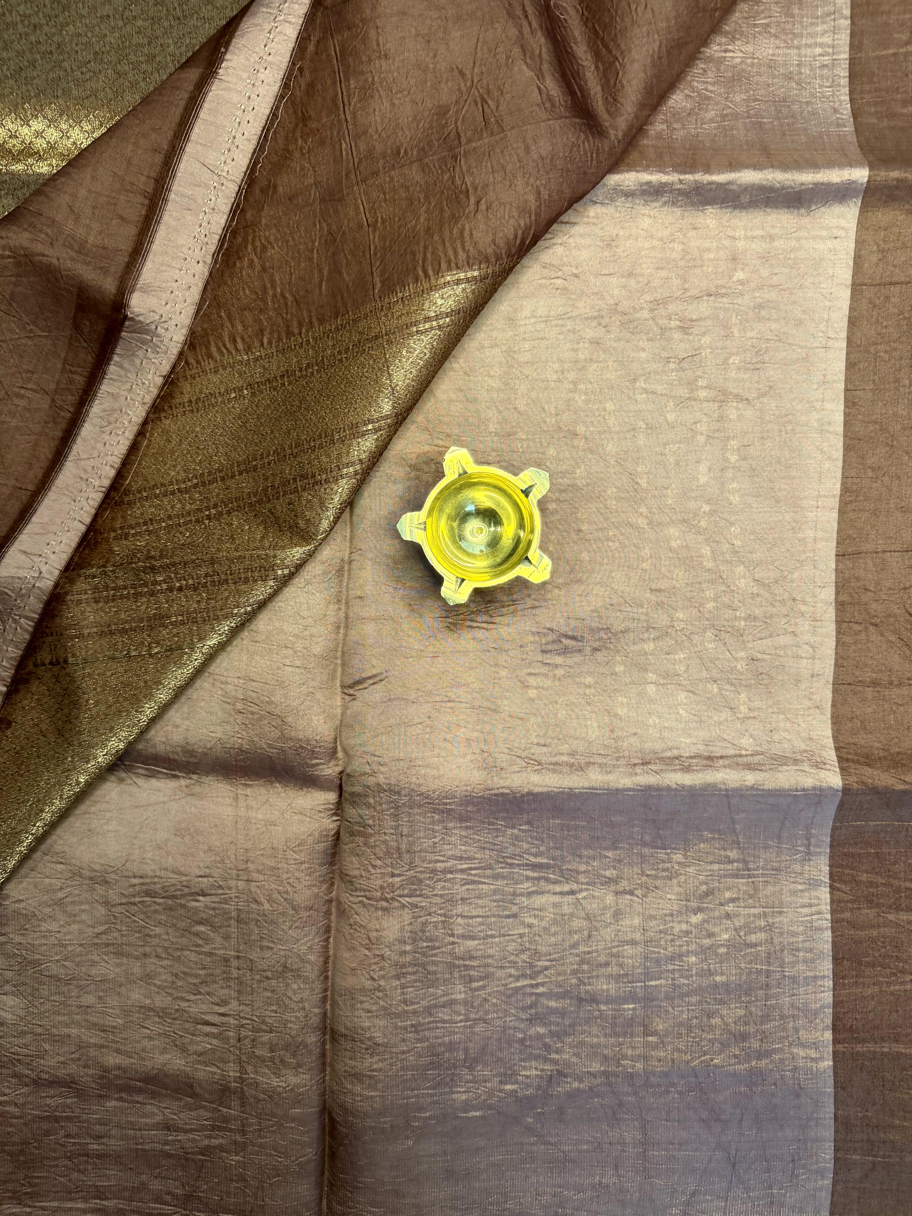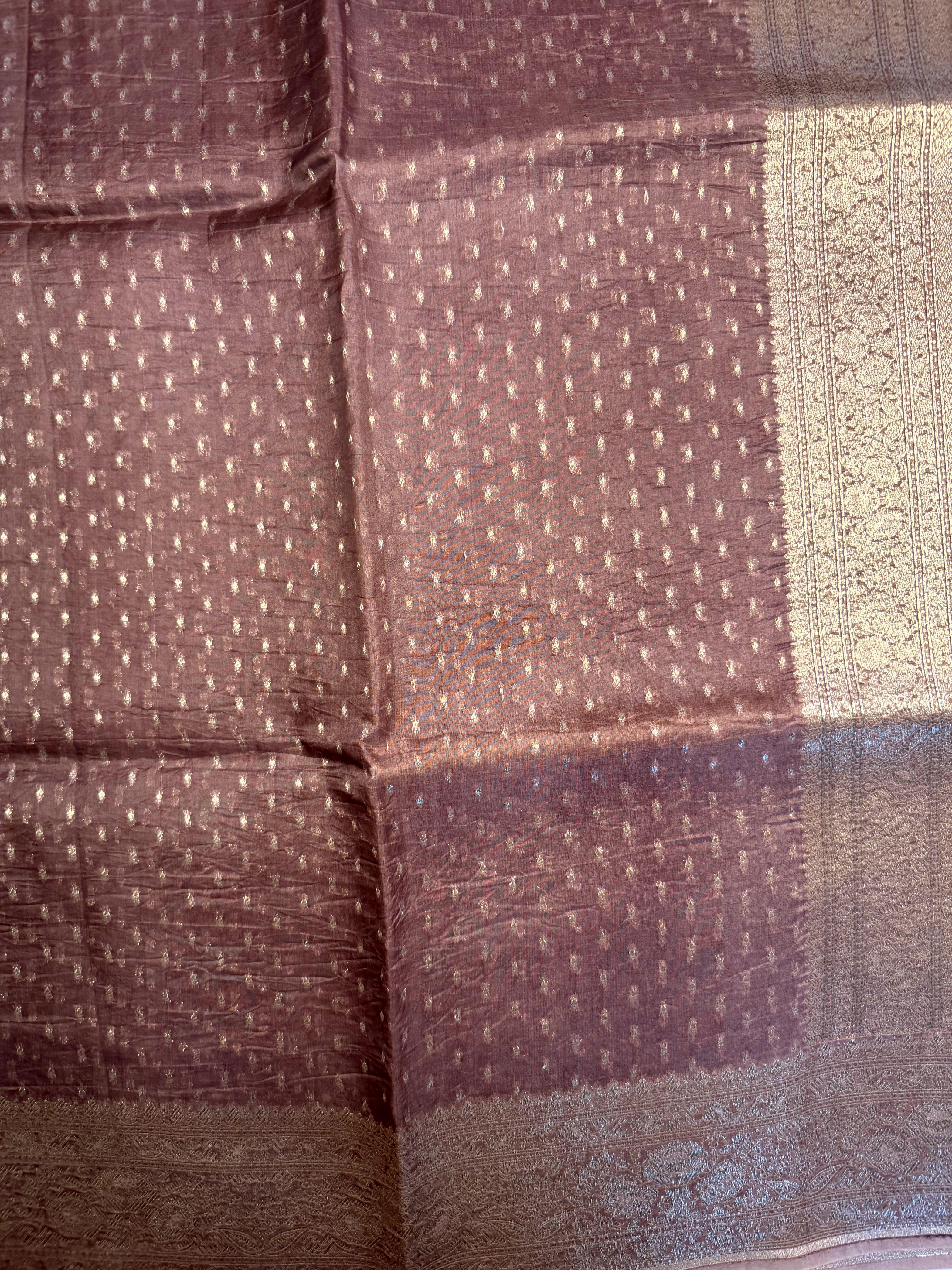 This rich brown pure Kora Organza saree is adorned with delicate small zari buttas scattered gracefully across the body, adding texture and shimmer without overpowering its natural sophistication.