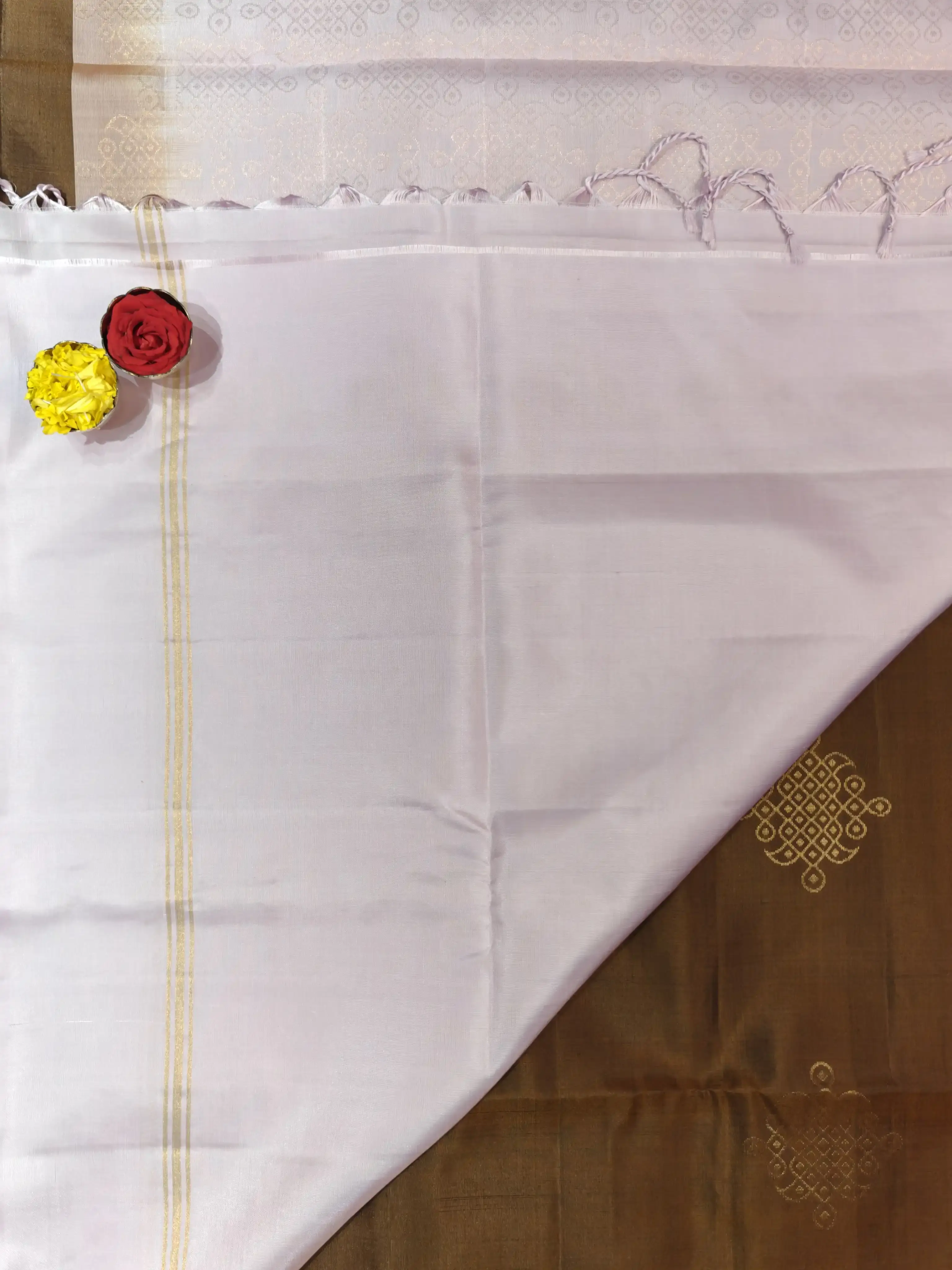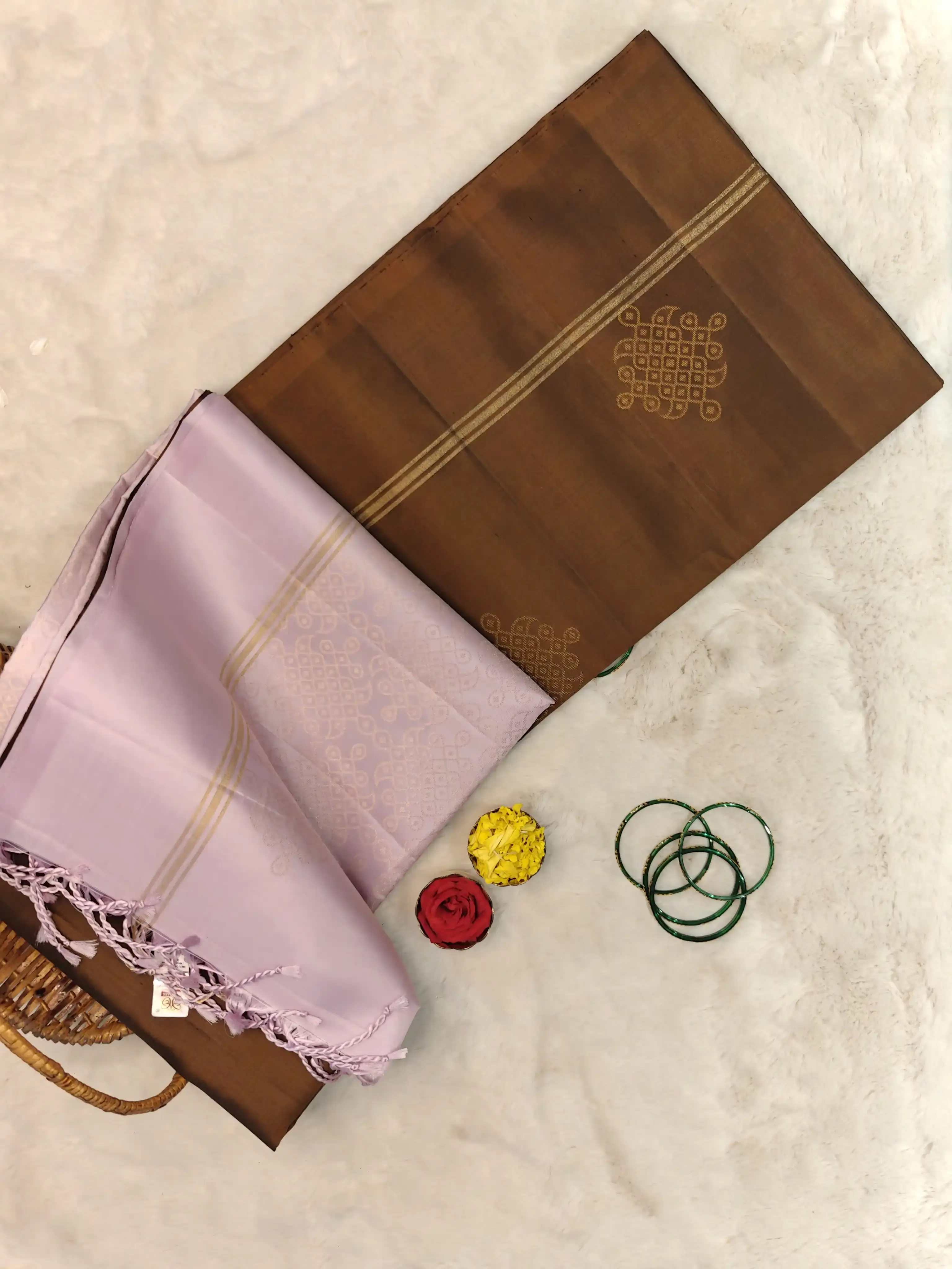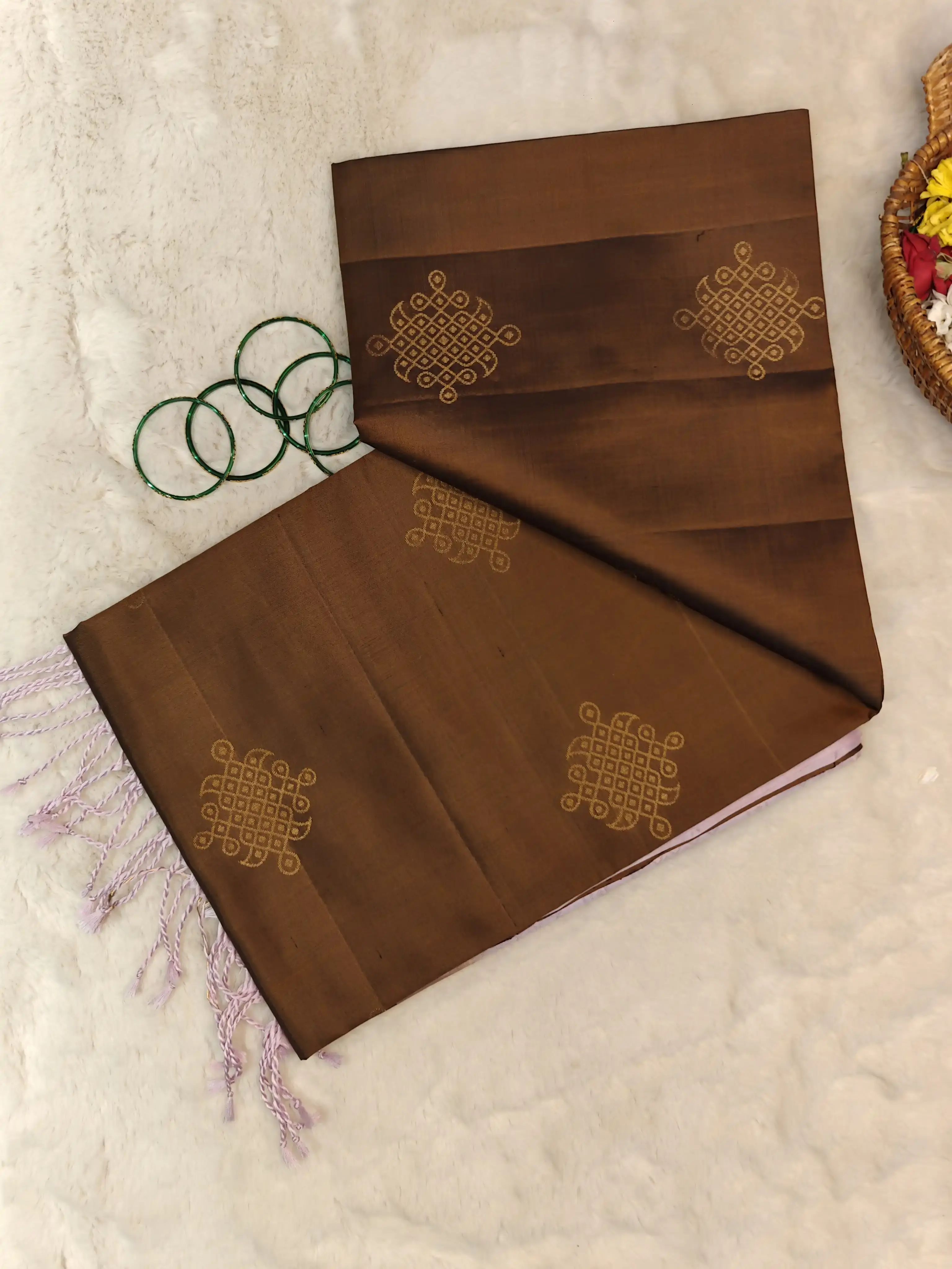 This brown soft silk saree is beautifully highlighted with a pastel pink kolam design, symbolizing auspicious beginnings and artistic heritage. The subtle contrast adds a gentle contemporary touch, while the smooth silk drape enhances its elegance. Perfect for festive mornings, temple visits, and cultural celebrations, this saree reflects timeless charm with refined beauty 🤎🌸