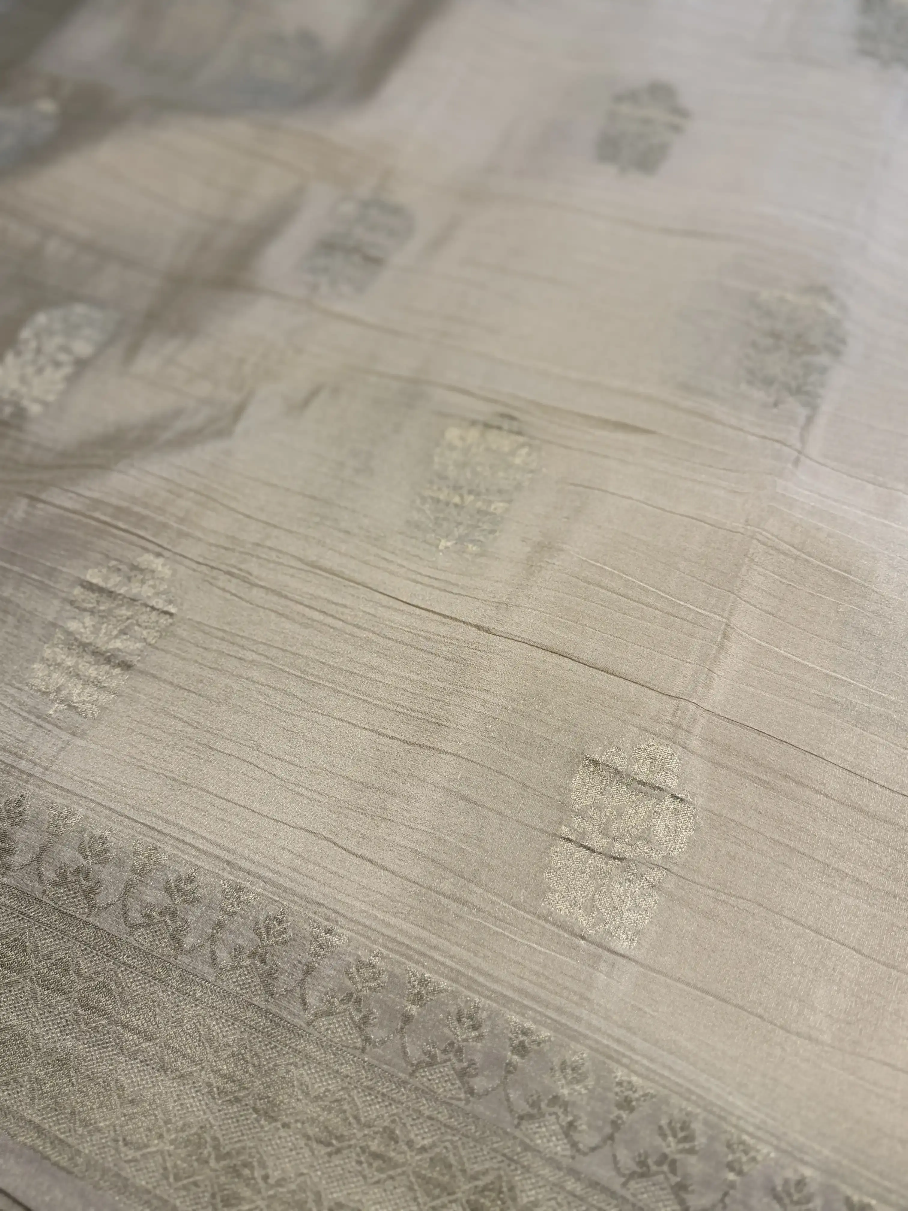 This cream crush viscose georgette fancy saree is adorned with delicate buttas, adding subtle texture and charm to its flowing drape. Lightweight with a beautiful fall, it’s perfect for parties, festive gatherings, and elegant evening occasions. A refined choice that blends modern style with timeless femininity 🤍✨