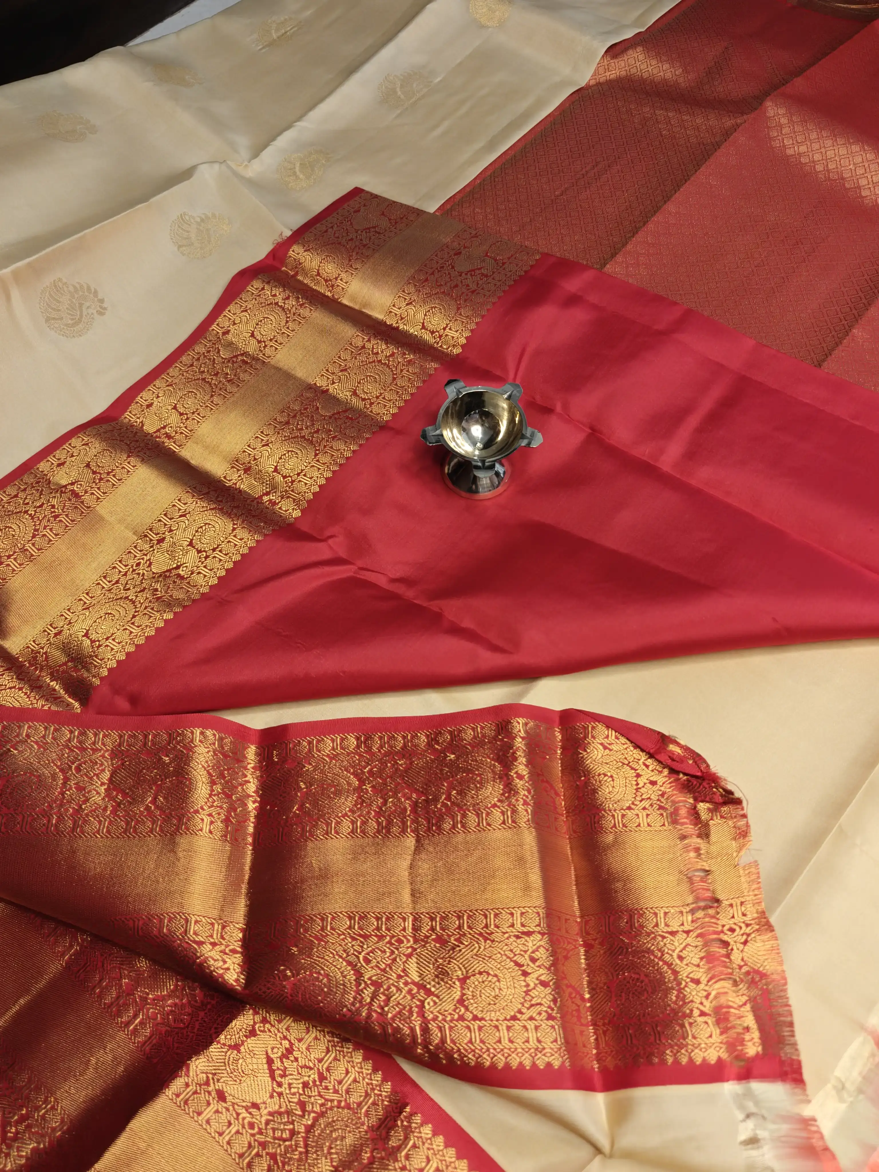 This cream-coloured silk saree radiates timeless grace, highlighted by a bold red traditional border that adds grandeur to the drape. The richly woven pallu enhances its regal appeal, reflecting the essence of age-old craftsmanship and cultural elegance. Perfect for weddings, temple ceremonies, and auspicious occasions, this saree embodies tradition, purity, and royal charm 🤍❤️