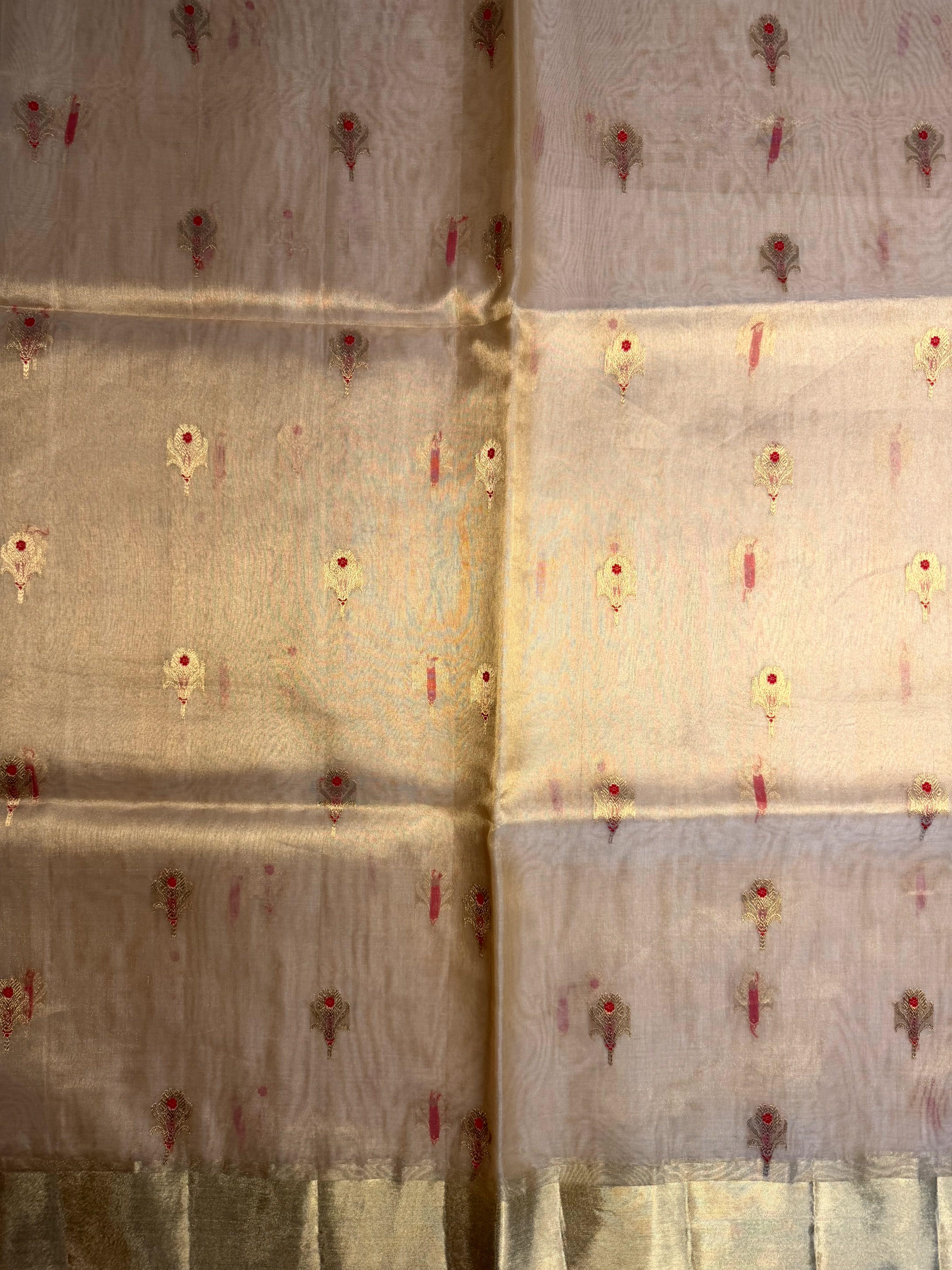 Graceful and timeless, this cream Tissue Kora Organza saree comes adorned with tiny zari buttas all over the body and a traditional zari border that highlights its heritage charm.