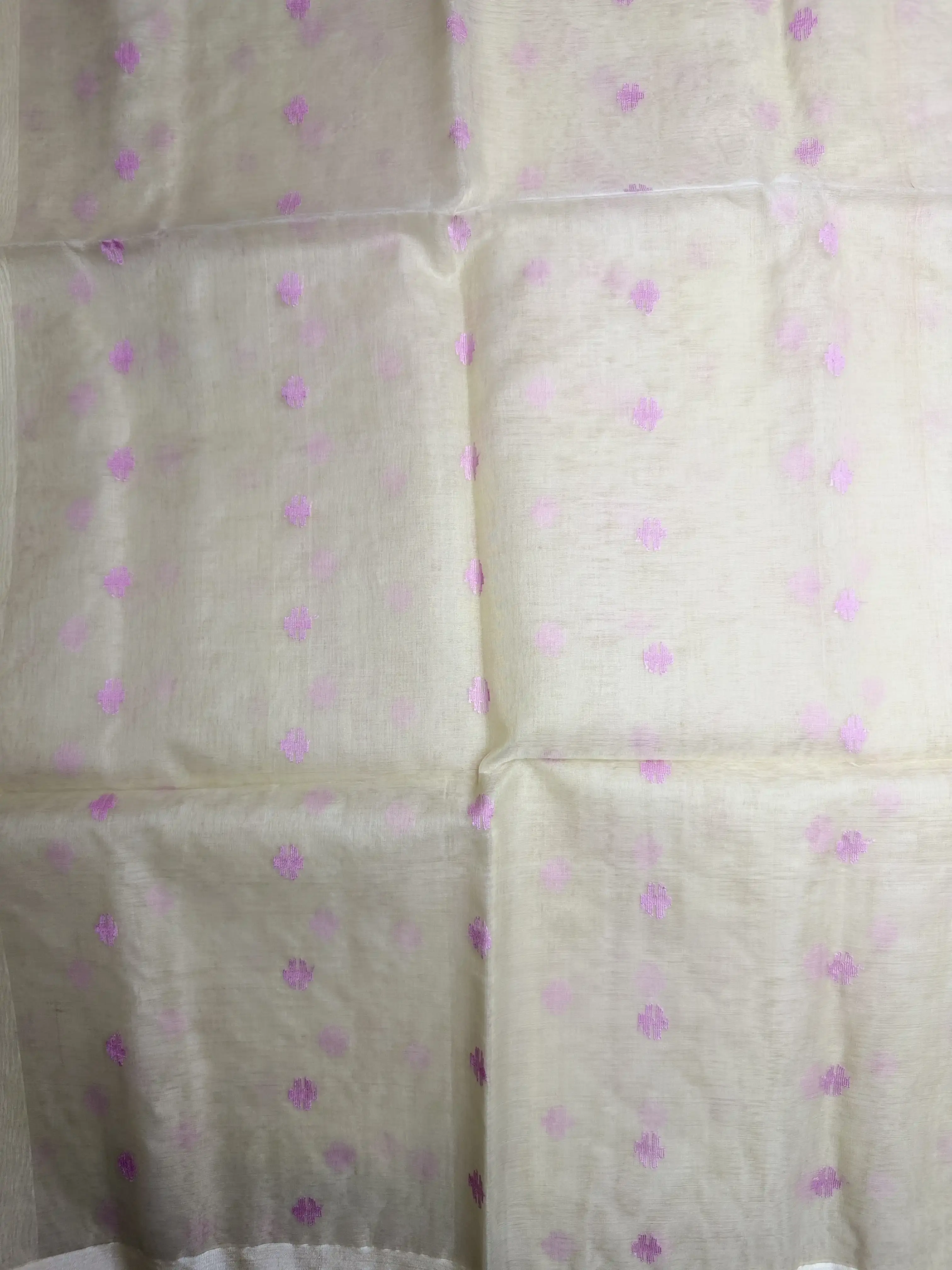 This Muga cotton silk saree in a graceful cream shade is beautifully enhanced with delicate pink Jamdhani work, reflecting fine craftsmanship and heritage weaving. The blend of cotton and silk offers a soft texture with a gentle sheen, creating a luxurious yet comfortable drape.