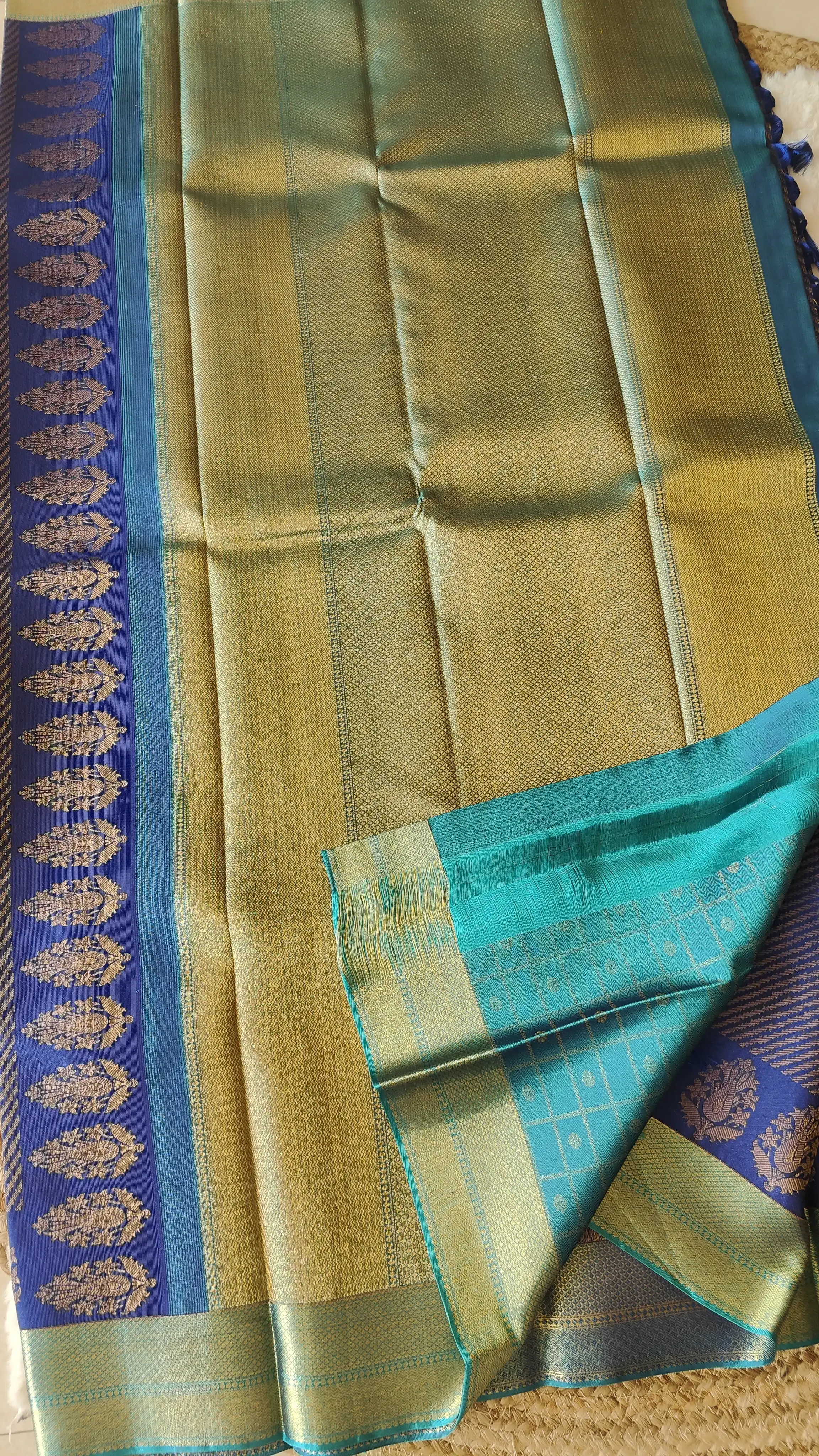 Dark blue and sky blue flower motif border Pure kanchipuram saree