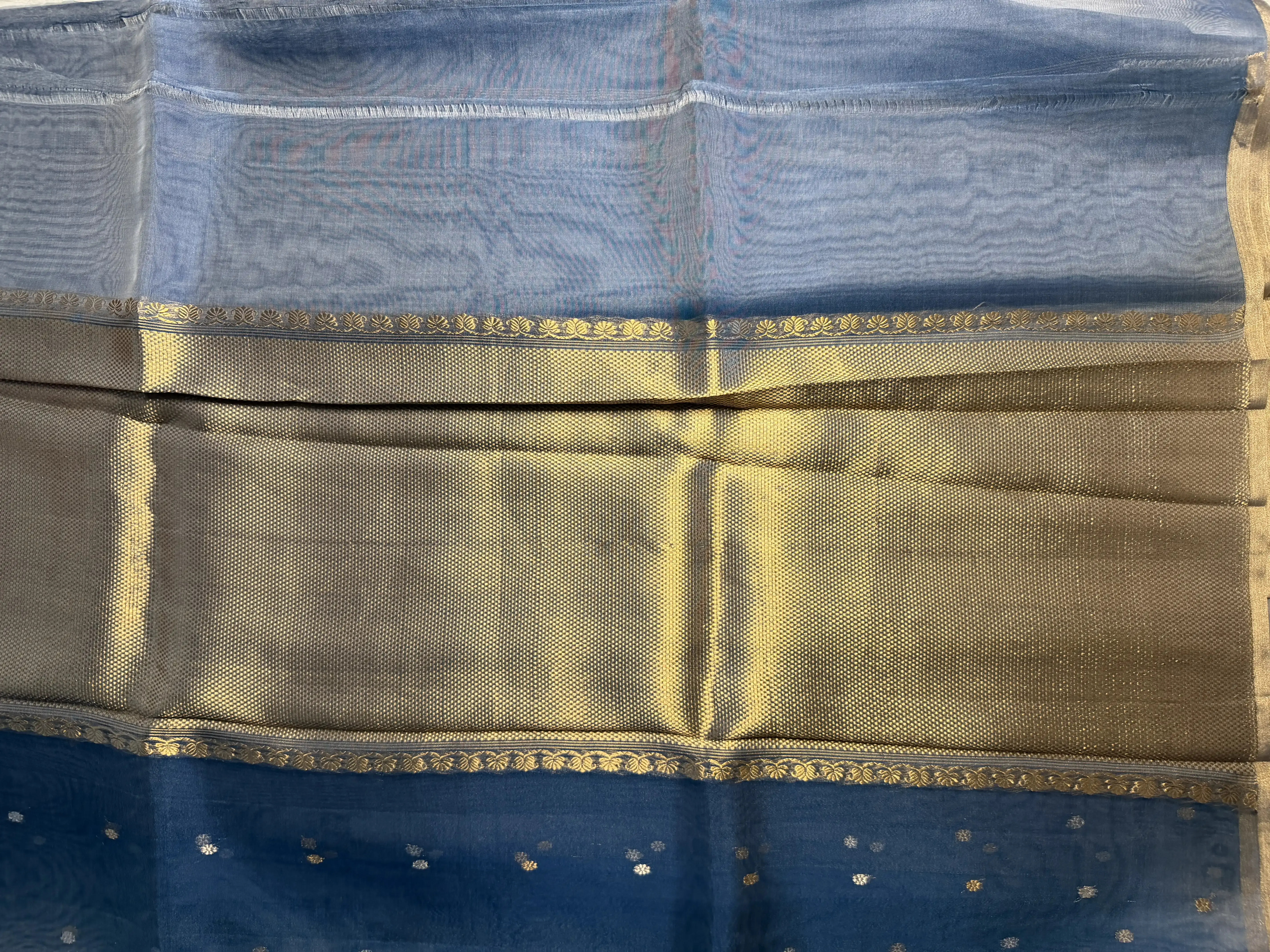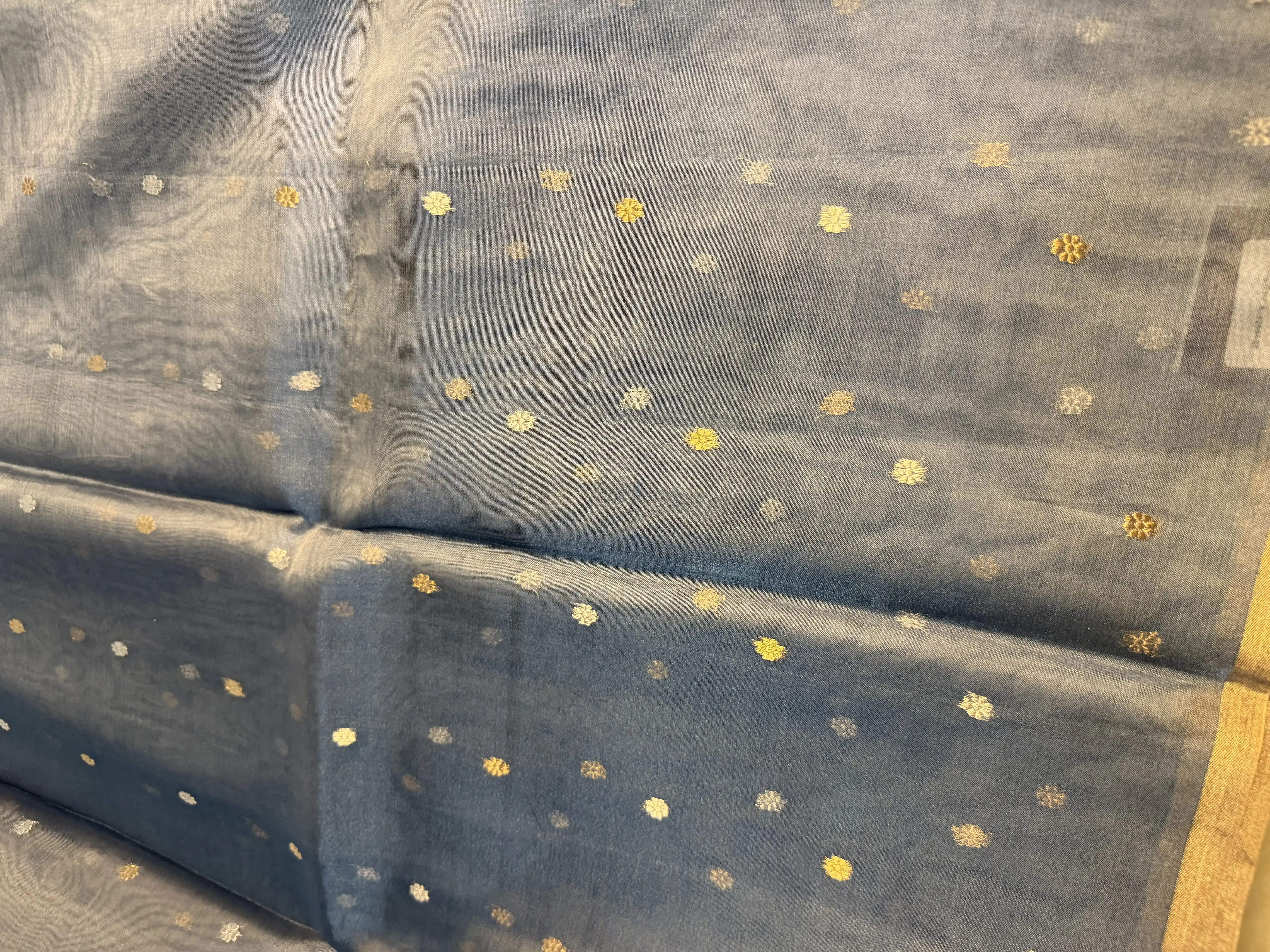 This pure tissue organza saree in a sophisticated grey hue is adorned with delicate buttas, adding texture and quiet elegance. Light, airy, and softly luminous, it drapes effortlessly with refined charm.