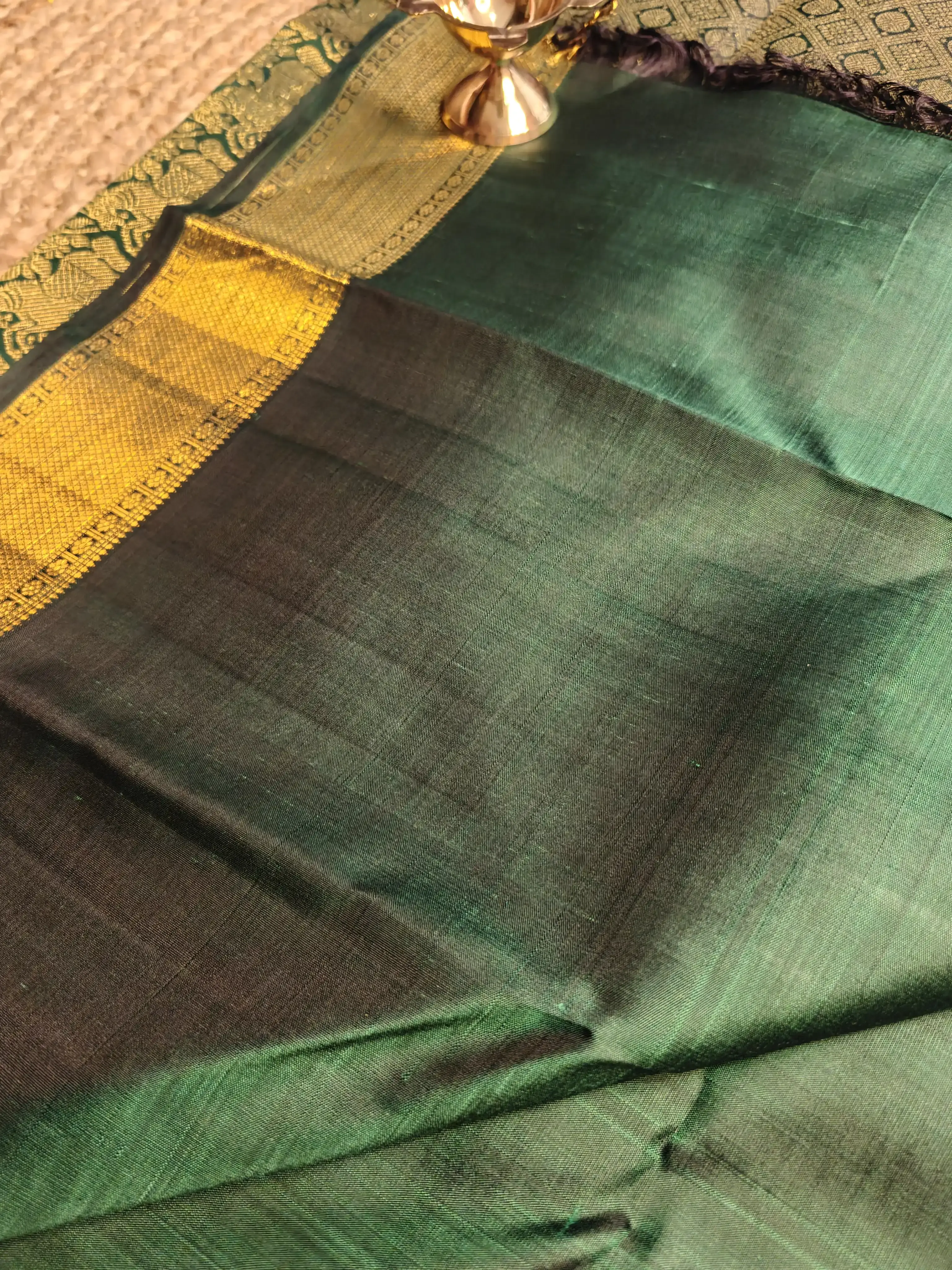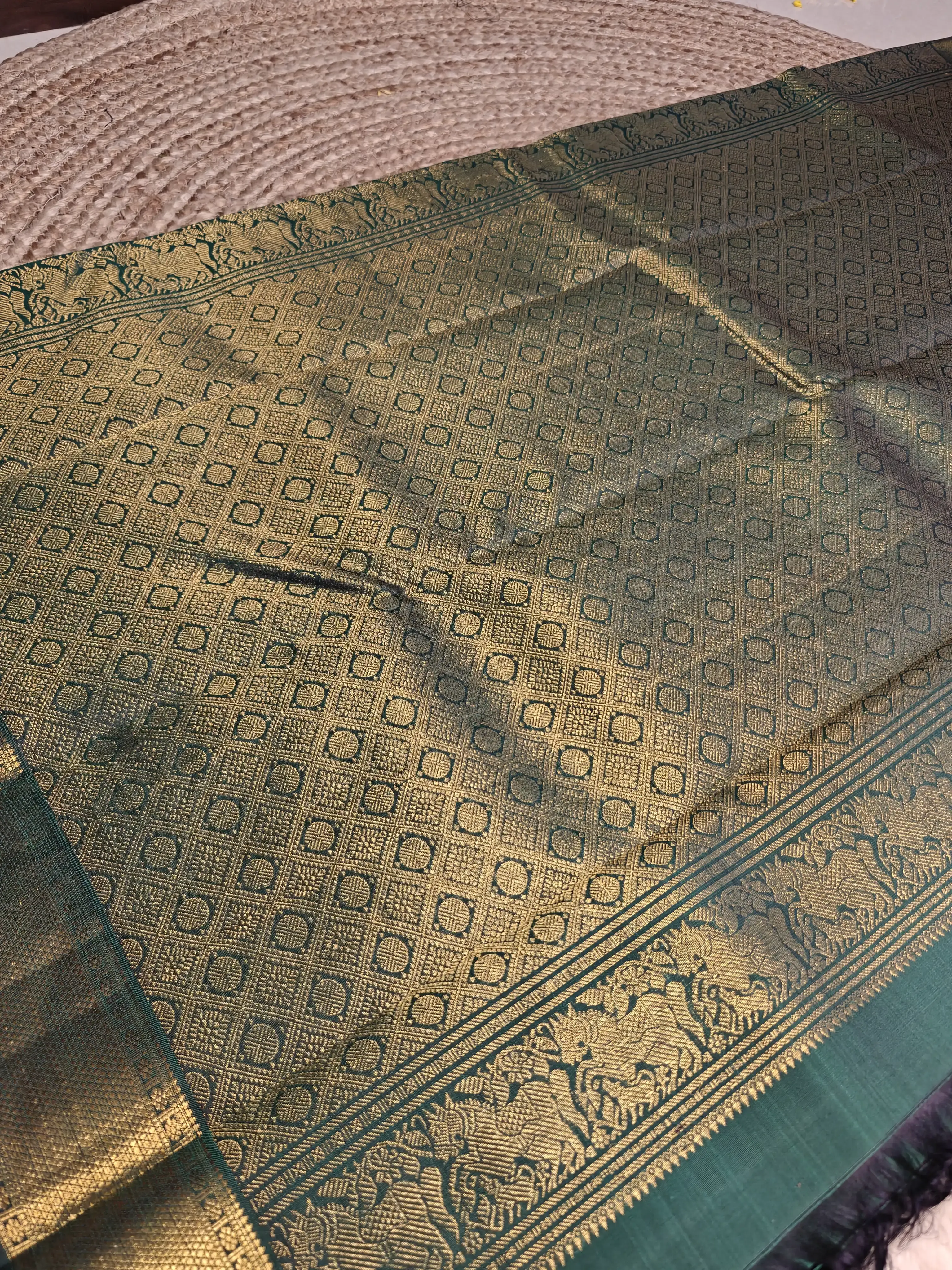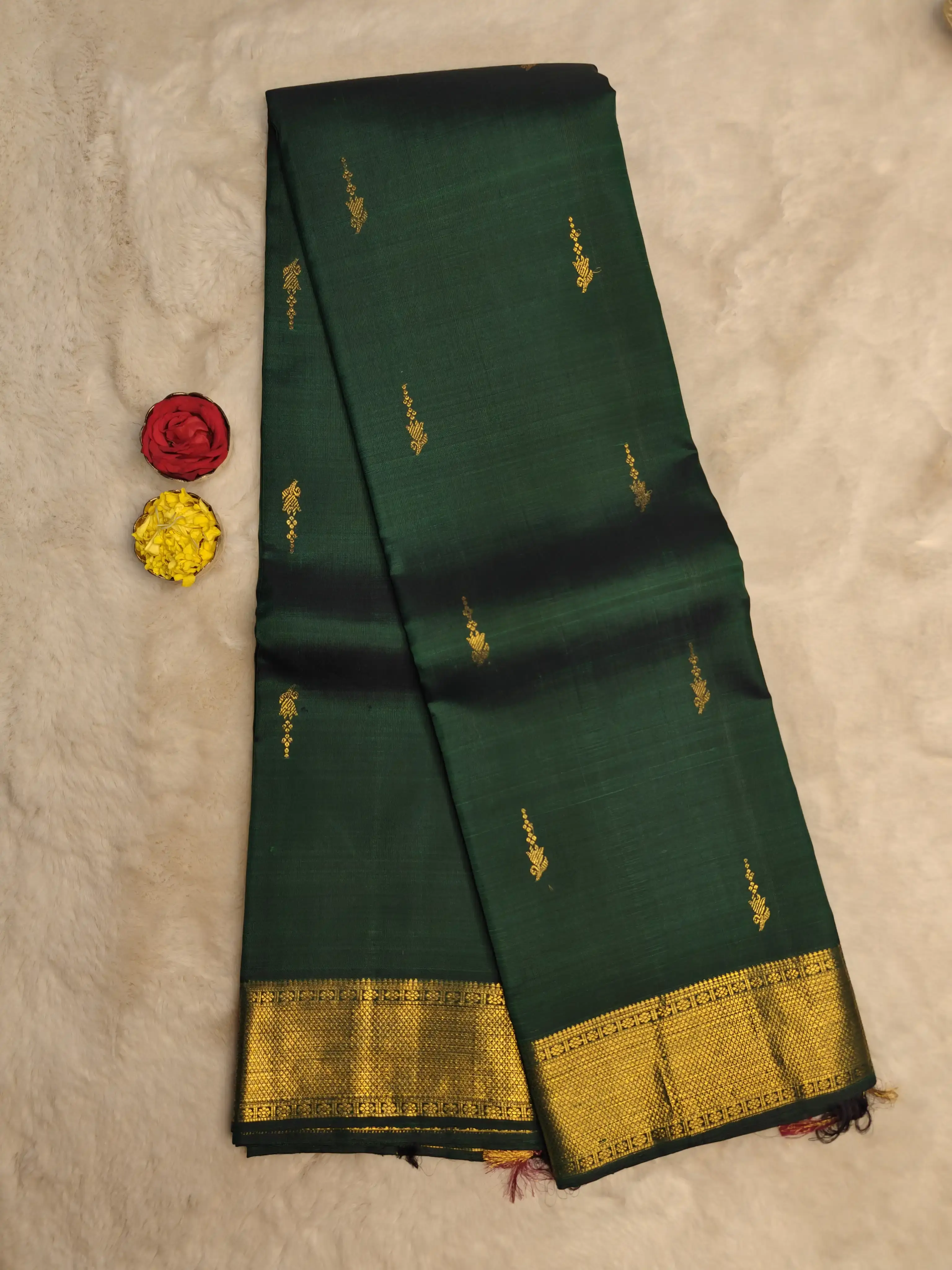 This dark green pure silk saree is adorned with intricate motifs woven all over the body, reflecting the richness of classic craftsmanship. The opulent border and grand pallu add depth, elegance, and ceremonial grandeur, making the saree truly majestic. An ideal drape for weddings, temple rituals, and festive celebrations, this saree embodies heritage, prosperity, and enduring grace 💚
