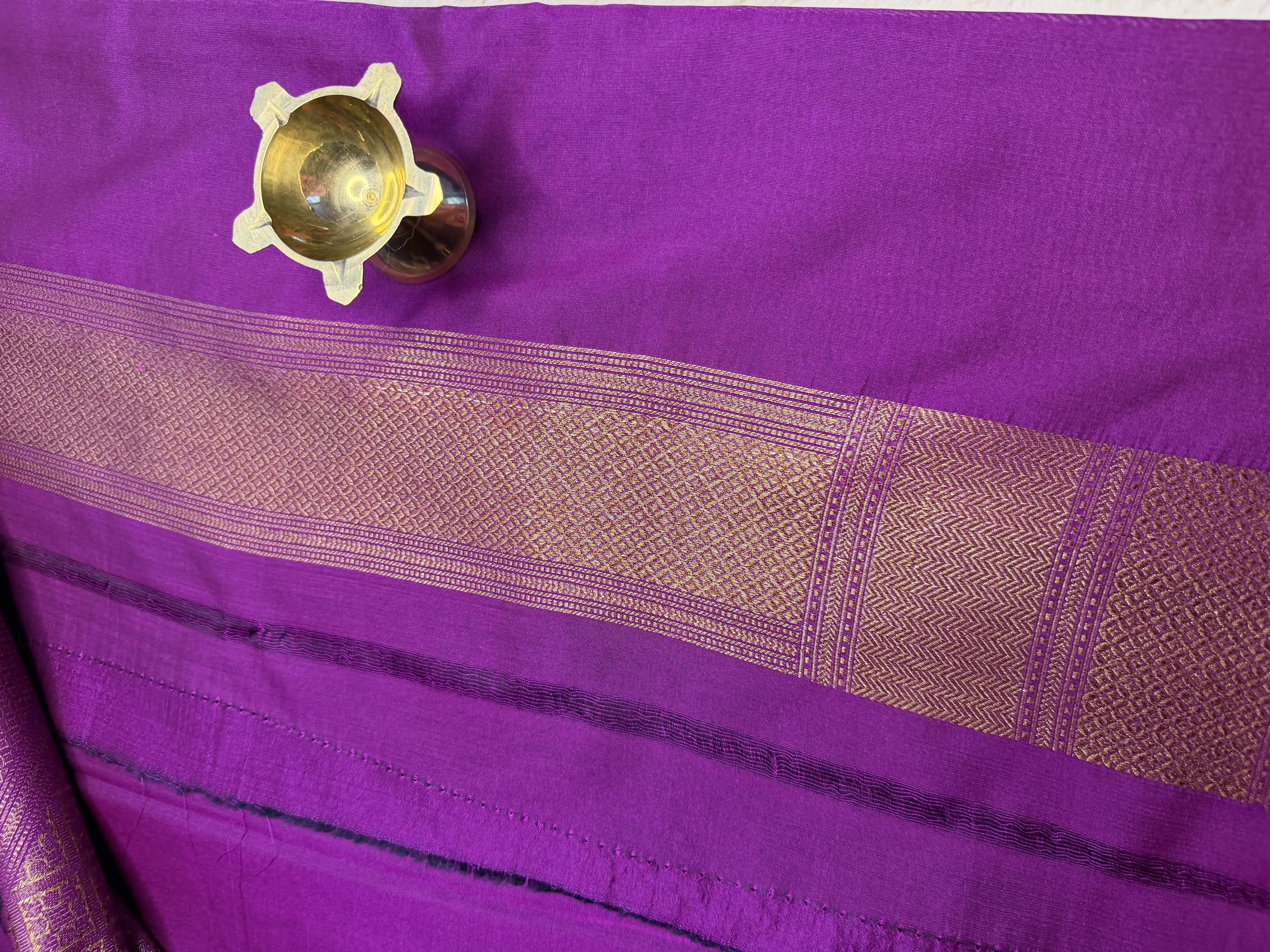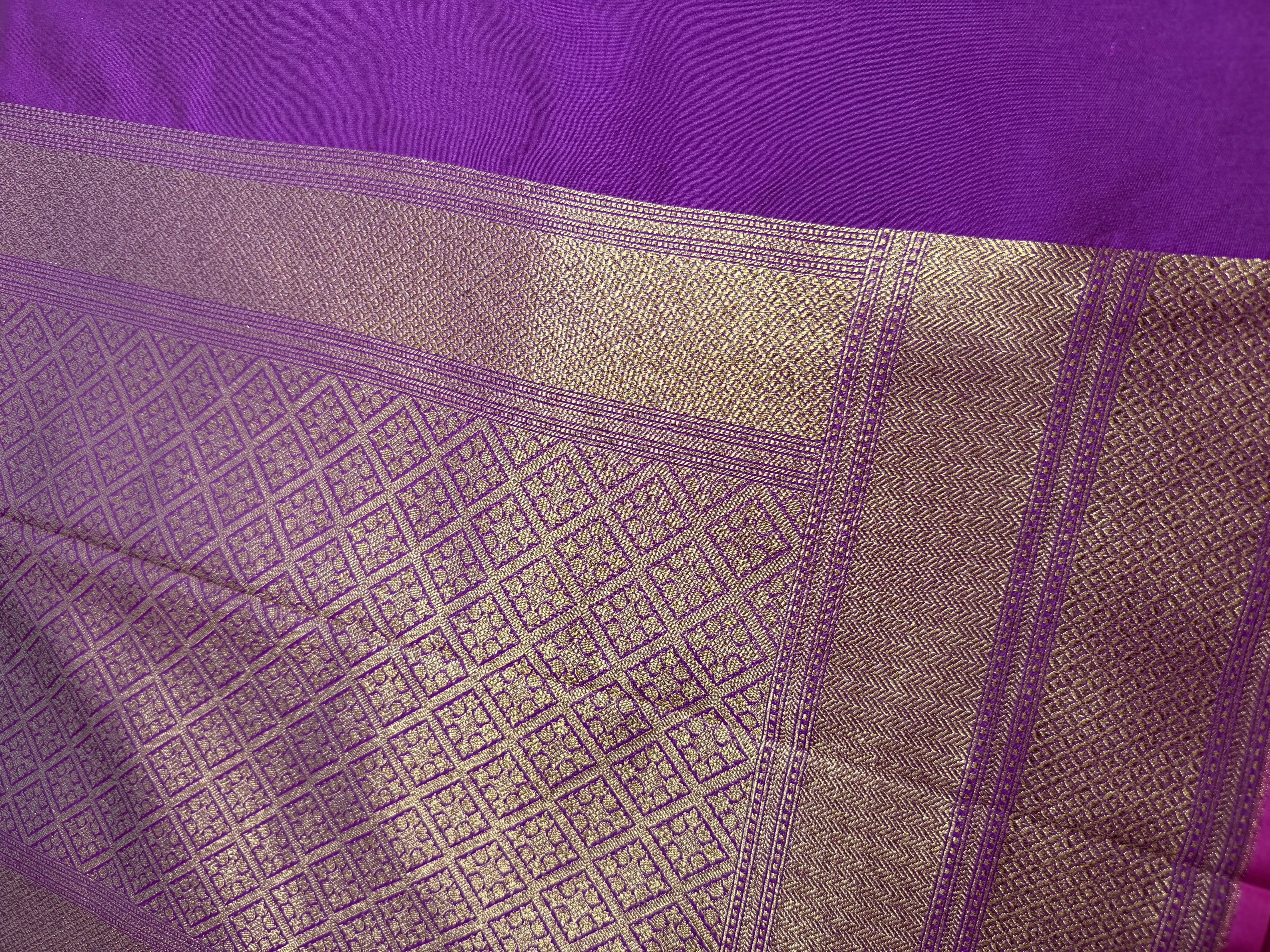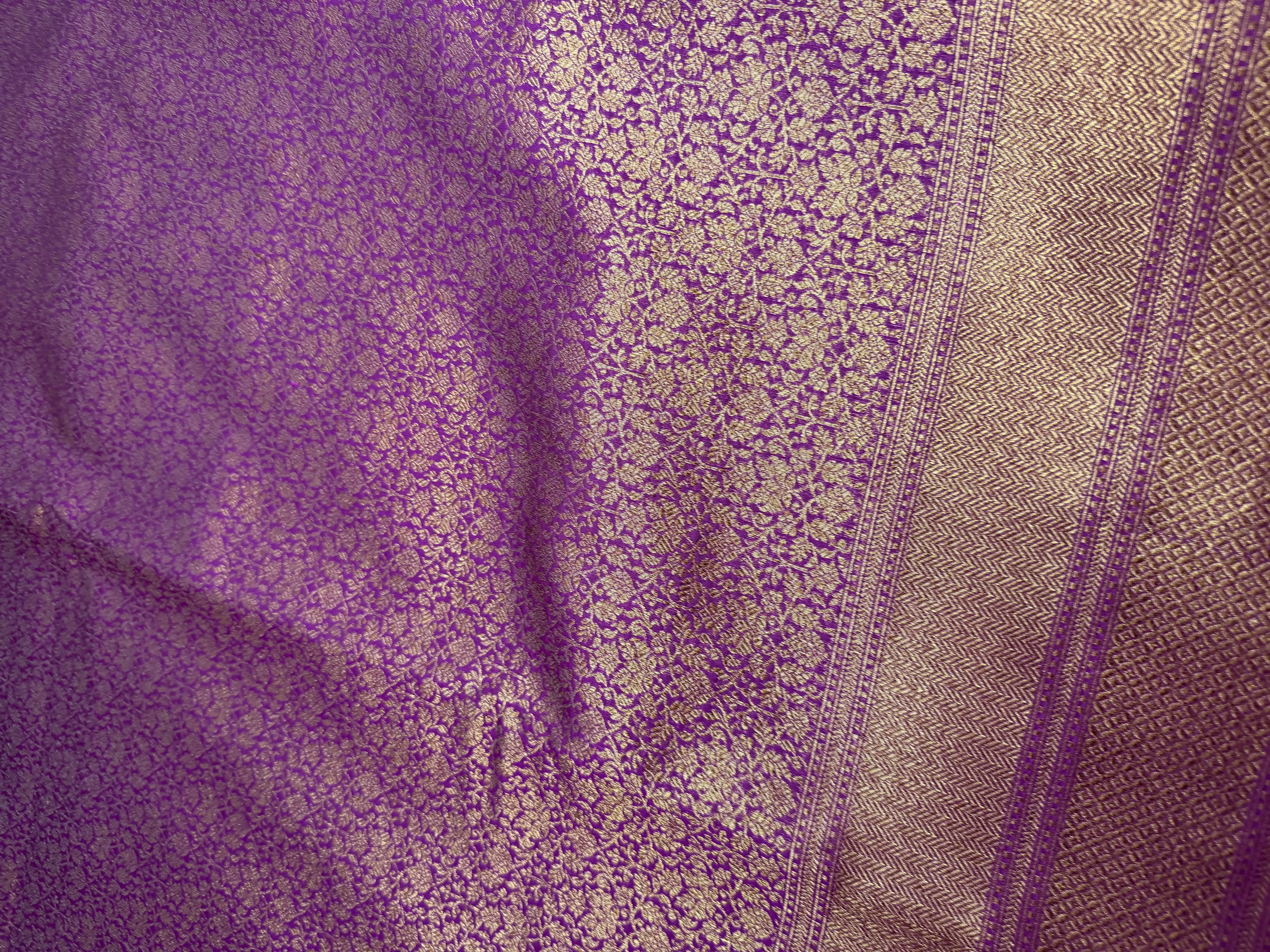 This dark pink Banaras saree is adorned with full-body zari work, showcasing the timeless artistry of Varanasi weavers. The intricate gold zari motifs spread across the body create a luxurious texture and opulent sheen, while the rich weave reflects centuries-old craftsmanship.