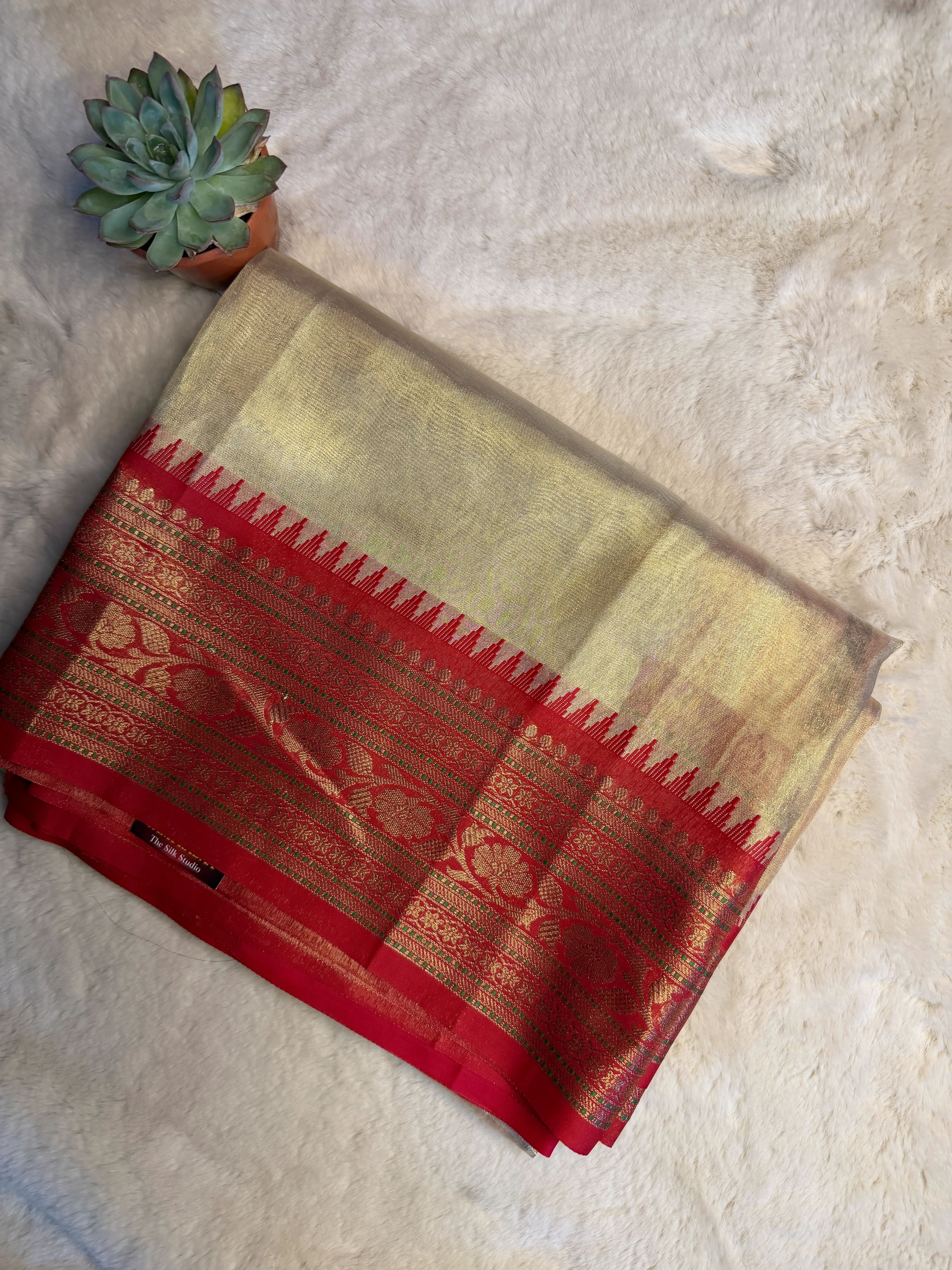 This gold tissue saree radiates timeless luxury with its luminous sheen and a grand, statement border that exudes regal charm. The delicate texture of tissue fabric catches the light beautifully, while the rich detailing elevates every drape into a masterpiece.