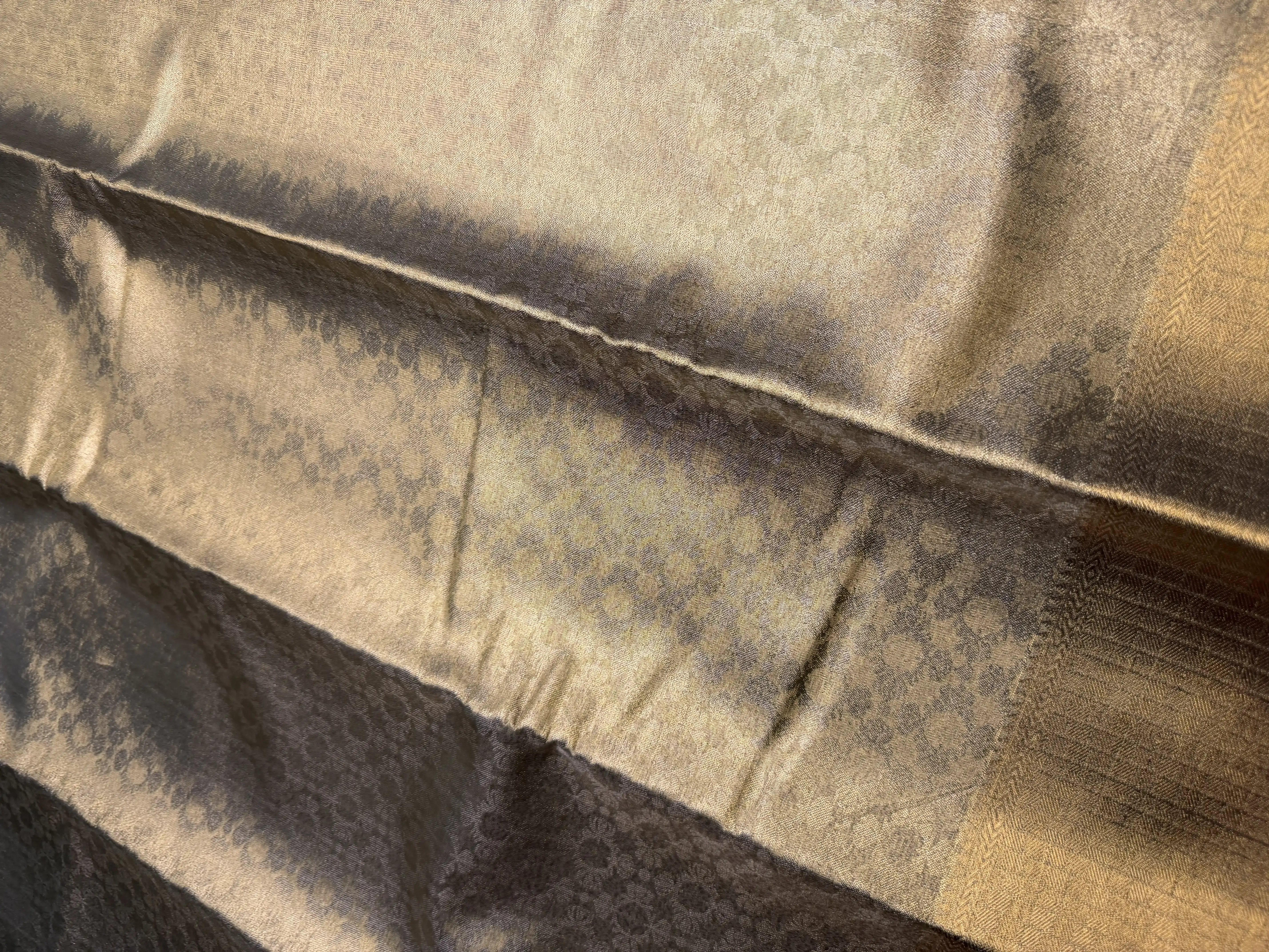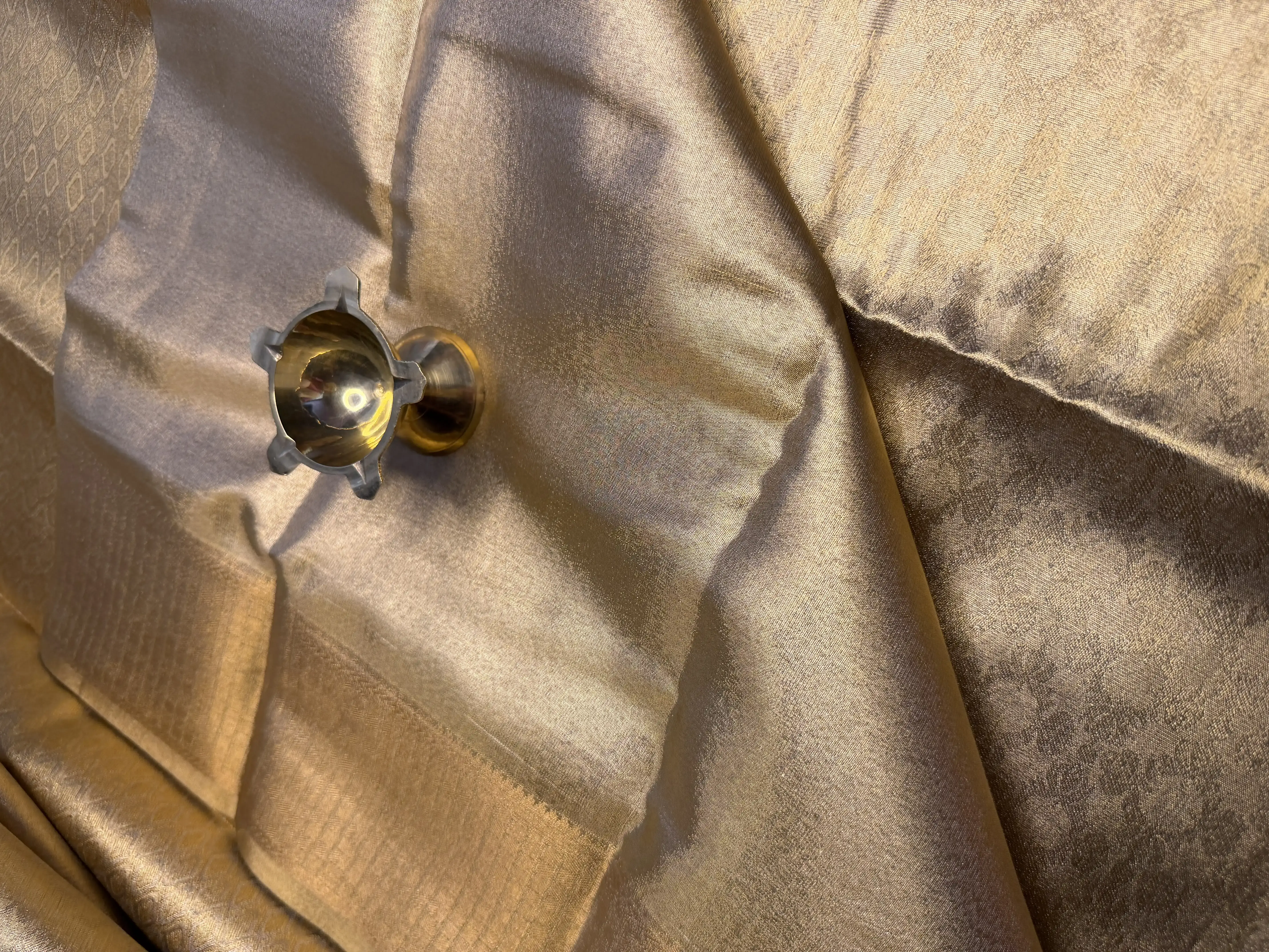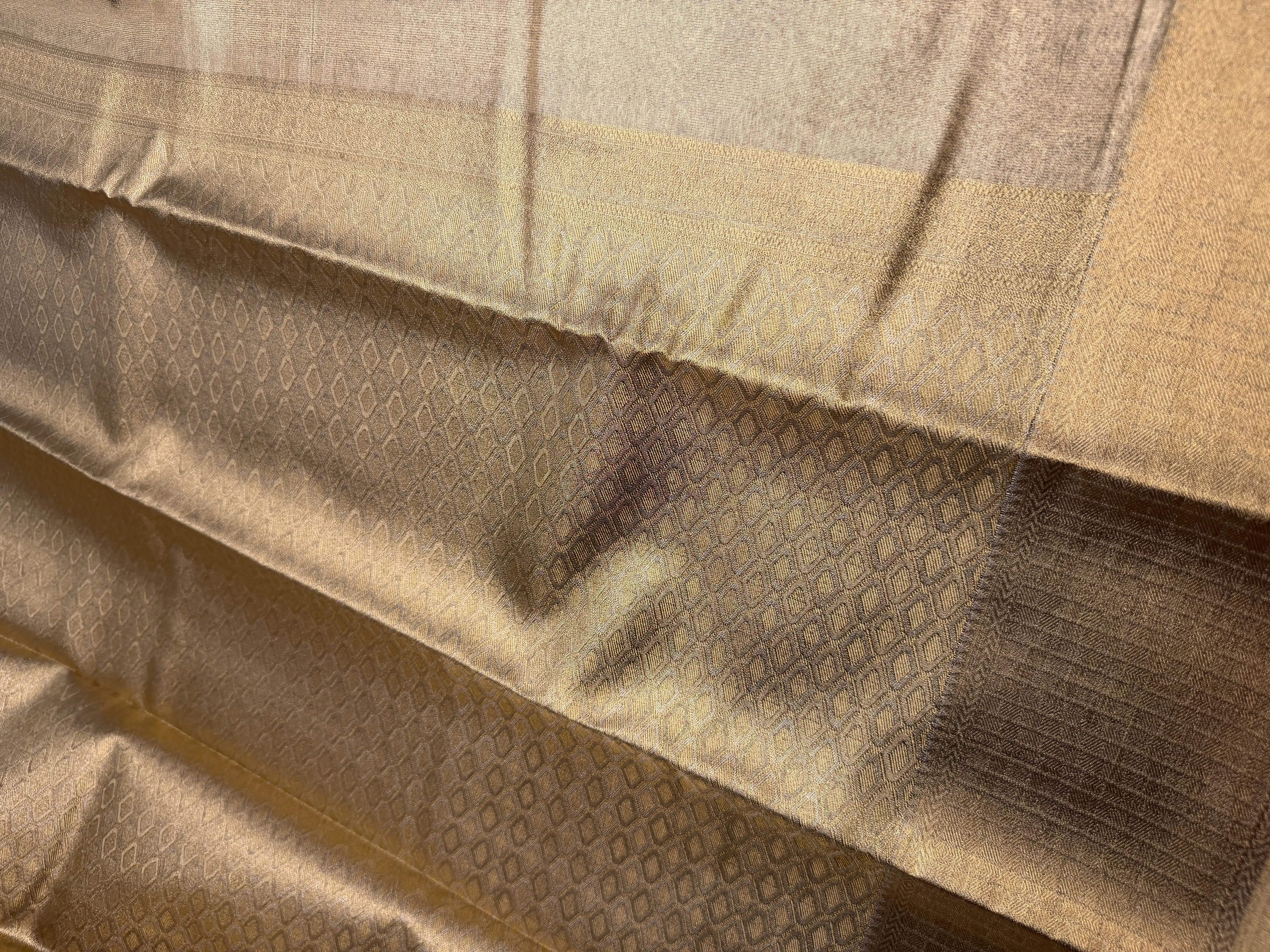This golden semi-silk saree features an exquisite jaal pattern woven gracefully across the body, showcasing intricate craftsmanship and timeless artistry. The soft sheen and fluid drape of semi-silk enhance the richness of the gold tone, creating a look of refined luxury.