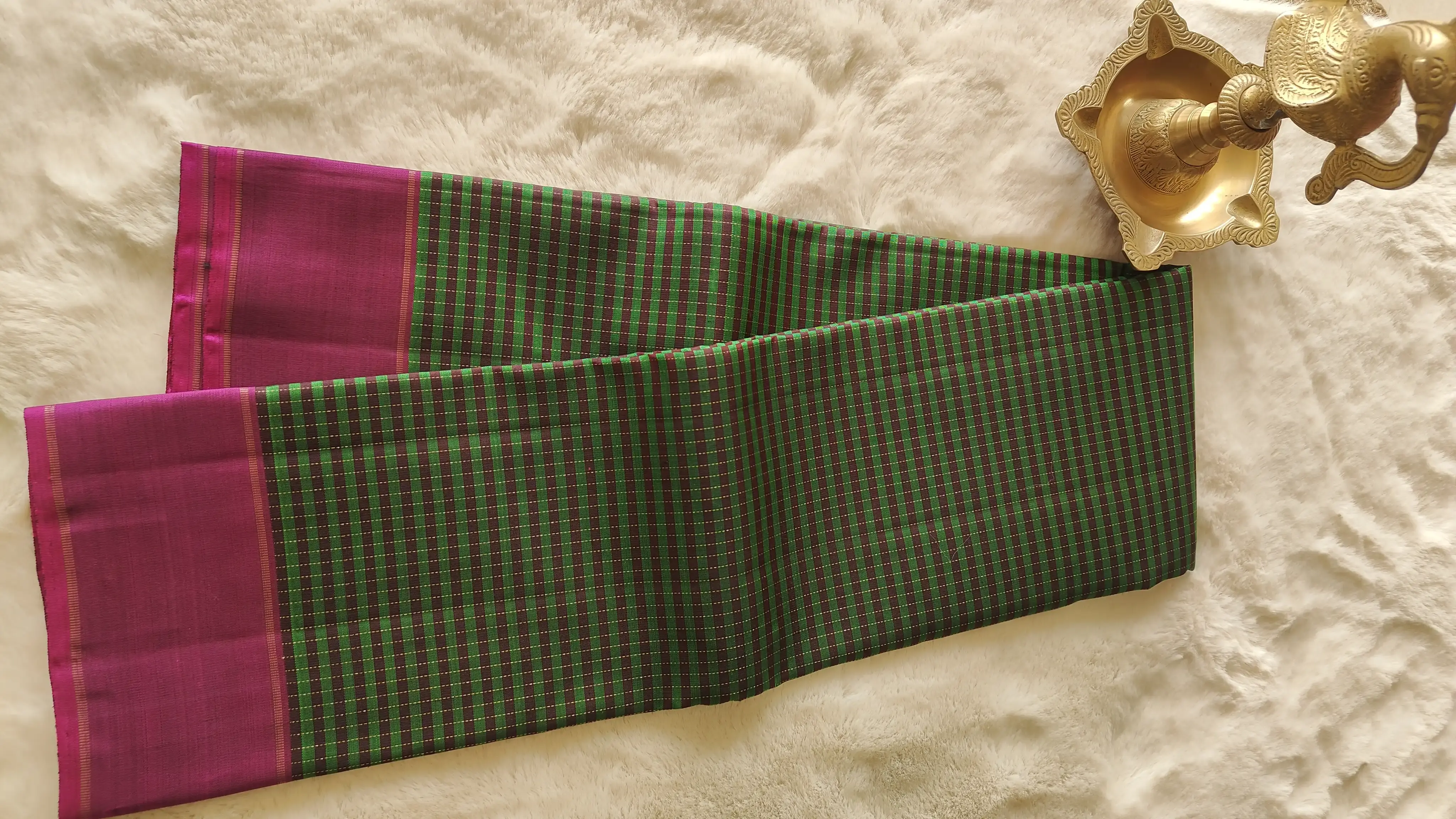 A refined play of color and texture, this saree features an elegant green and chocolate brown checks pattern woven across the body, exuding timeless charm. Framed with a plain pink border and finished with a richly woven pallu, this drape blends classic tradition with understated luxury—perfect for festive and celebratory occasions.