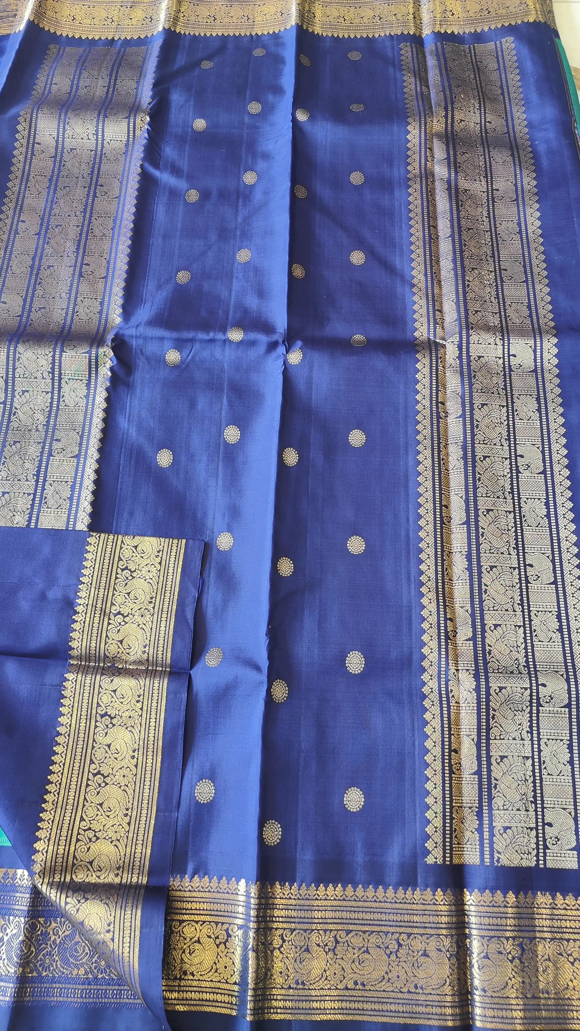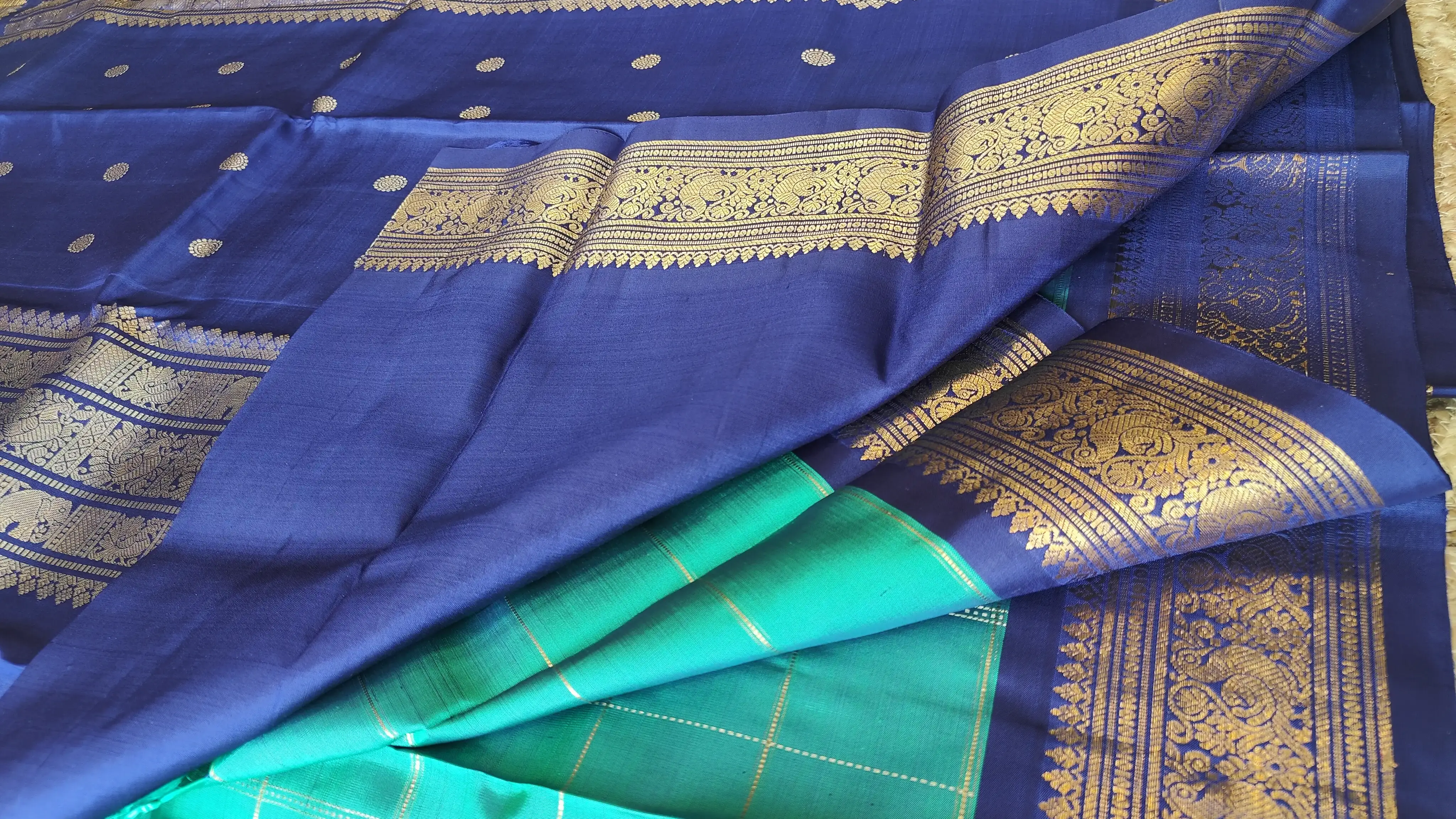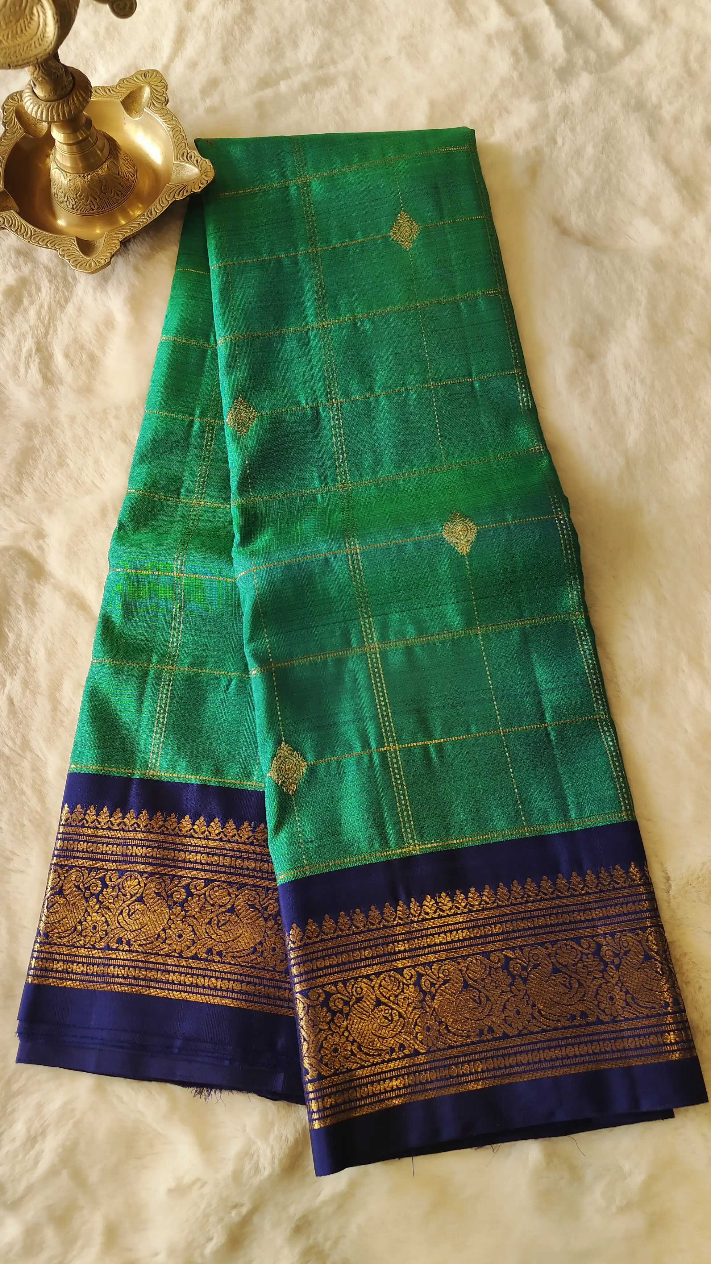 Green checks with navy blue contrast Pure kanchipuram silk saree