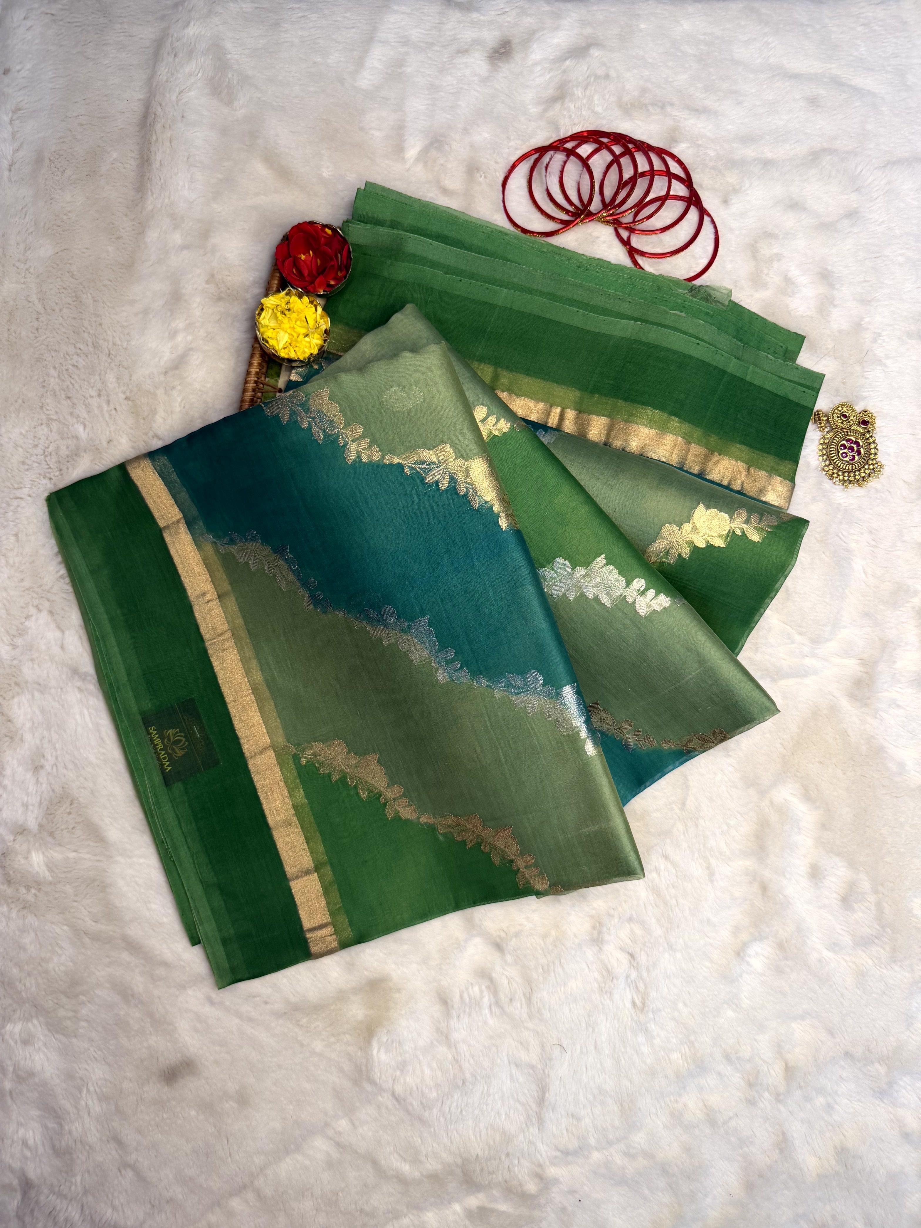 Green Lehariya pattern pure kora organza saree