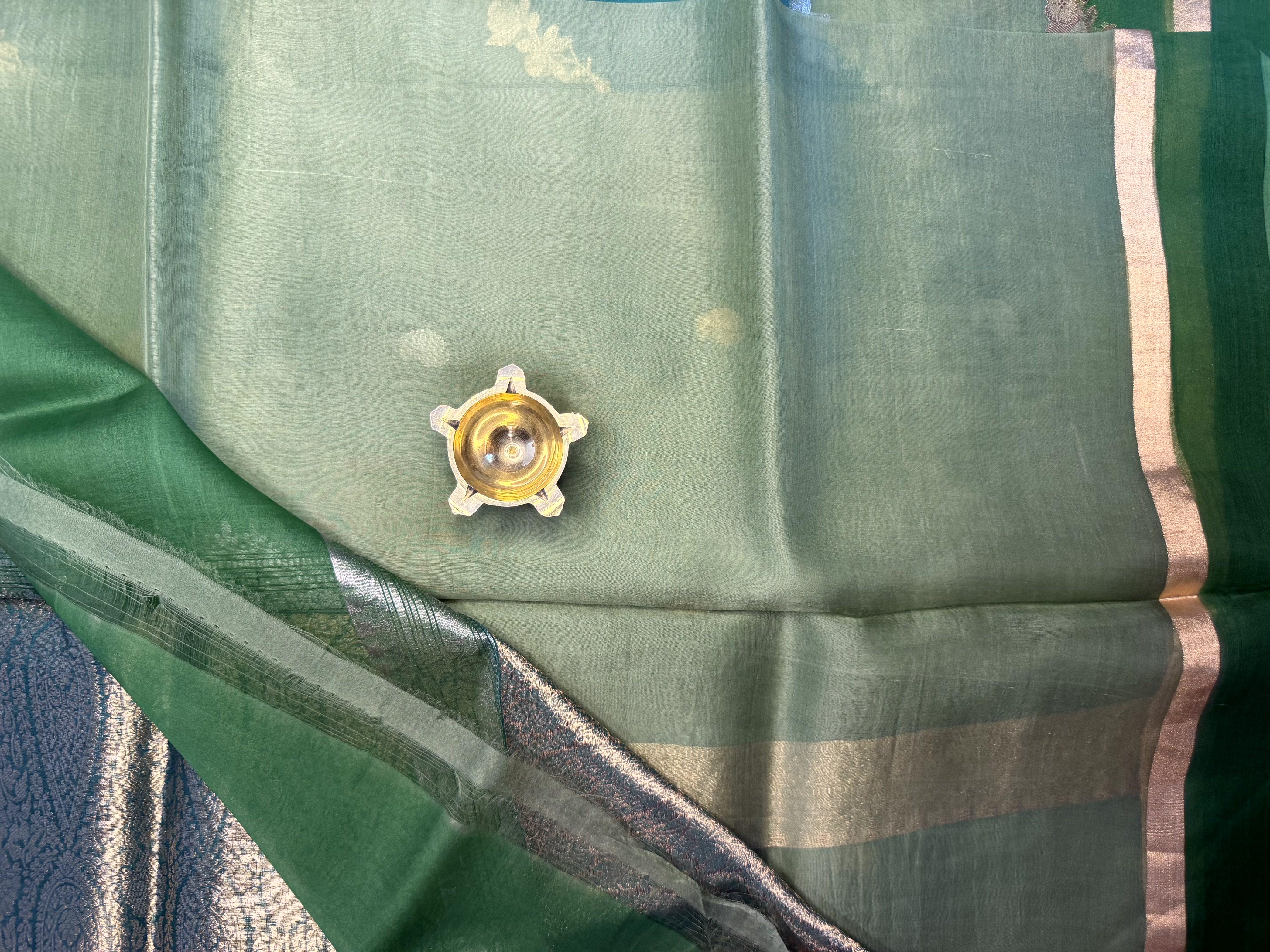 This Green pure Kora Organza saree features a graceful Lehariya pattern, creating wave-like textures across its airy and translucent body.