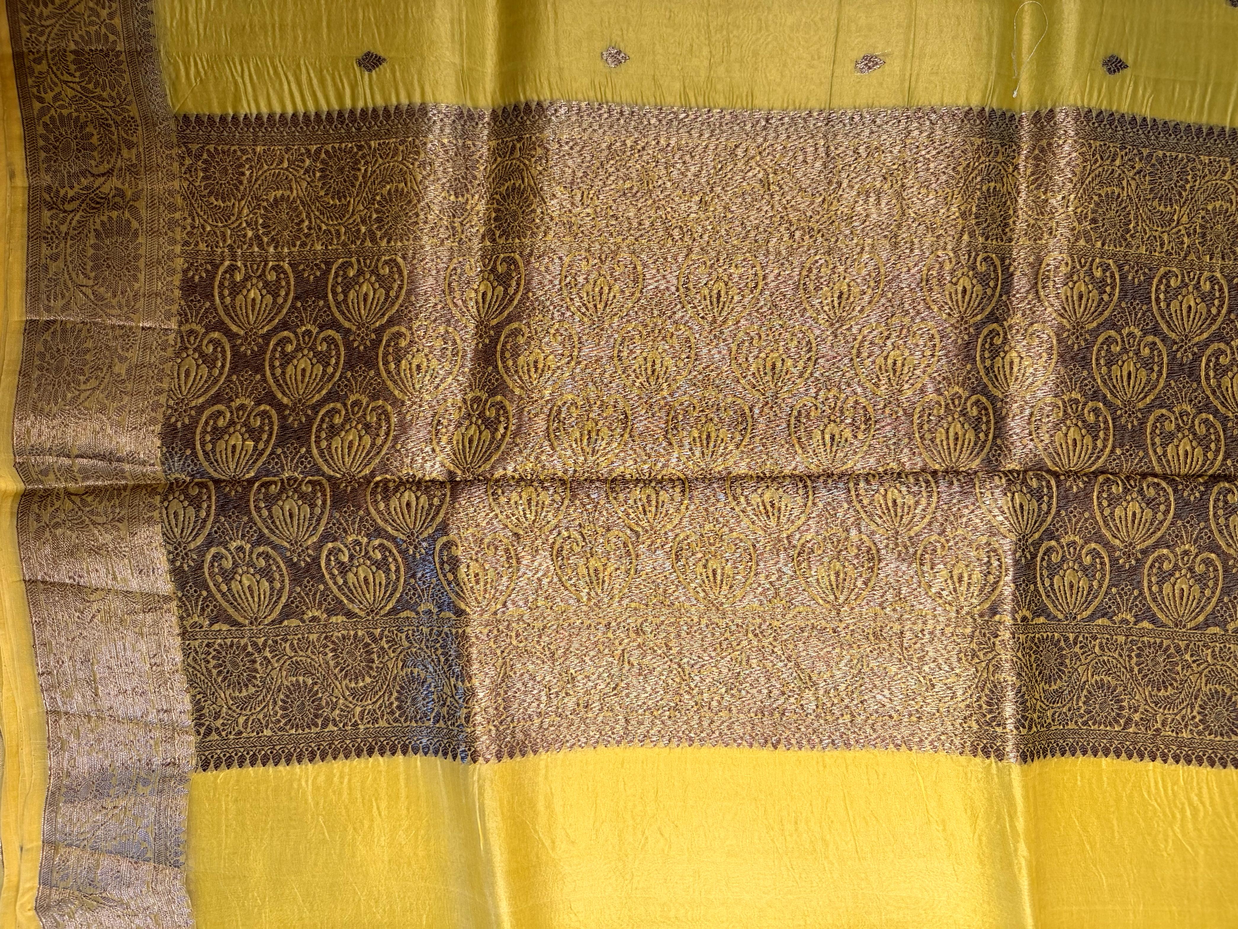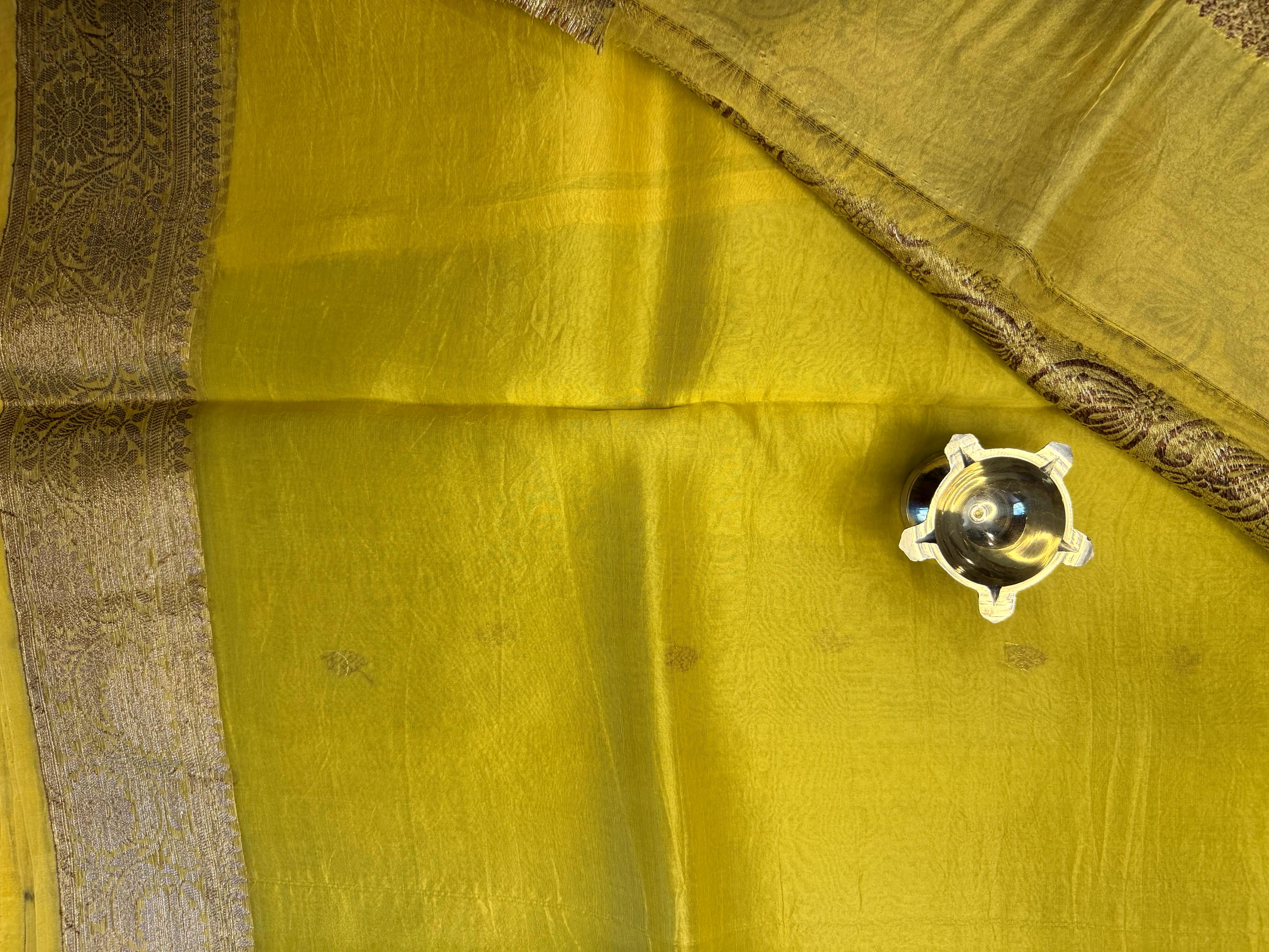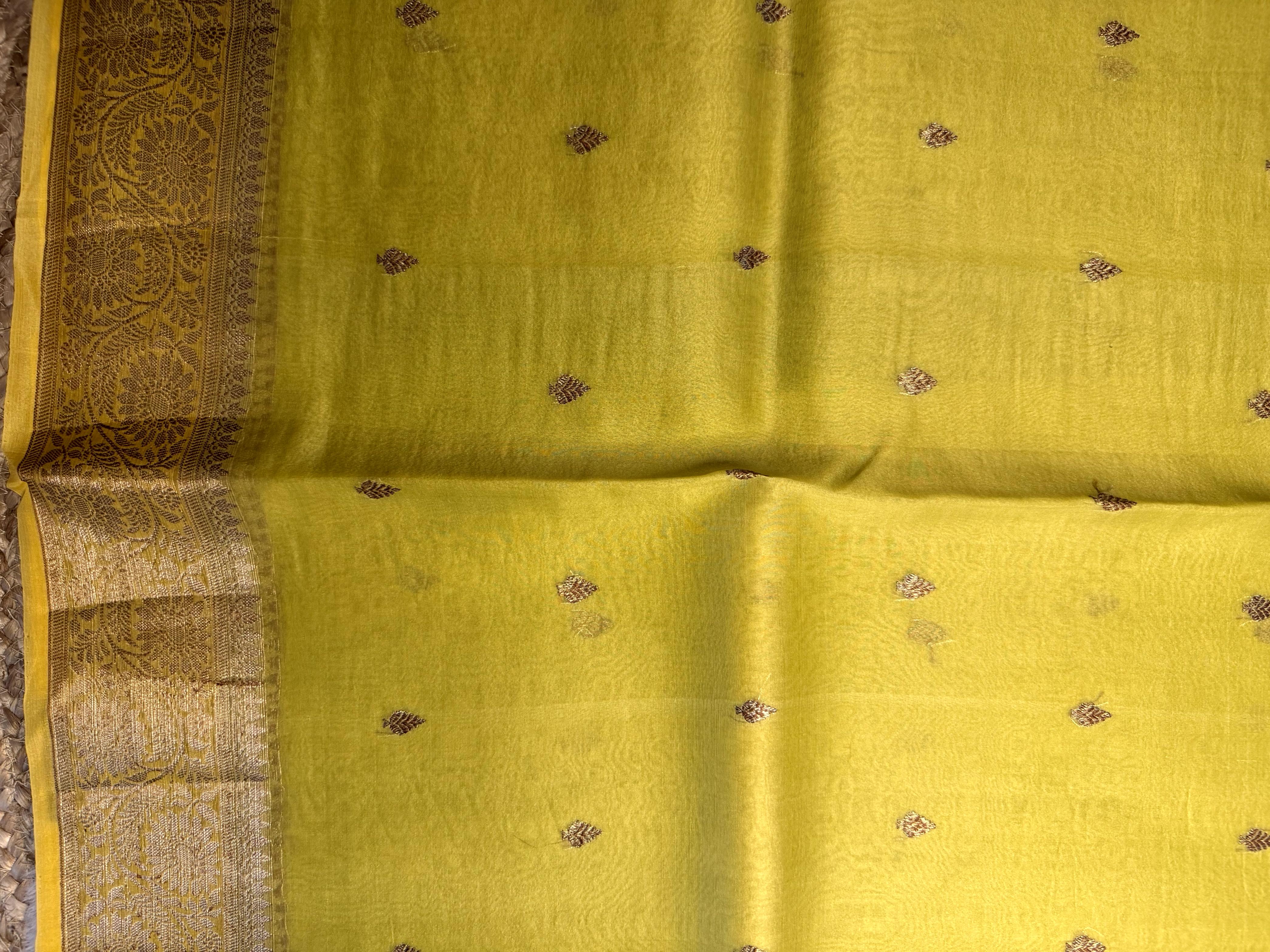 Experience understated luxury with this pure kora organza saree featuring a serene green body that carries a soft, translucent texture unique to organza. The contrasting yellow border adds a vibrant pop, enhanced with antique zari that lends an elegant vintage glow.