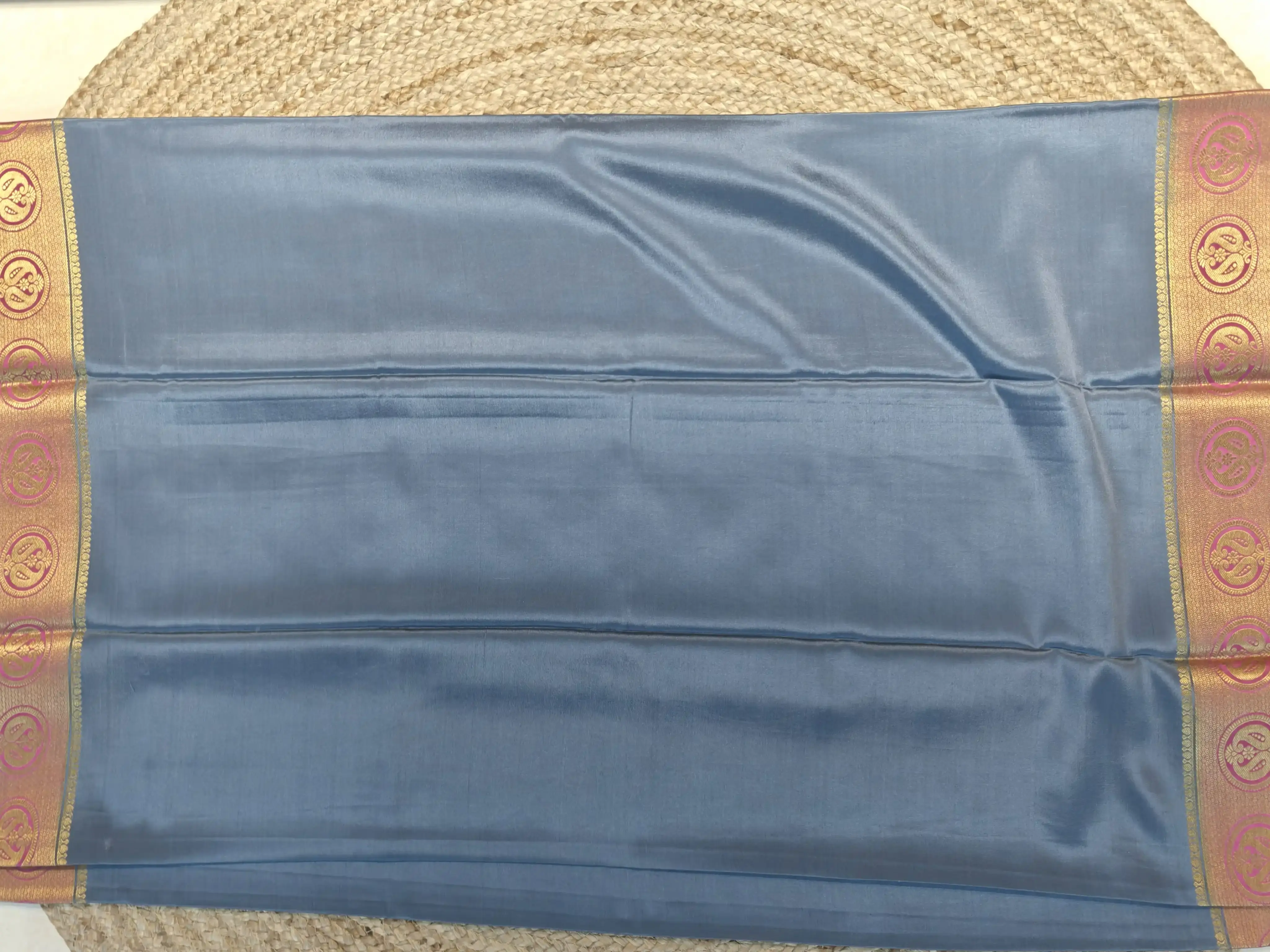 A pure crepe silk saree (120 GSM) with a plain grey body, finished with a graceful pink border and a rich pallu for that perfect touch of tradition. Lightweight, fluid, and timeless—made for effortless sophistication.