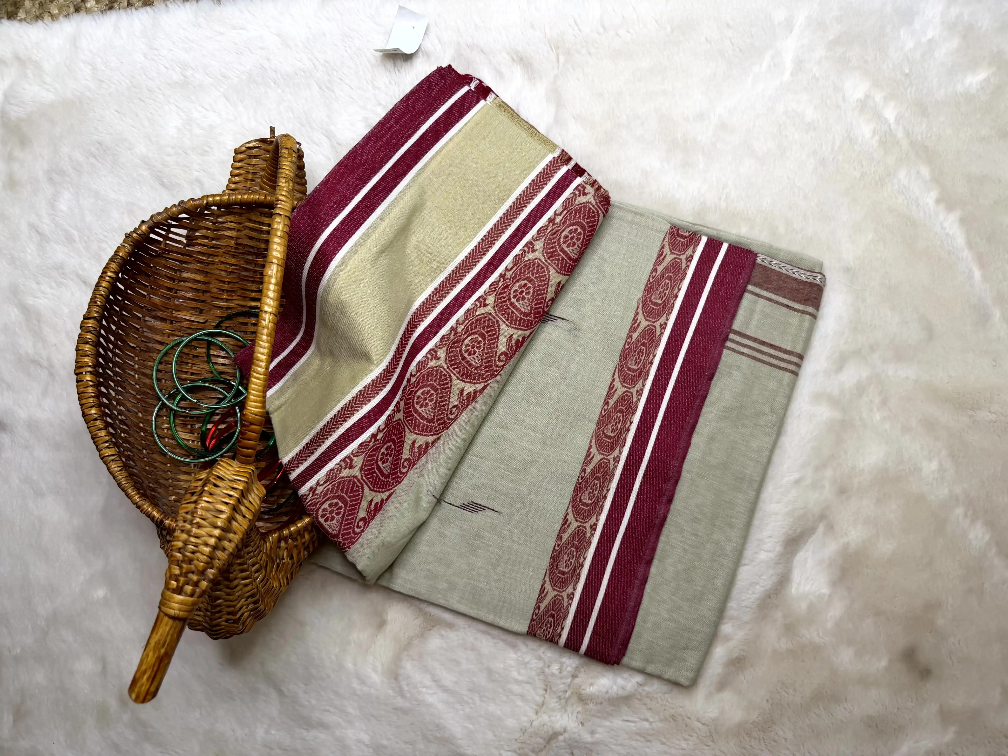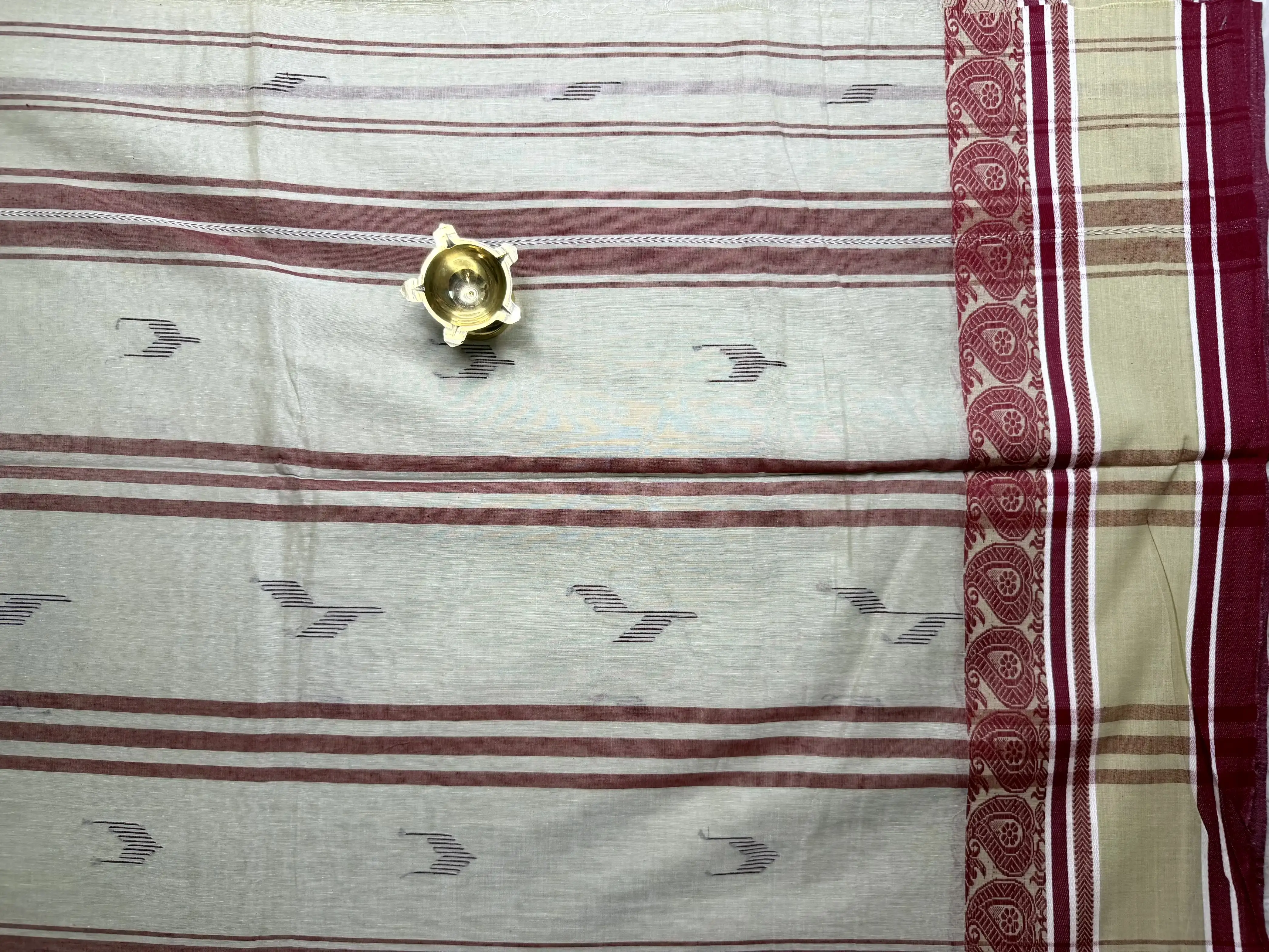 This grey Dhaniakhali cotton saree comes alive with a bold red bentex border, creating a beautiful balance of muted elegance and vibrant accent. The soft cotton weave makes it breathable and easy to carry, while the bentex border adds that classic Dhaniakhali identity.