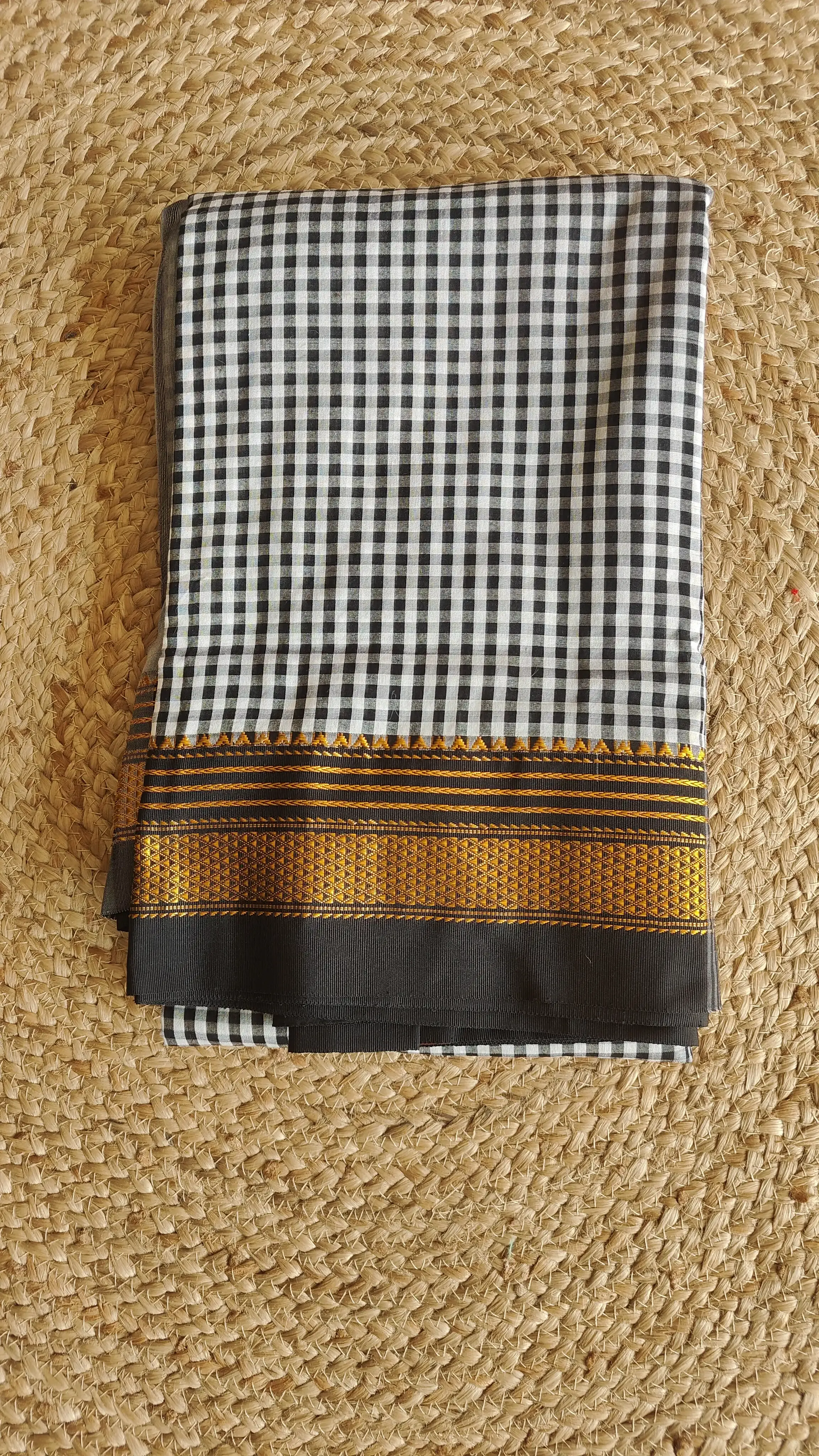 Striking in its simplicity, this black and white checked Ilakal saree is a study in balance and restraint. Handwoven with precision, the classic checks create a bold yet refined rhythm, complemented by the signature Ilakal border and pallu.