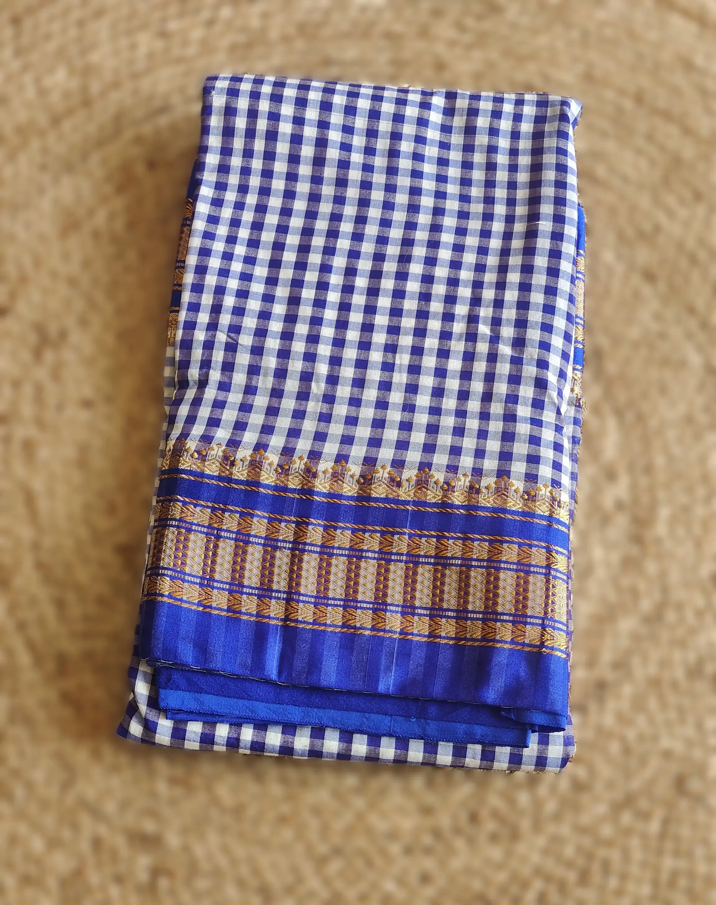 Striking in its simplicity, this black and white checked Ilakal saree is a study in balance and restraint. Handwoven with precision, the classic checks create a bold yet refined rhythm, complemented by the signature Ilakal border and pallu.