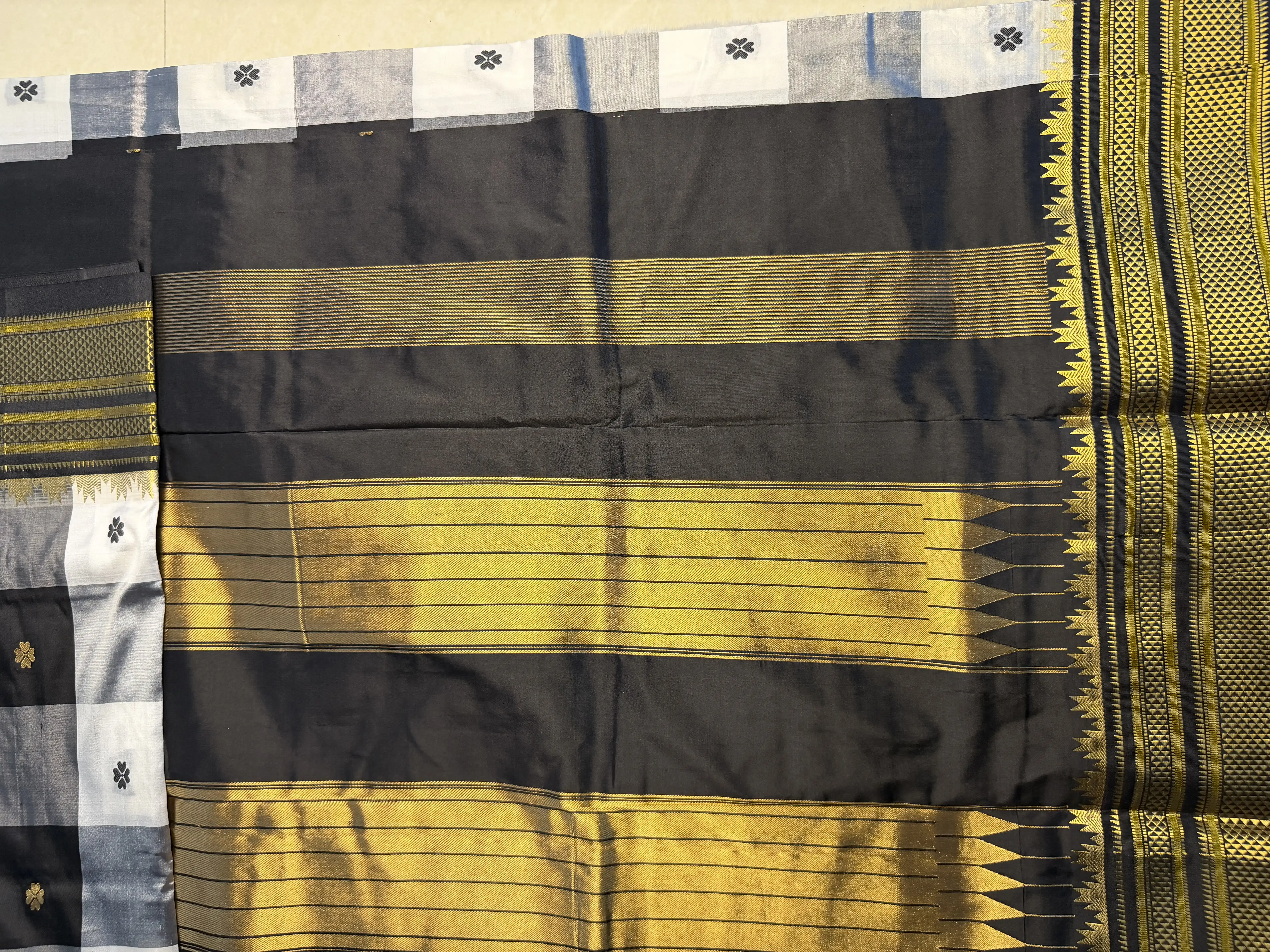 A timeless Ilakal silk saree in classic black and white checks, delicately accented with subtle gold floral motifs. Elegant, balanced, and rooted in tradition—crafted for understated sophistication and everyday luxury.