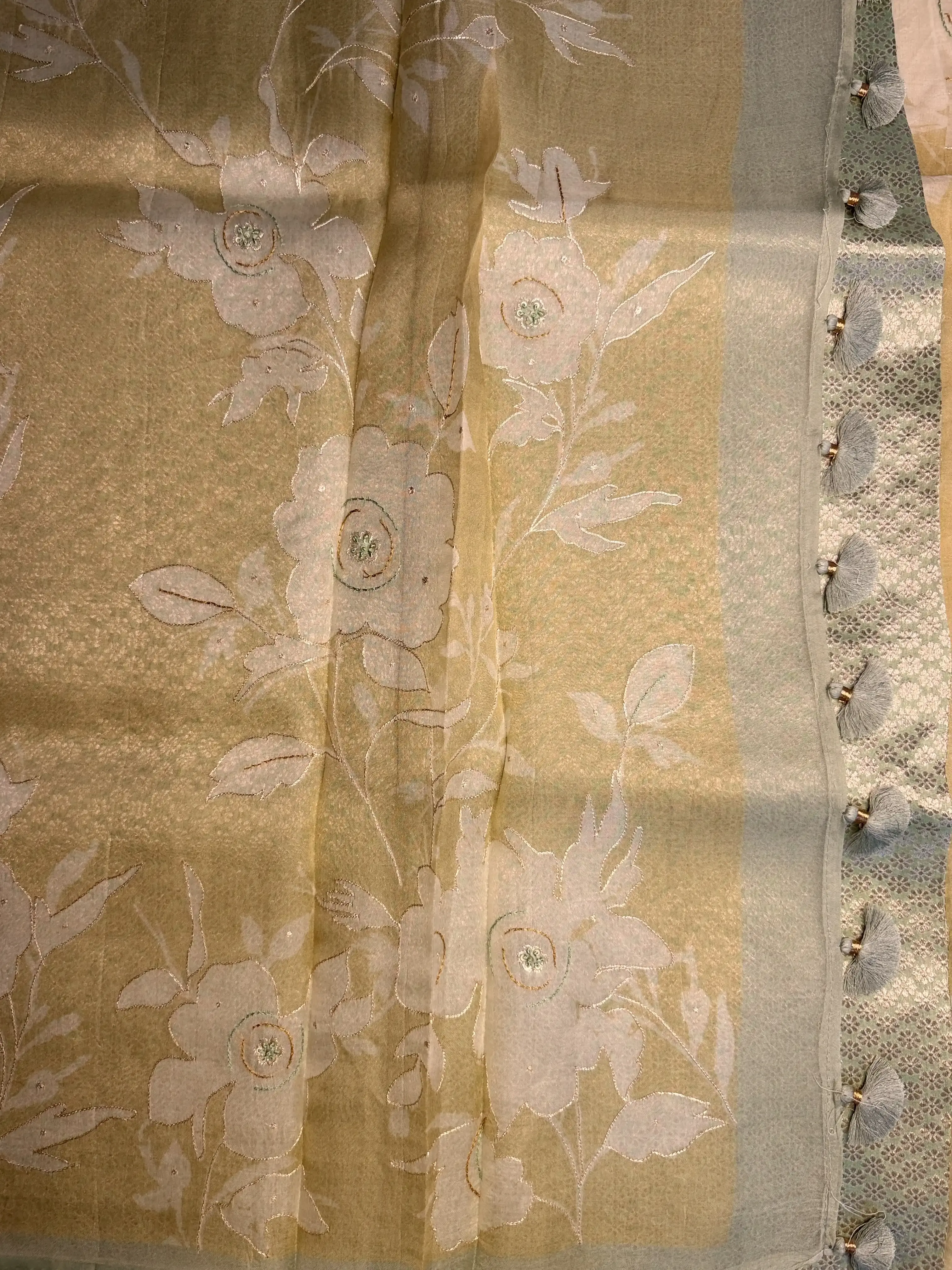 This organza saree blends refreshing lemon yellow and mint green tones, creating a light, airy look that feels effortlessly elegant. The sheer texture and soft sheen of organza add a delicate charm, making it perfect for daytime festivities and celebratory moments.