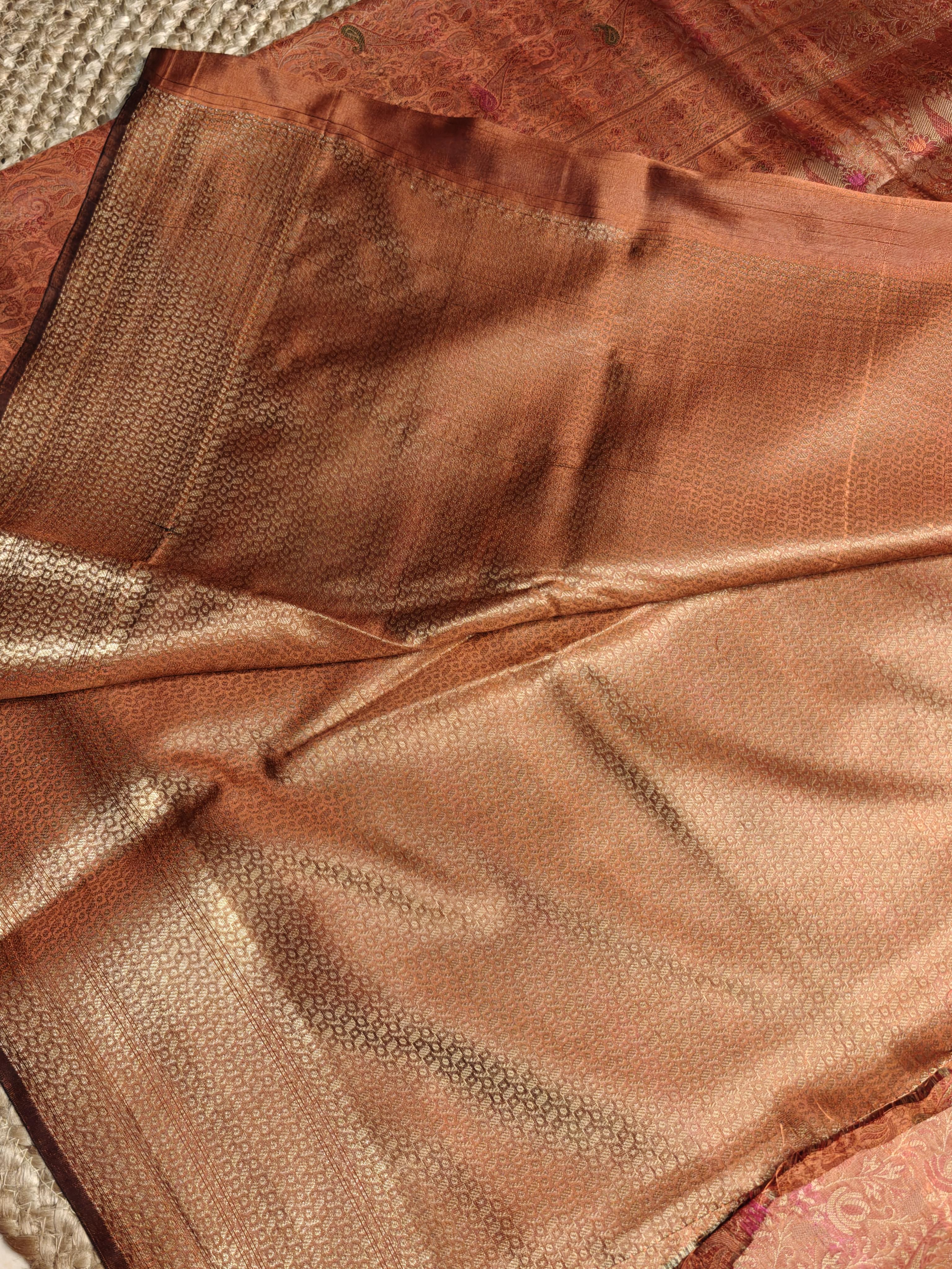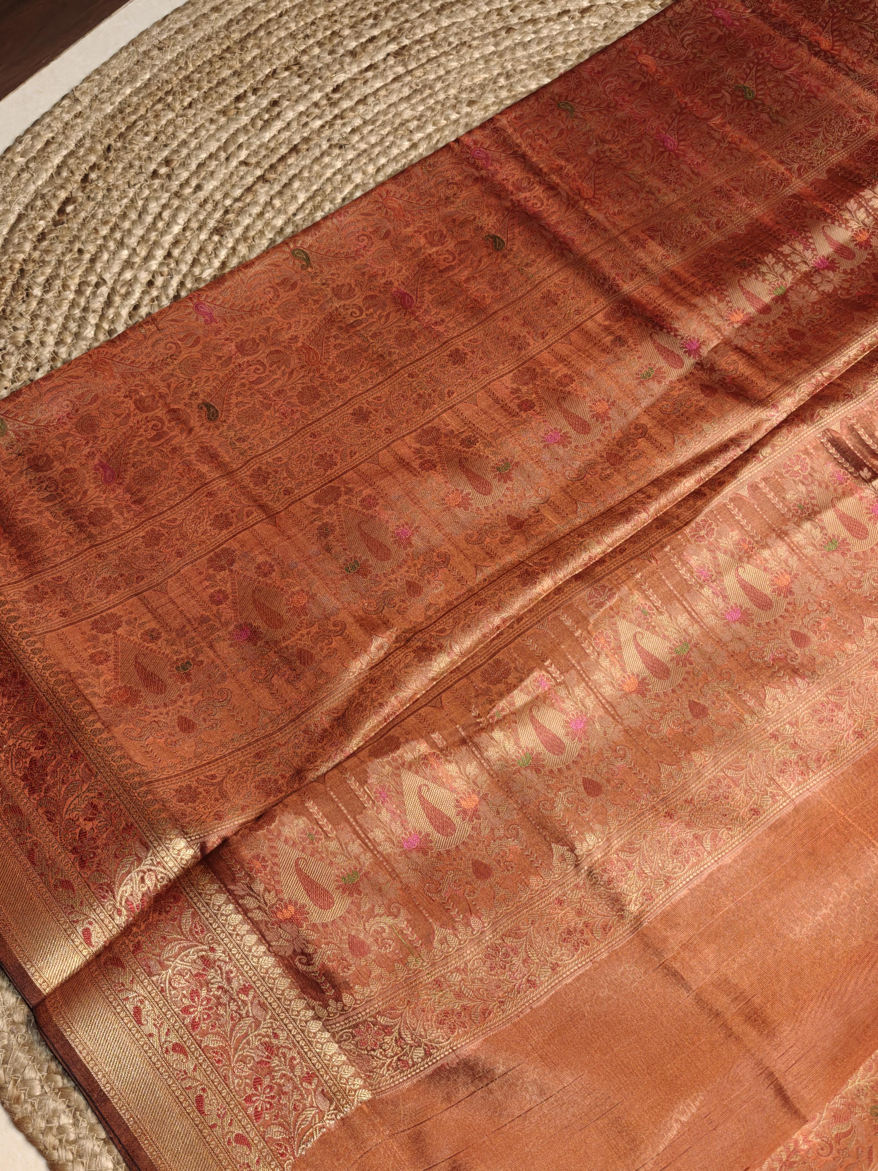Radiate subtle elegance in this Light Orange Meenakari Work Benaras Saree 🧡✨