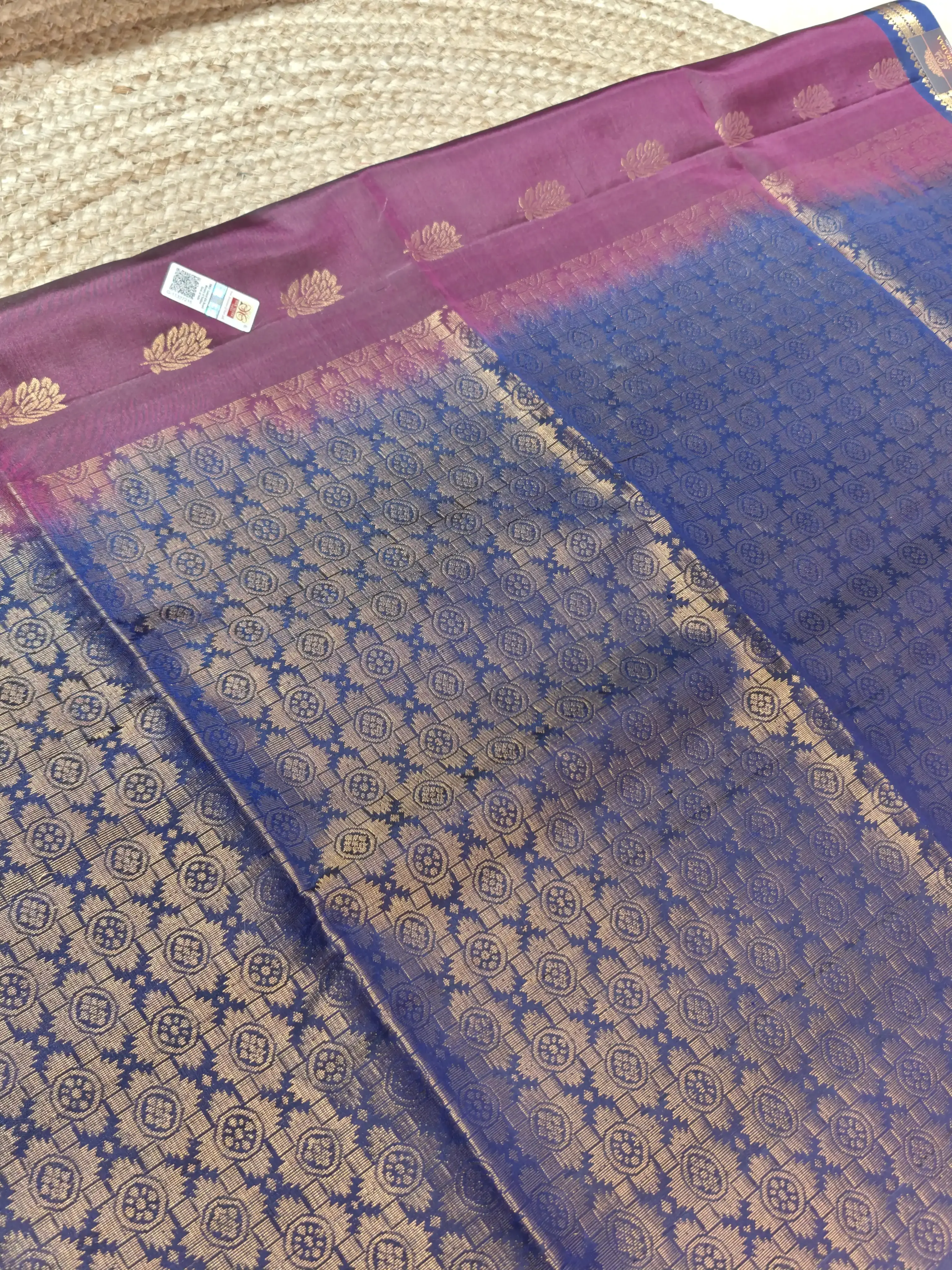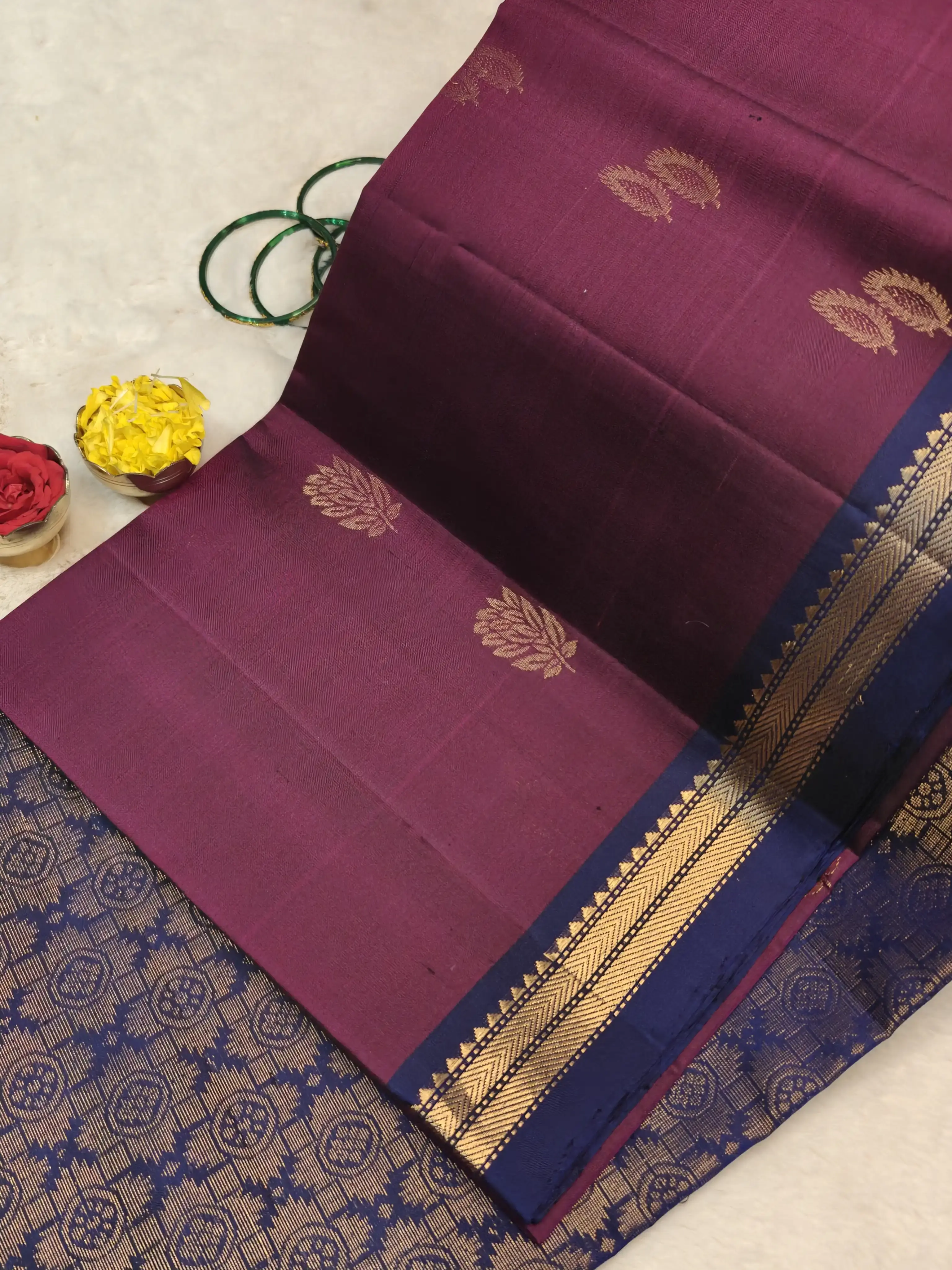This maroon and navy blue soft silk saree features elegant motifs woven all over the body, creating a graceful blend of depth and tradition. A perfect choice for festive moments and classic celebrations ❤️💙