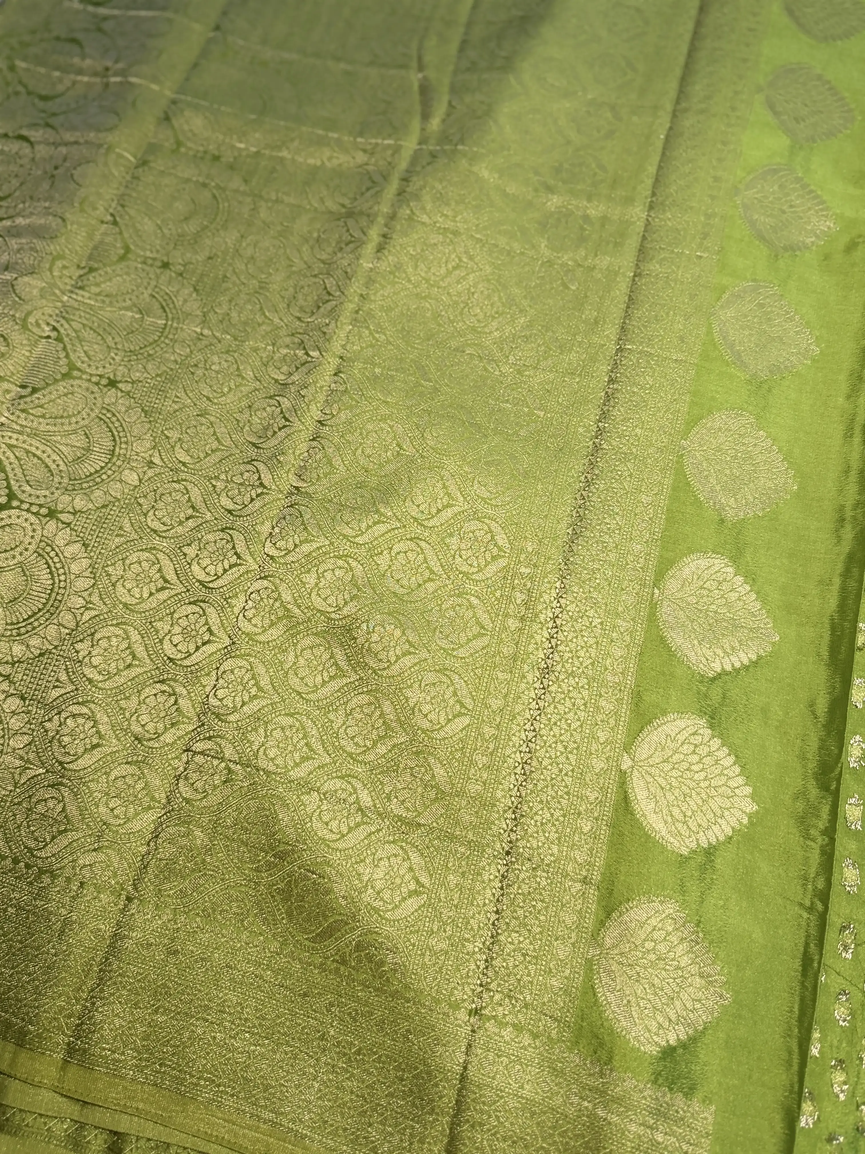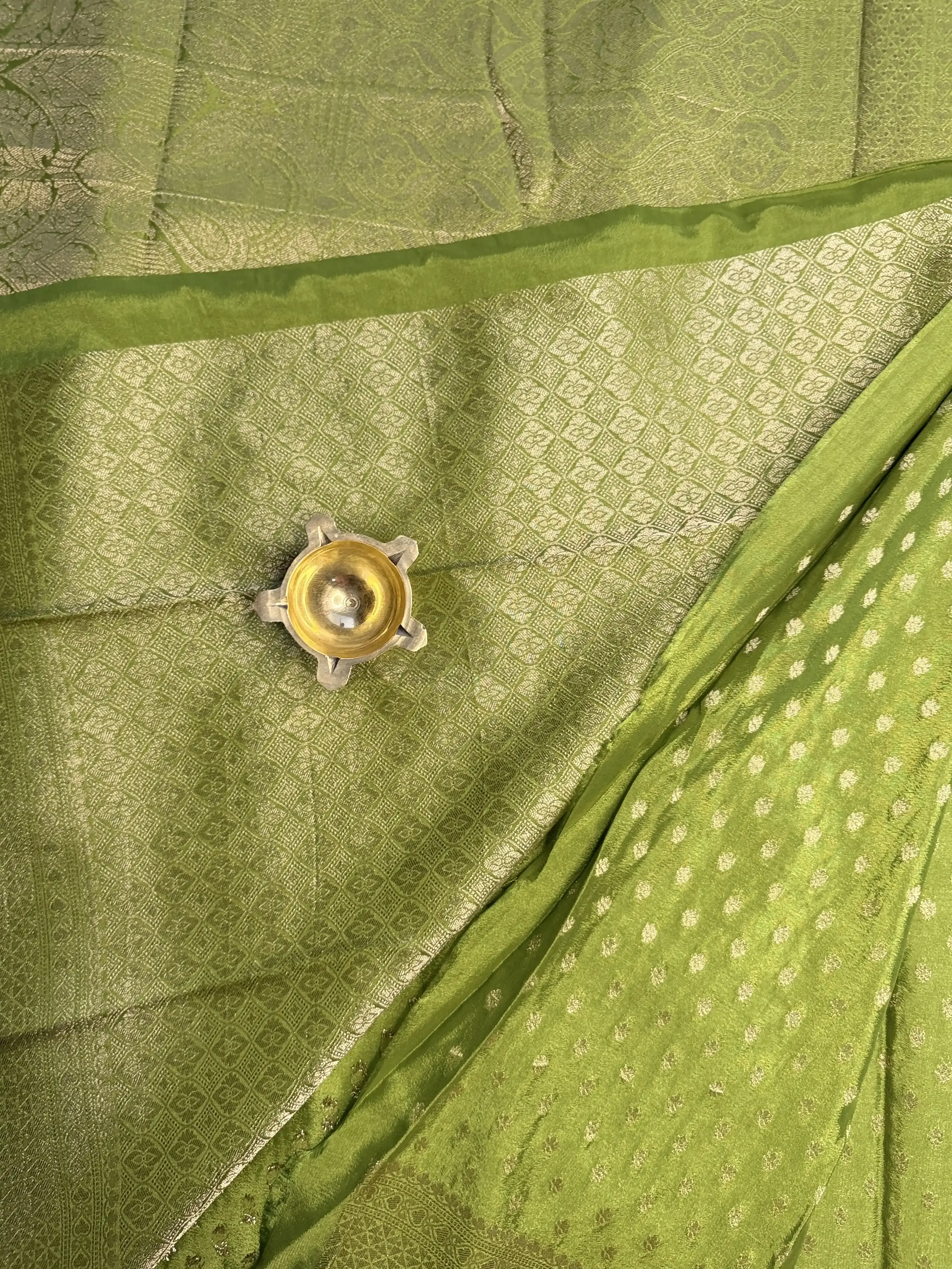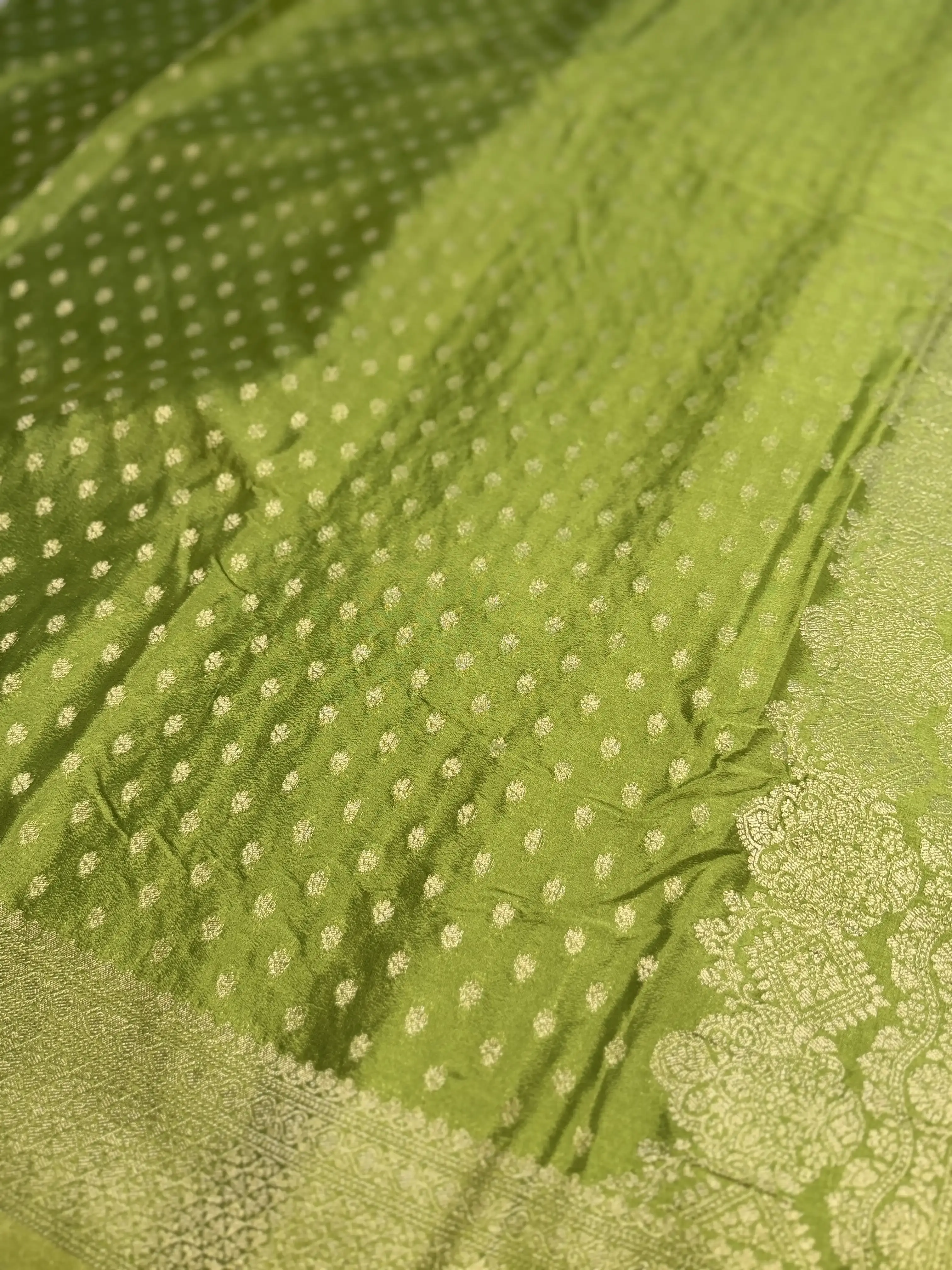 This mehandi green khaddi georgette saree, detailed with delicate small buttas, flows with a graceful drape and an earthy charm—perfect for understated luxury. 💚