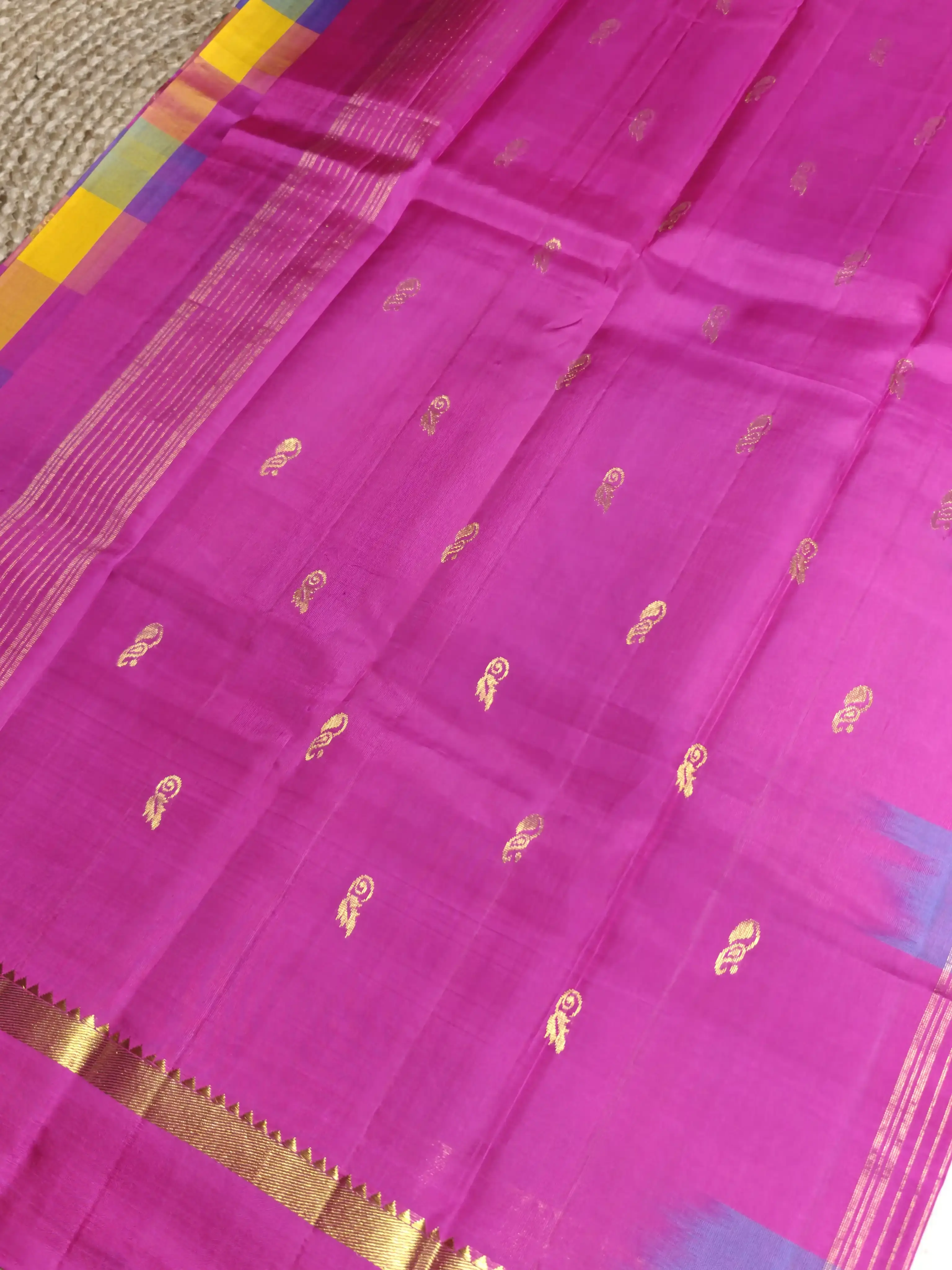 This elegant silk saree with multicoloured checks is beautifully enhanced with delicate small motifs, reflecting classic Indian craftsmanship. The harmonious blend of vibrant hues and subtle detailing creates a graceful, heritage-inspired look. Perfect for festive occasions, temple visits, and cultural celebrations, this saree embodies tradition, warmth, and enduring elegance ✨